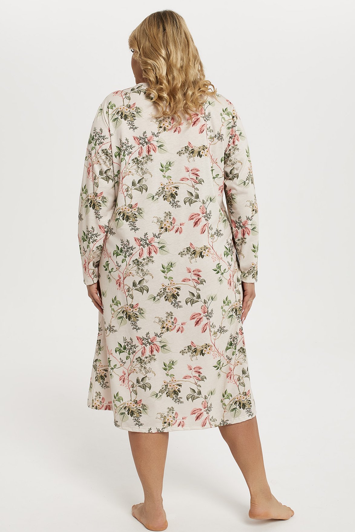 Elegance a komfort v jednom kousku. Krásná noční košilka se vzory květů. Dlouhé rukávy, kulatý dekolt doplněný řasením a malou mašličkou. Délka pod kolena zaručí větší tepelný komfort. Luxusní provedení, ve kterém si budete libovat.