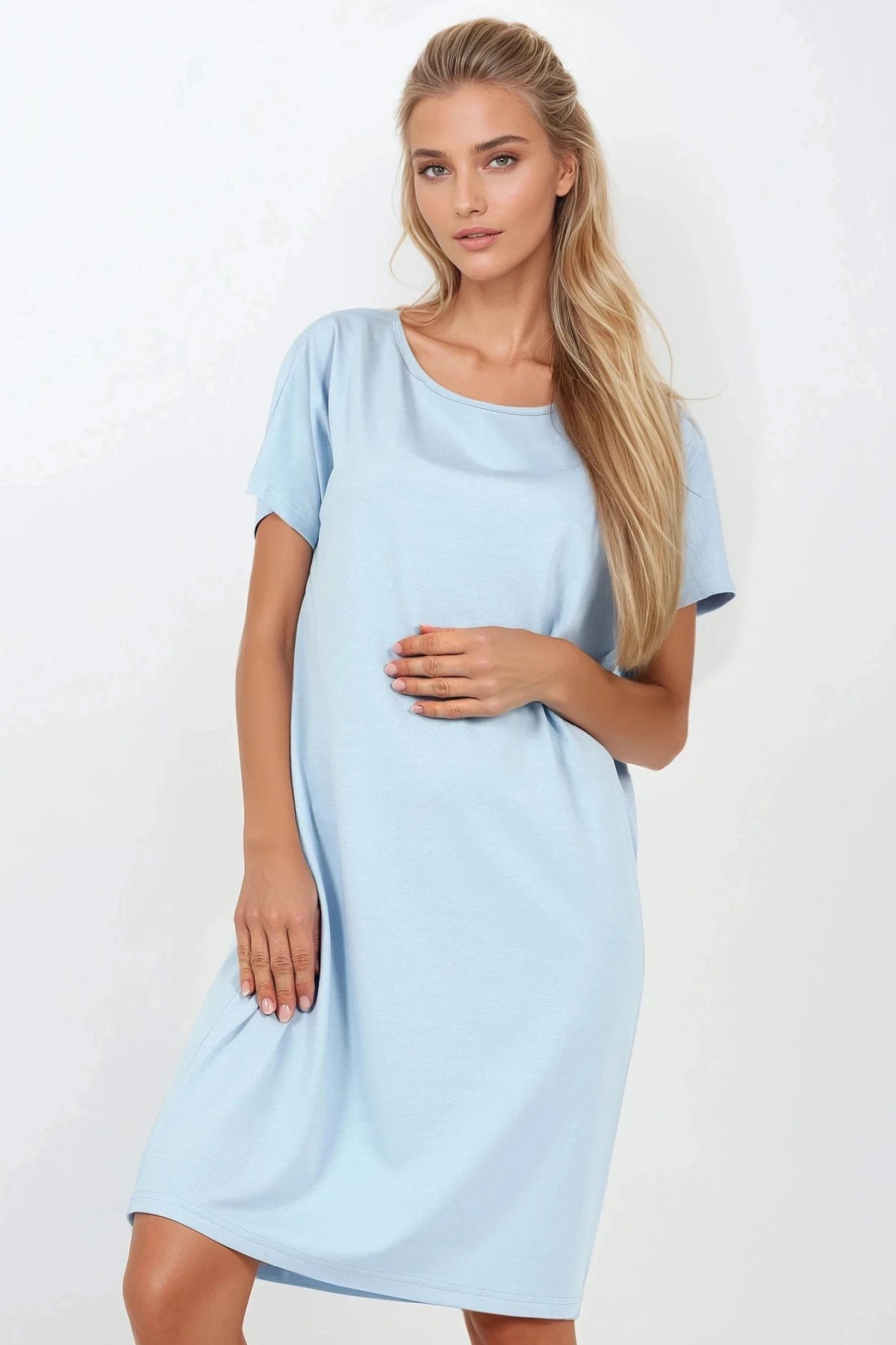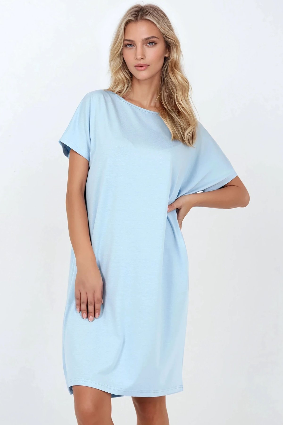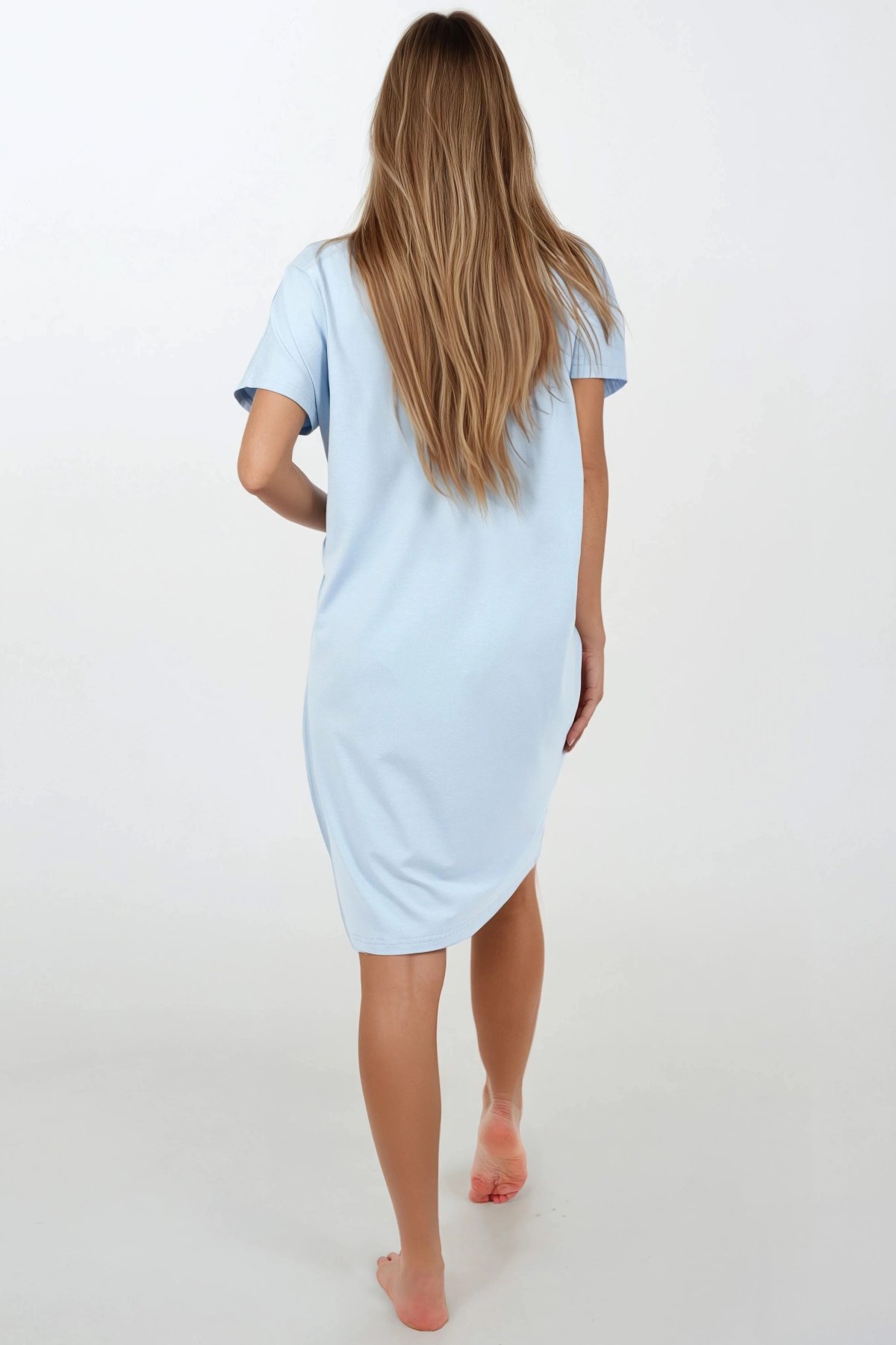 Tato dámská noční košile v jemně modrém odstínu kombinuje minimalistický design s mimořádným komfortem. Vyrobena z viskózy s příměsí elastanu, příjemně přiléhá k tělu, ale zároveň poskytuje volnost pohybu. Krátké rukávy a klasický půlkulatý výstřih dodávají modelu nadčasovou jednoduchost, která lichotí každé postavě. Měkký, prodyšný a hypoalergenní materiál je šetrný i k citlivé pokožce a umožňuje tělu dýchat po celou noc. Díky ležérnímu oversize střihu se v ní budete cítit maximálně pohodlně – ideální volba pro klidný spánek i ranní lenošení.