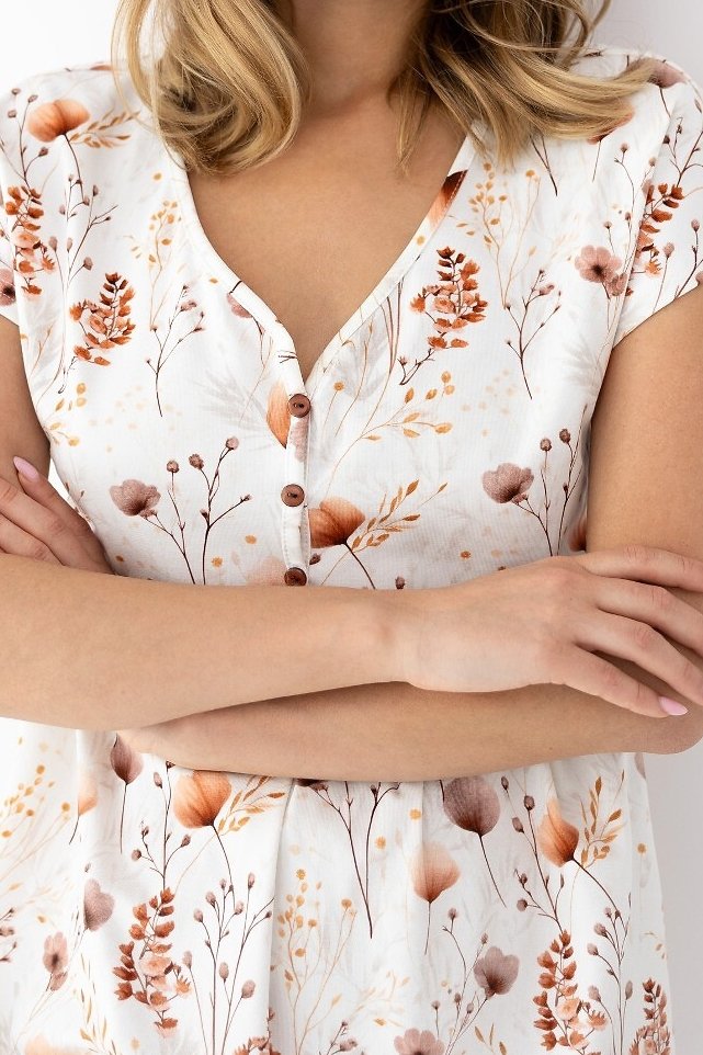Noční košile Arielle je ztělesněním ženskosti, jemnosti a pohodlí. Vyrobena z měkké, pružné bavlny, která příjemně hladí pokožku a zajišťuje komfort po celou noc. Romantický květinový vzor v kombinaci s decentním výstřihem do V a krátkými motýlími rukávy působí velmi elegantně a něžně. Díky zapínání na knoflíčky a lehkému řasení pod prsy se košile dokonale přizpůsobí postavě a poskytuje maximální volnost pohybu. Je ideální i pro kojící maminky – praktická, a přesto krásná. Sensis Arielle je perfektní volbou pro ženy, které chtějí spojit styl a pohodlí v jednom.