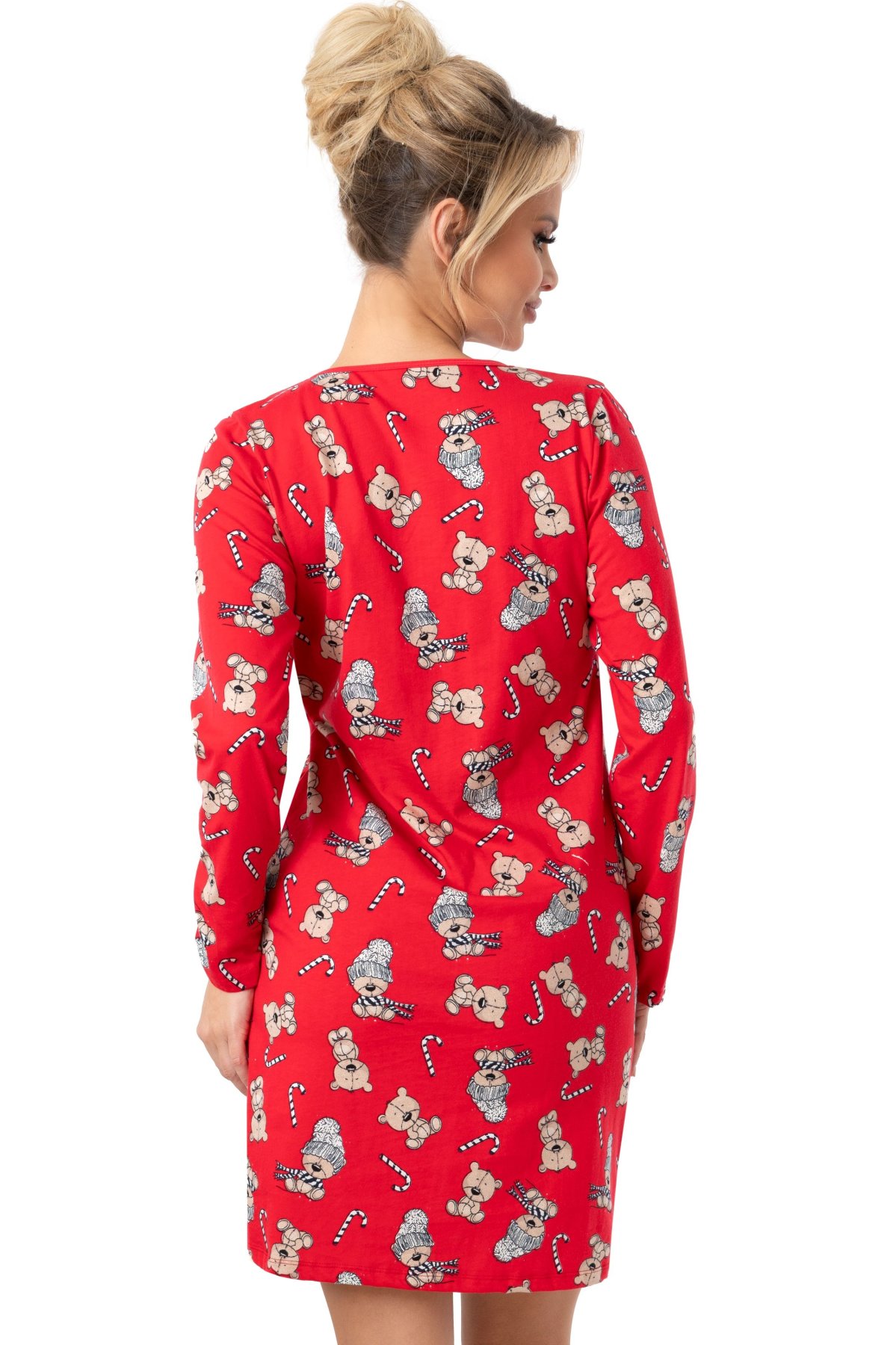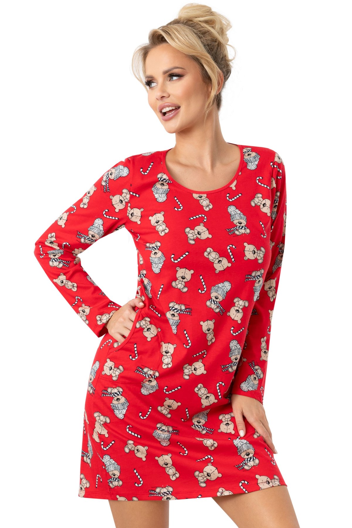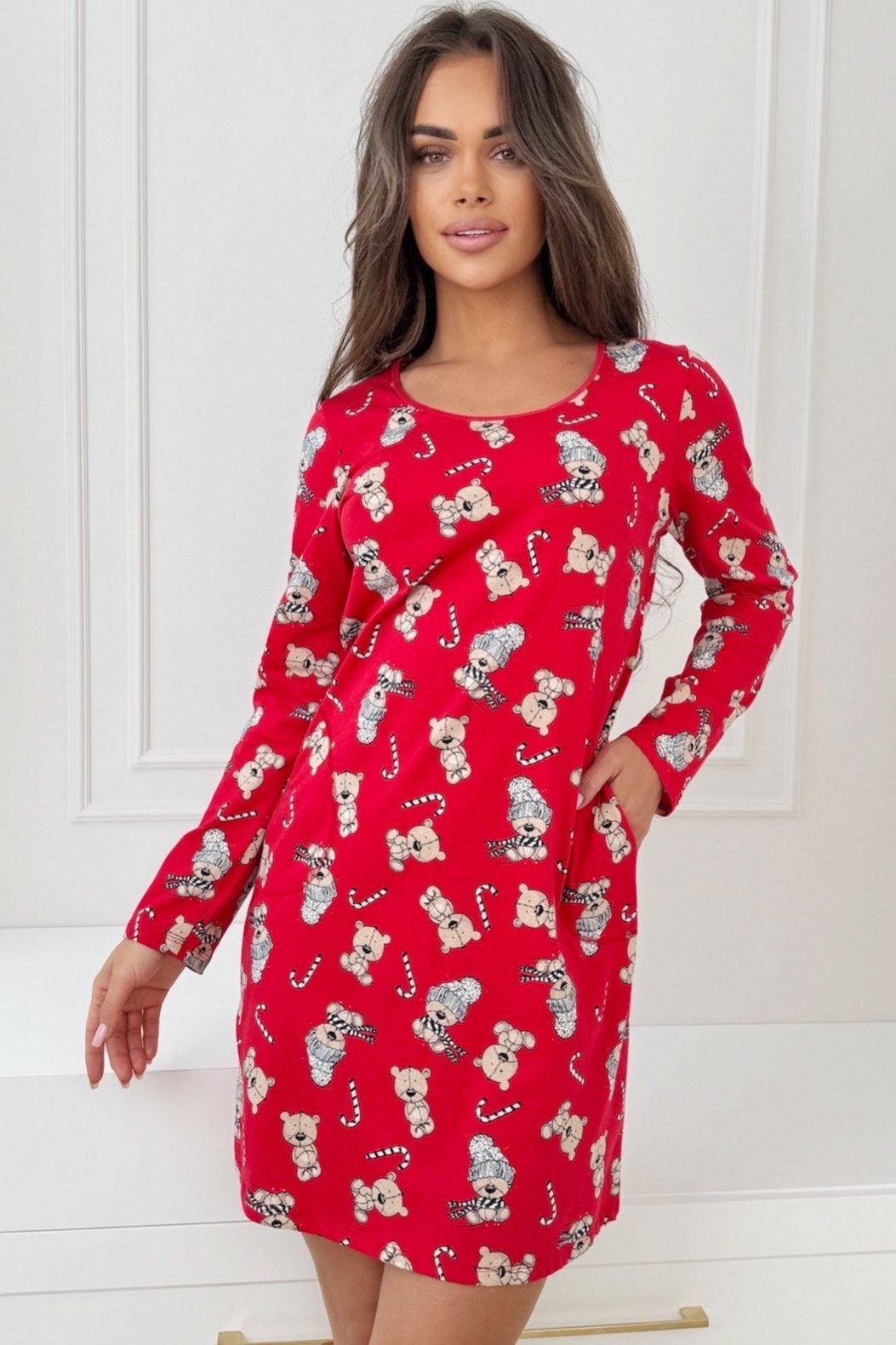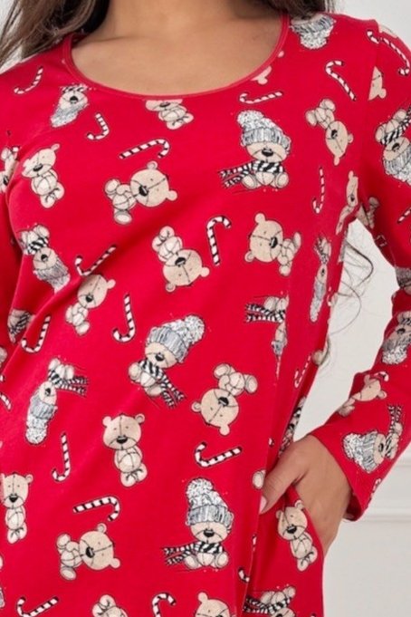 Vánoční noční košile Bear vnese do zimních večerů hravost i útulnost. Ušitá z čisté, prodyšné bavlny, příjemně zahřeje a zajistí komfort po celou noc. Dlouhé rukávy a kulatý výstřih dodávají klasický vzhled, postranní kapsy zvyšují praktičnost modelu. Celoplošný vánoční motiv s medvídkem navodí tu pravou sváteční atmosféru a promění každý večer ve chvilku pohody.