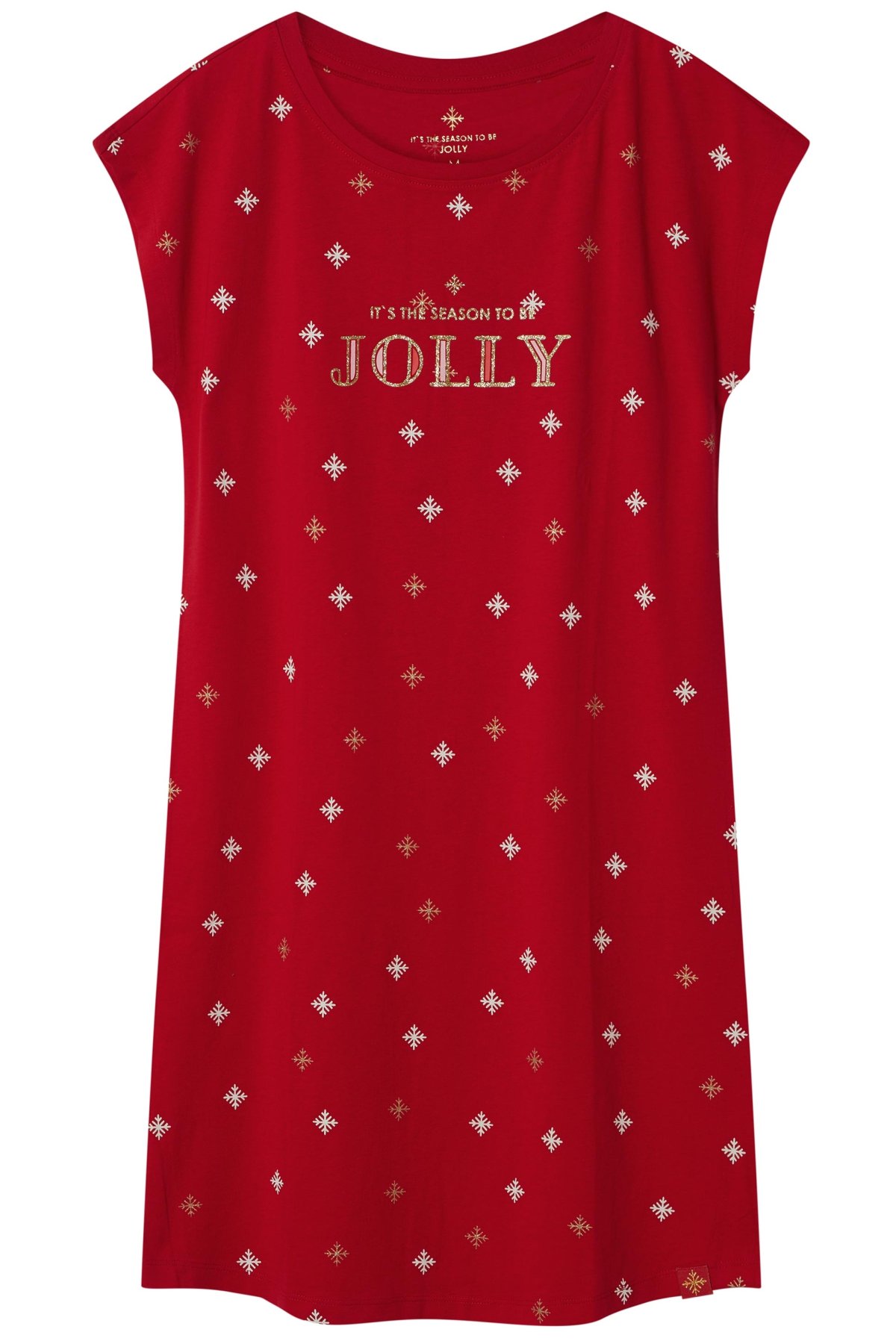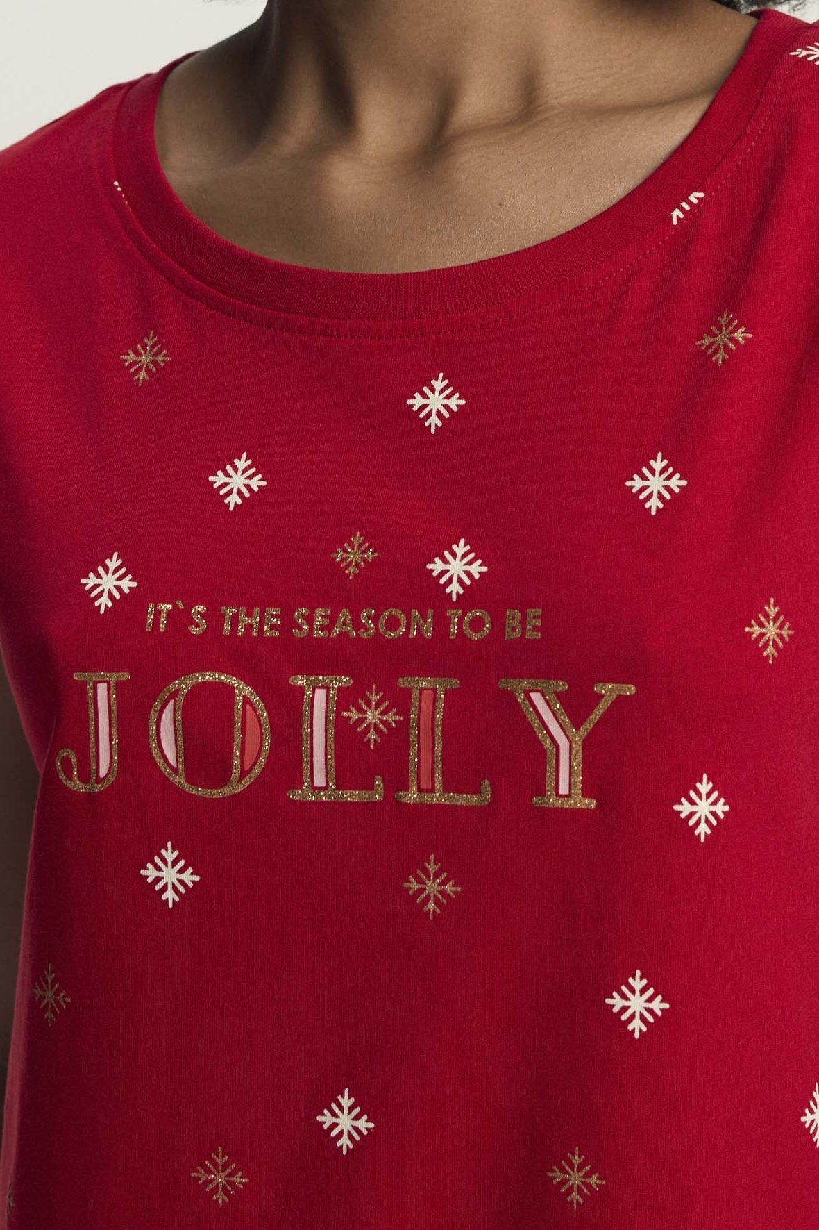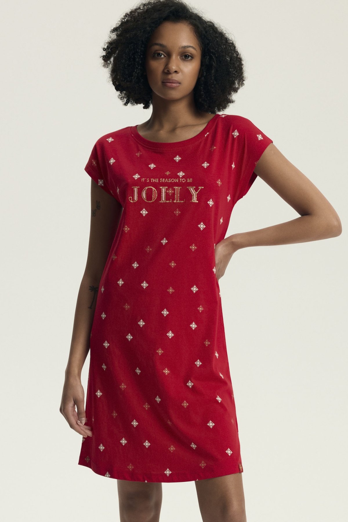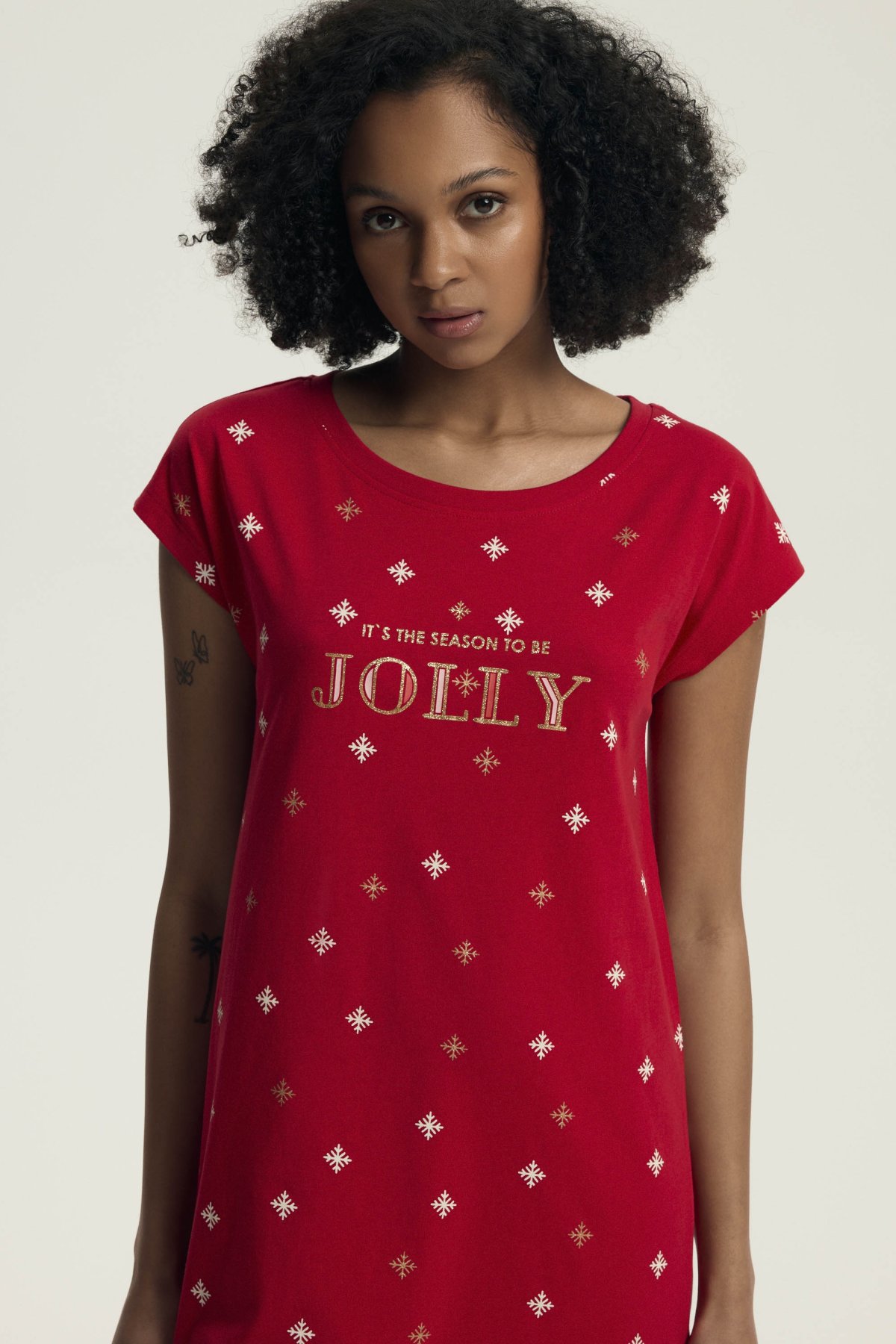 Vyrobena z měkké, prodyšné bavlny, která příjemně hřeje. Potisk se sněhovými vločkami a lesklý zlatý nápis JOLLY vytvářejí hravý, vánočně laděný vzhled. Volný střih s krátkými rukávy a kulatým výstřihem se skvěle přizpůsobí každé postavě.