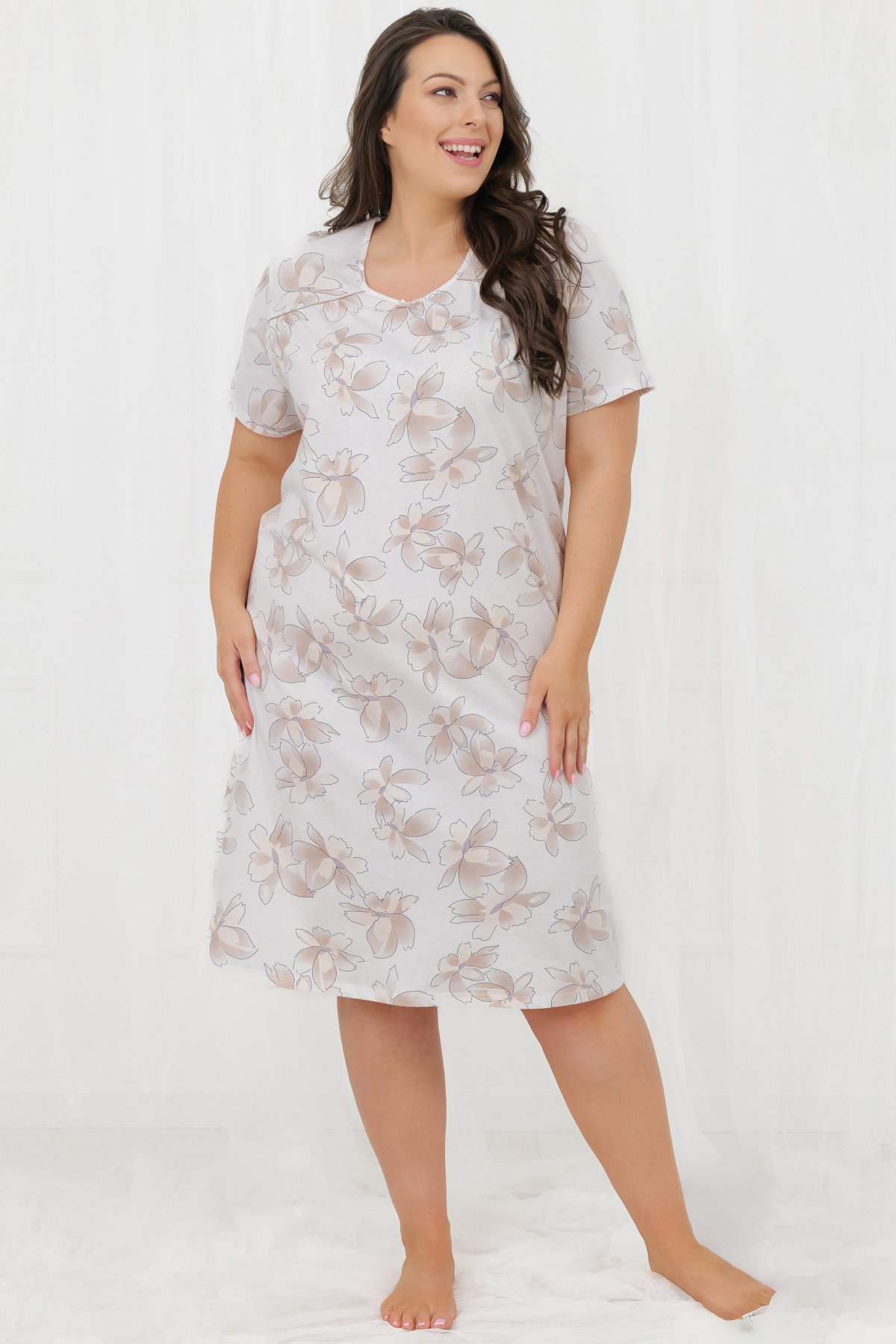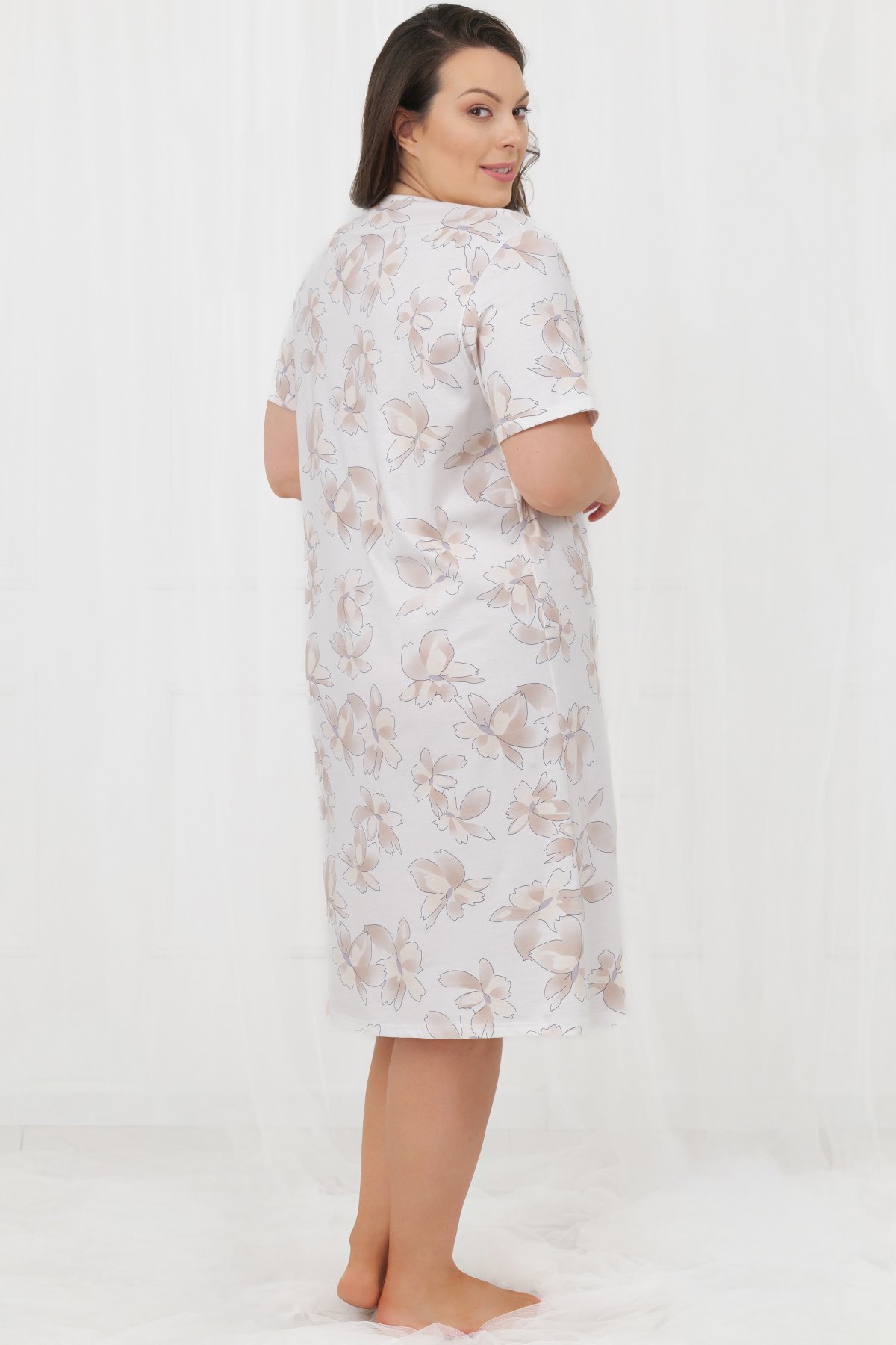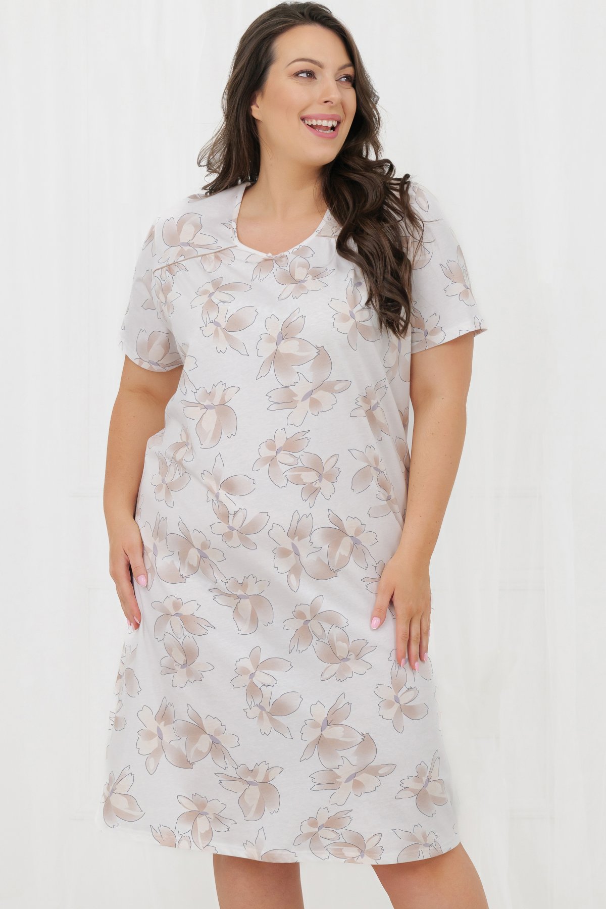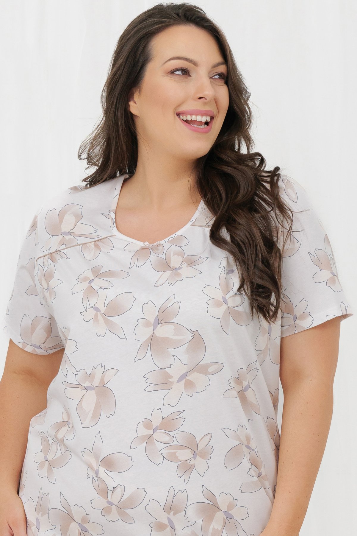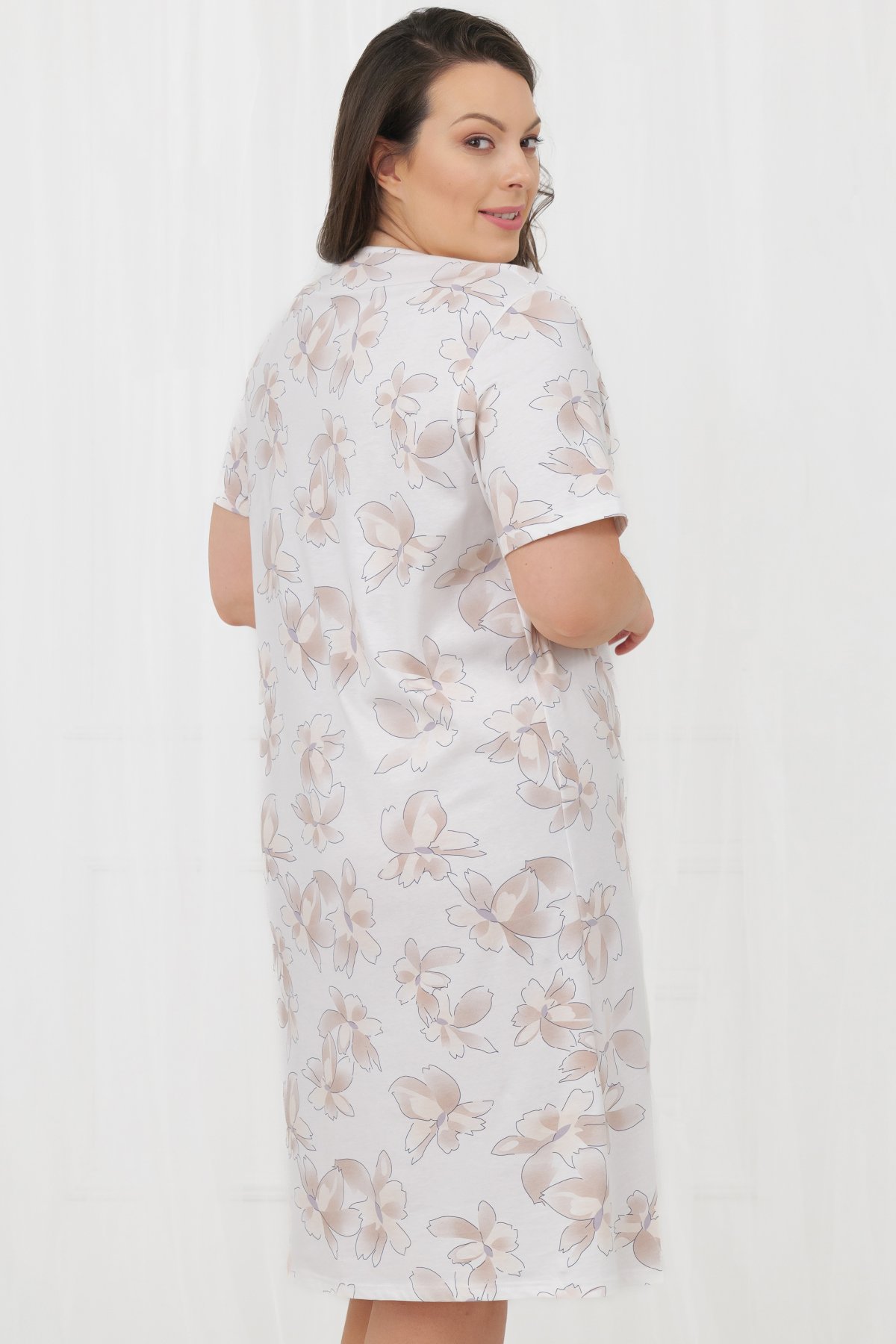 Dámská noční košile Empiria je navržena pro maximální pohodlí při spánku i domácím odpočinku. Vyrobena ze 100% bavlny, je měkká, prodyšná a příjemná na dotek. Volnější střih sahající ke kolenům poskytuje dostatek volnosti pohybu, zatímco krátký rukáv a klasický kulatý výstřih zajišťují komfort během celého roku. Světlý podklad doplňuje decentní květinový potisk v béžových odstínech, který působí jemně a elegantně. Košile je ideální pro ženy, které hledají pohodlné, kvalitní noční prádlo s nadčasovým vzhledem. Skvěle sedí a zachovává si tvar i po opakovaném praní.