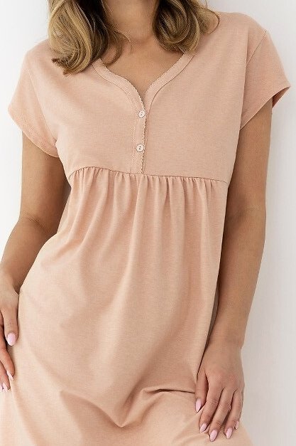 Dámská noční košile Goldie v teplém, světle karamelovém odstínu je spojením pohodlí, funkčnosti a stylu. Vyrobena z měkké bavlněné směsi, která se příjemně přizpůsobí tělu a umožní volný pohyb během spánku. Krátké rukávy a výstřih do „V“ se zapínáním na knoflíky zajišťují praktické využití – ideální i pro kojící maminky. Řasení pod prsy dodává košili jemný, ženský vzhled, zatímco délka nad kolena působí ležérně a elegantně zároveň. Model Goldie je skvělou volbou pro ženy, které chtějí vypadat krásně a cítit se pohodlně po celý den i noc.