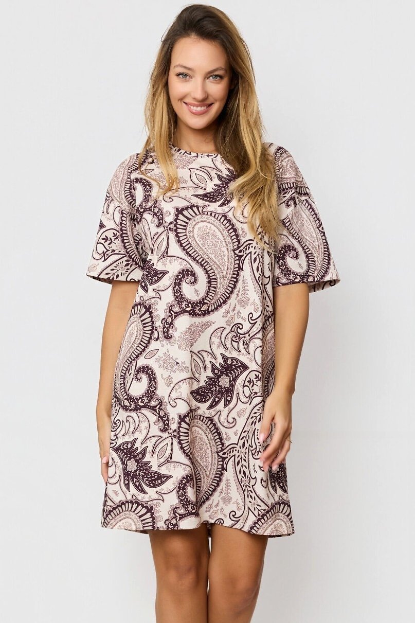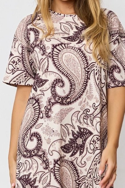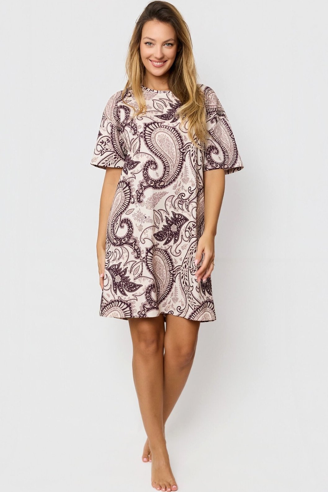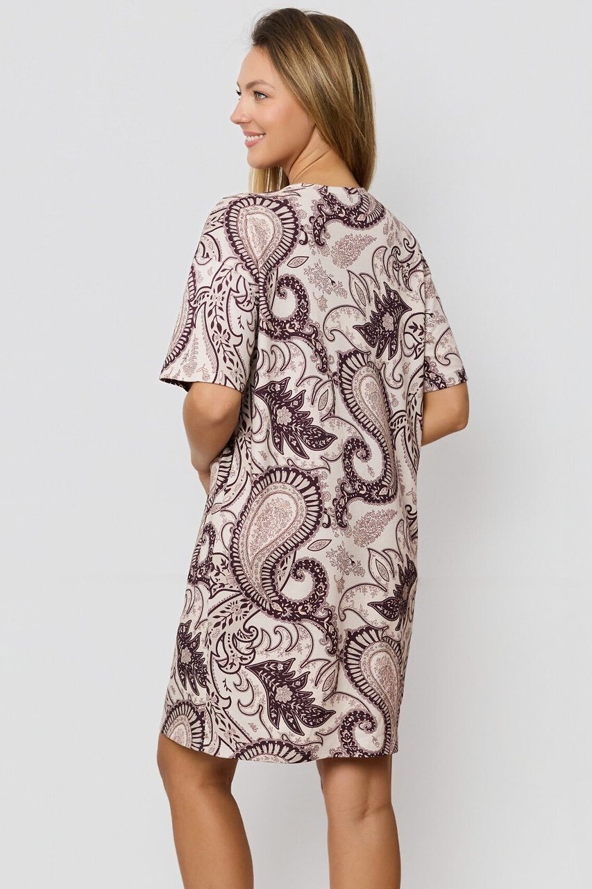 Dámská noční košile Iris je spojení přírodního komfortu a jemné elegance. Vyrobena z měkké bavlny, poskytuje maximální pohodlí při spánku i domácím odpočinku. Krátké rukávy a volný střih zaručují volnost pohybu, zatímco kulatý výstřih a délka nad kolena působí žensky a prakticky. Decentní orientální vzor dodává modelu osobitý vzhled. Díky kvalitnímu materiálu je košile ideální na každodenní nošení, v létě chladí a v chladnějších měsících příjemně zahřeje.