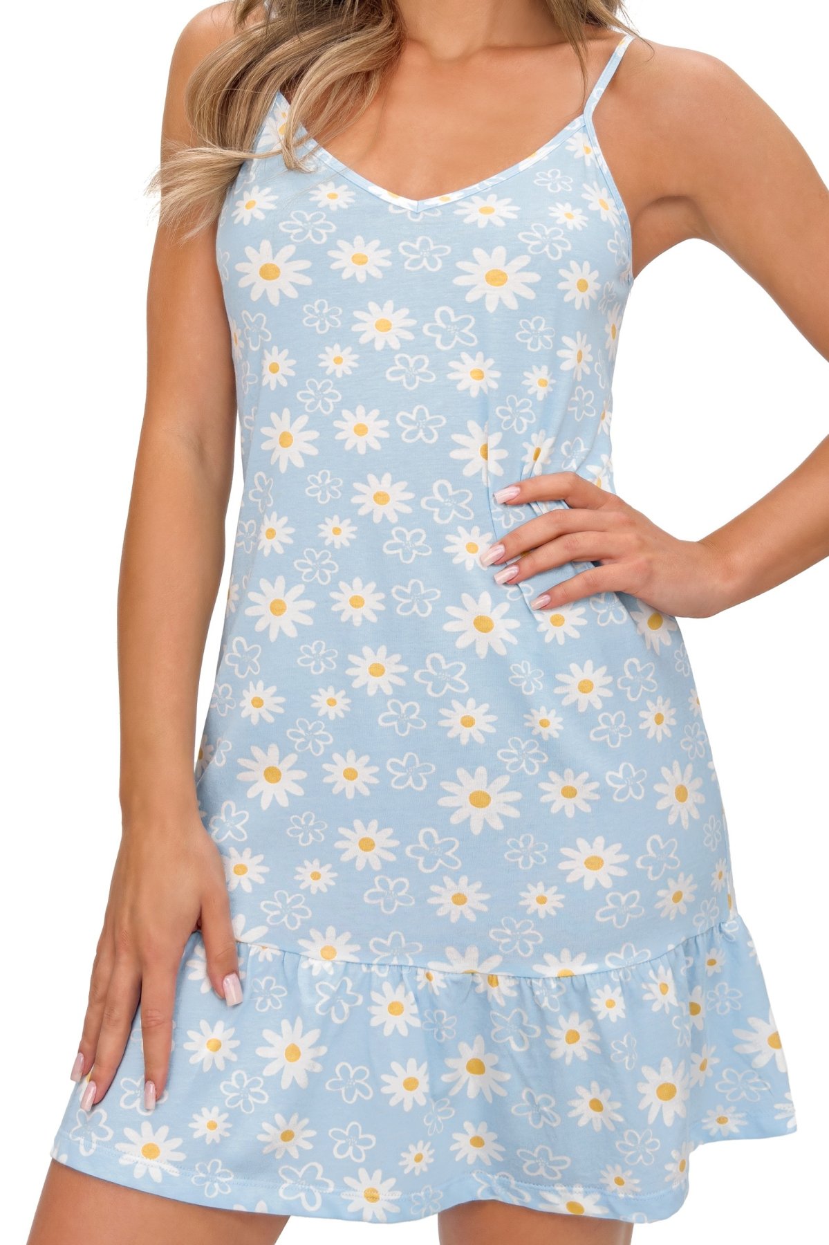 Bavlněná noční košilka Margaret v něžném světle modrém odstínu. Spojuje klasiku, pohodlí a ženský šarm. Je ušitá z měkké, kvalitní přírodní bavlny, která zaručuje komfort při spánku i relaxaci. Jemný květinový motiv dodává košilce romantický vzhled, tenká ramínka a volánový lem zvýrazňují lehkost a ženskost střihu. Model je ideální na teplé noci, kdy oceníte prodyšnost a hebkost materiálu.