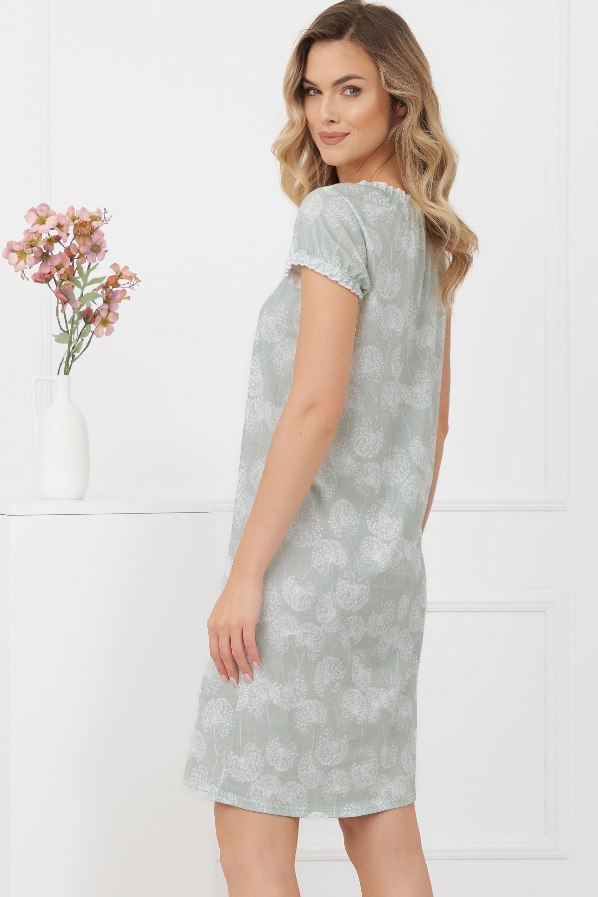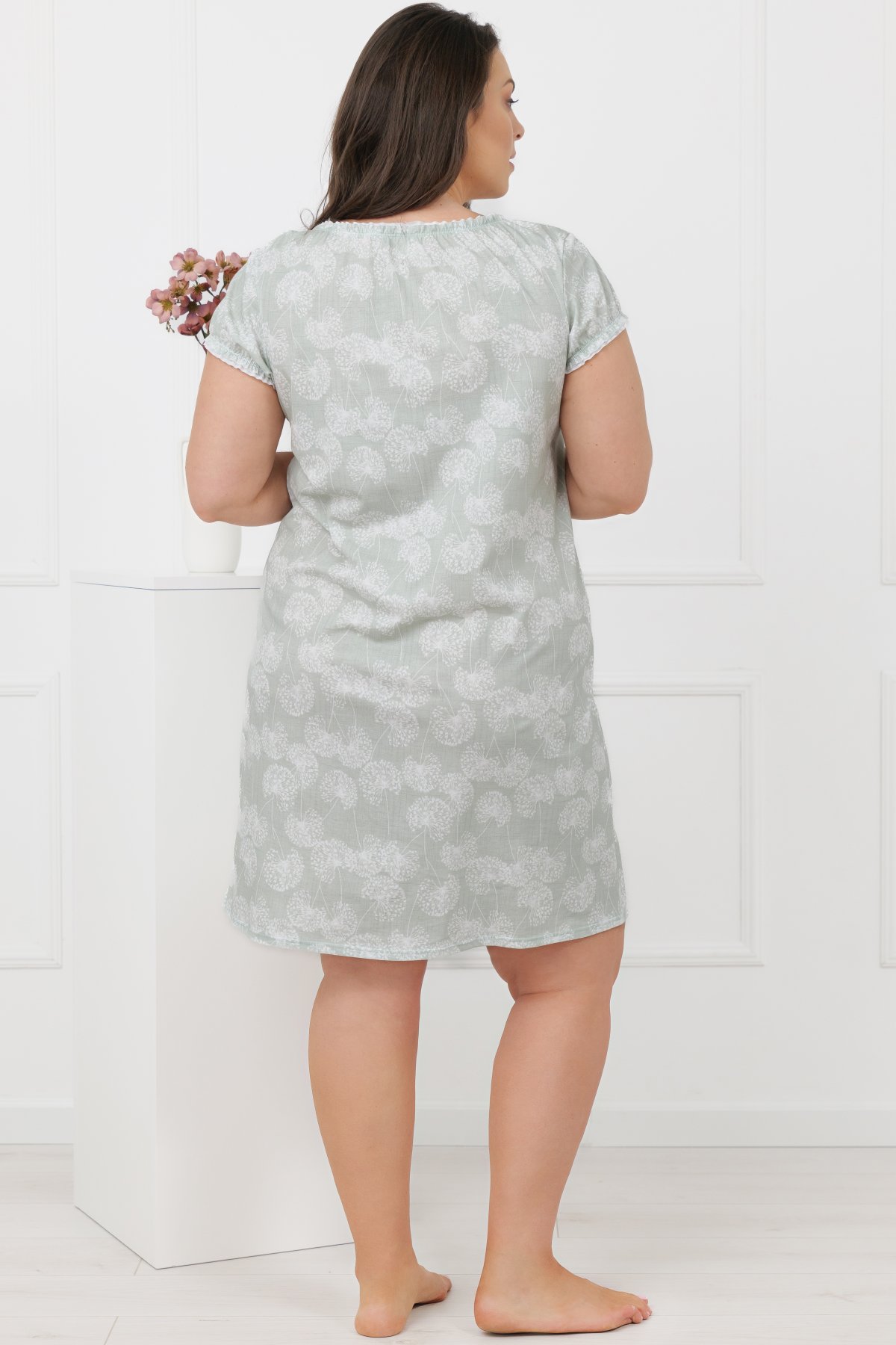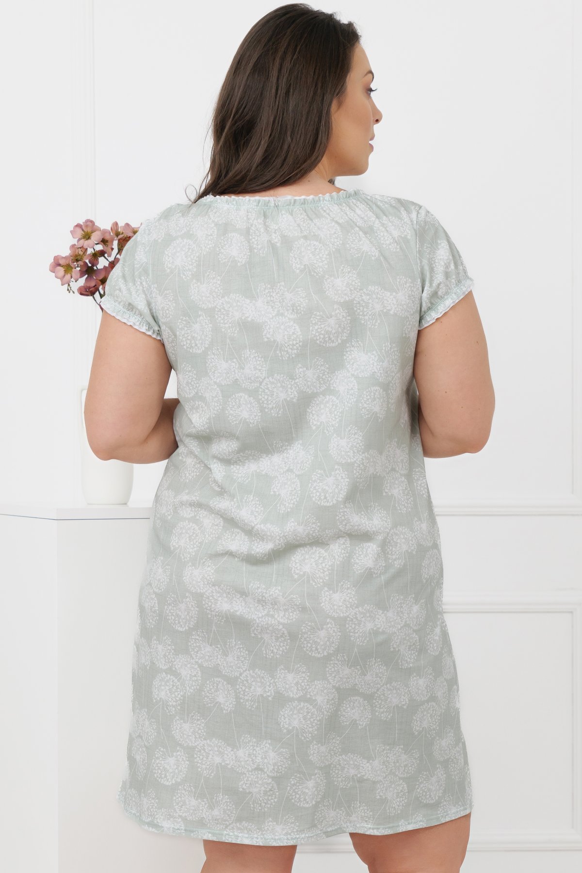 Volnější střih se přirozeně přizpůsobí postavě a neomezuje v pohybu, takže poskytuje komfort po celou noc. Krátké rukávy zajišťují příjemné nošení během celého roku. Kulatý výstřih s jemným řasením a elastickým zakončením umožňuje pohodlné využití i během kojení. Ozdobná saténová mašlička na přední straně dodává modelu ženský detail. Pastelové barvy s jemným motivem odkvetlých pampelišek působí klidně a harmonicky, ideální pro večerní odpočinek. Měkká, prodyšná bavlna je šetrná k pokožce a vhodná i pro citlivou pleť.