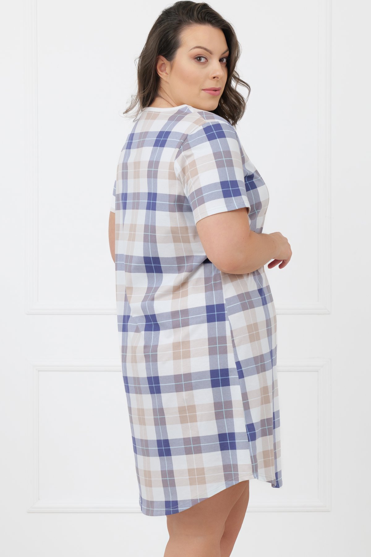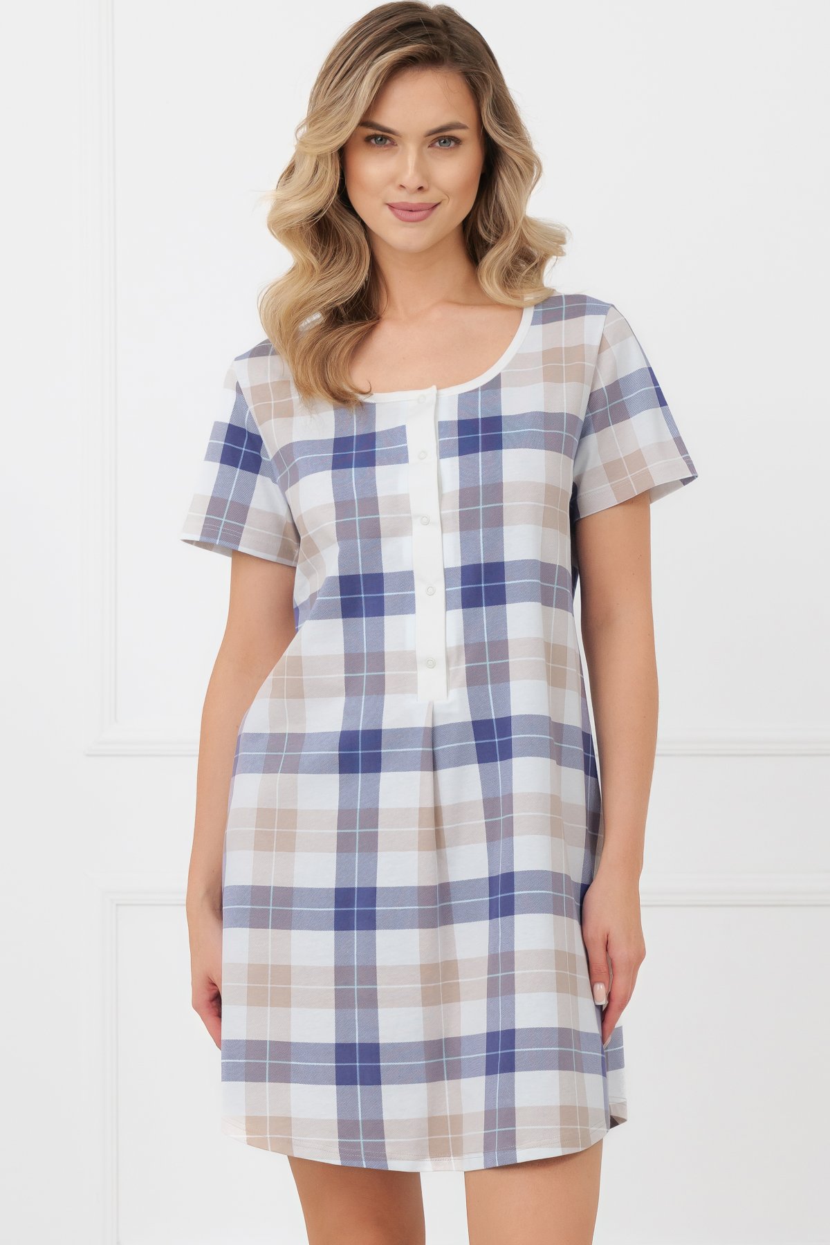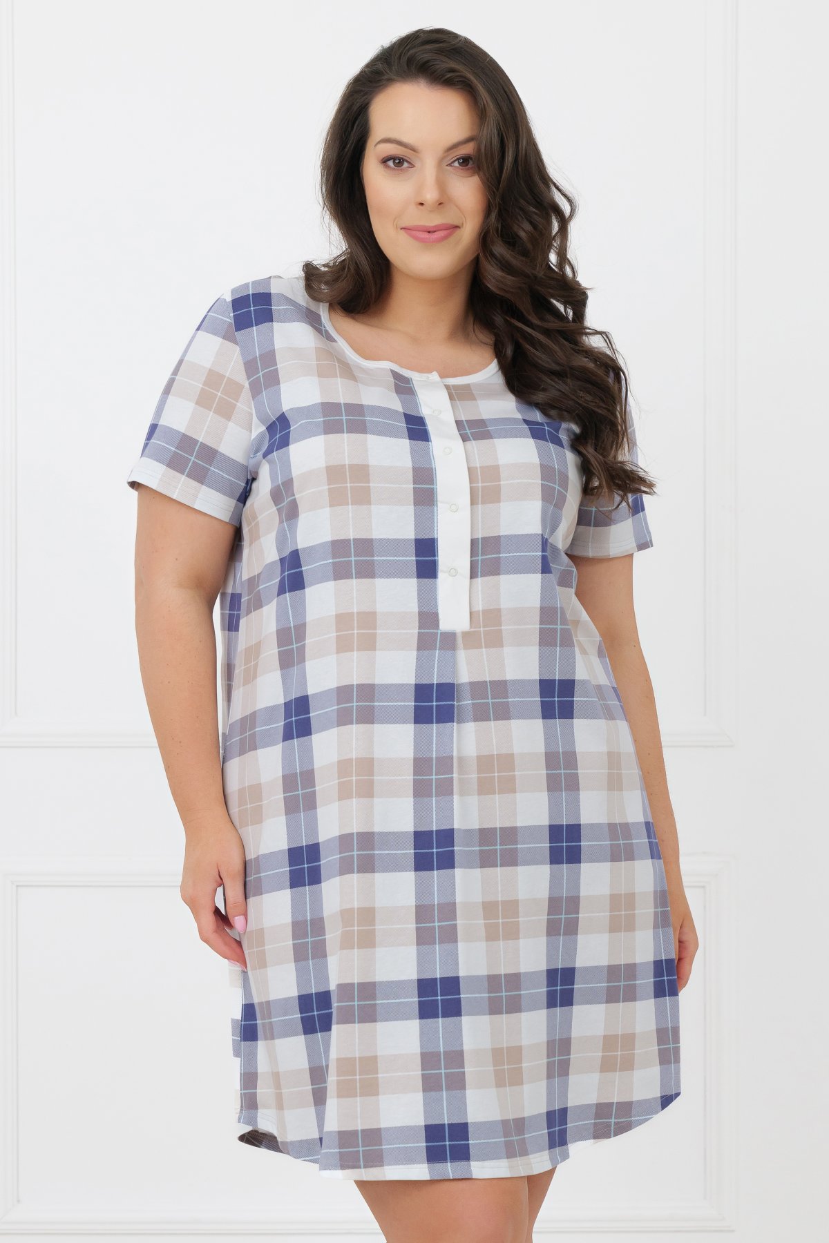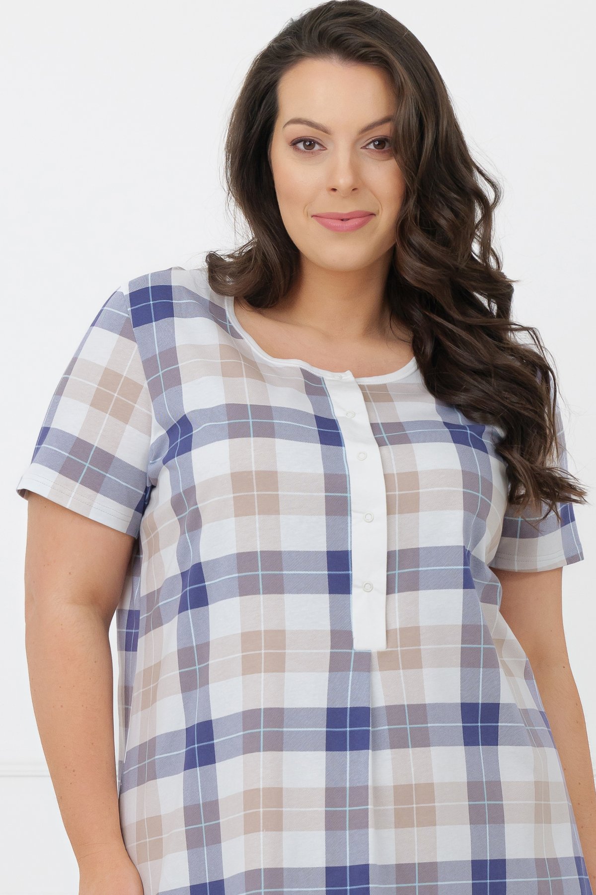 Střih je rovný a uvolněný, neomezuje v pohybu a dobře sedí různým typům postavy. Výstřih s patentkami usnadňuje oblékání a zároveň umožňuje pohodlné kojení případným maminkám. Díky záhybu v přední části je model vhodný také pro těhotné ženy. Klasická kostka působí čistě a nadčasově.