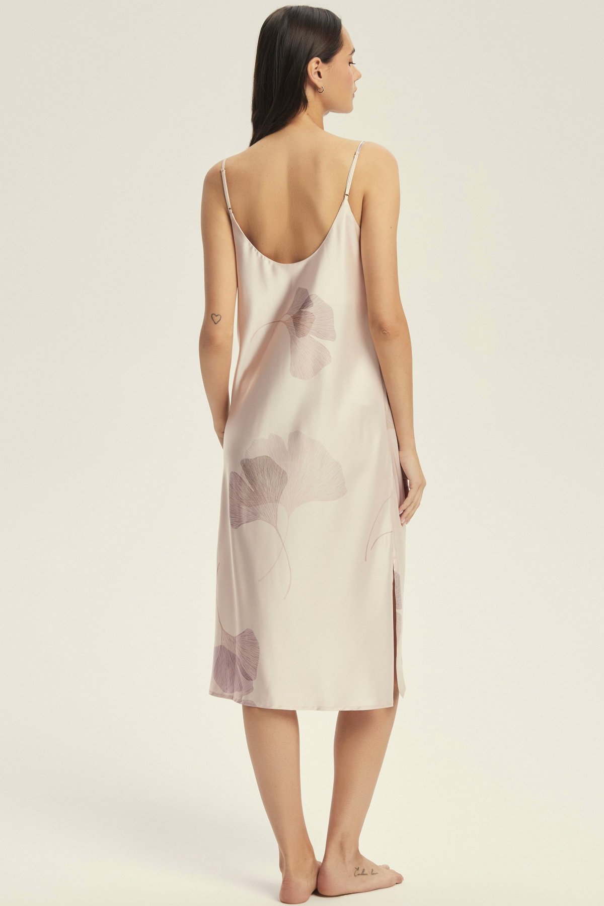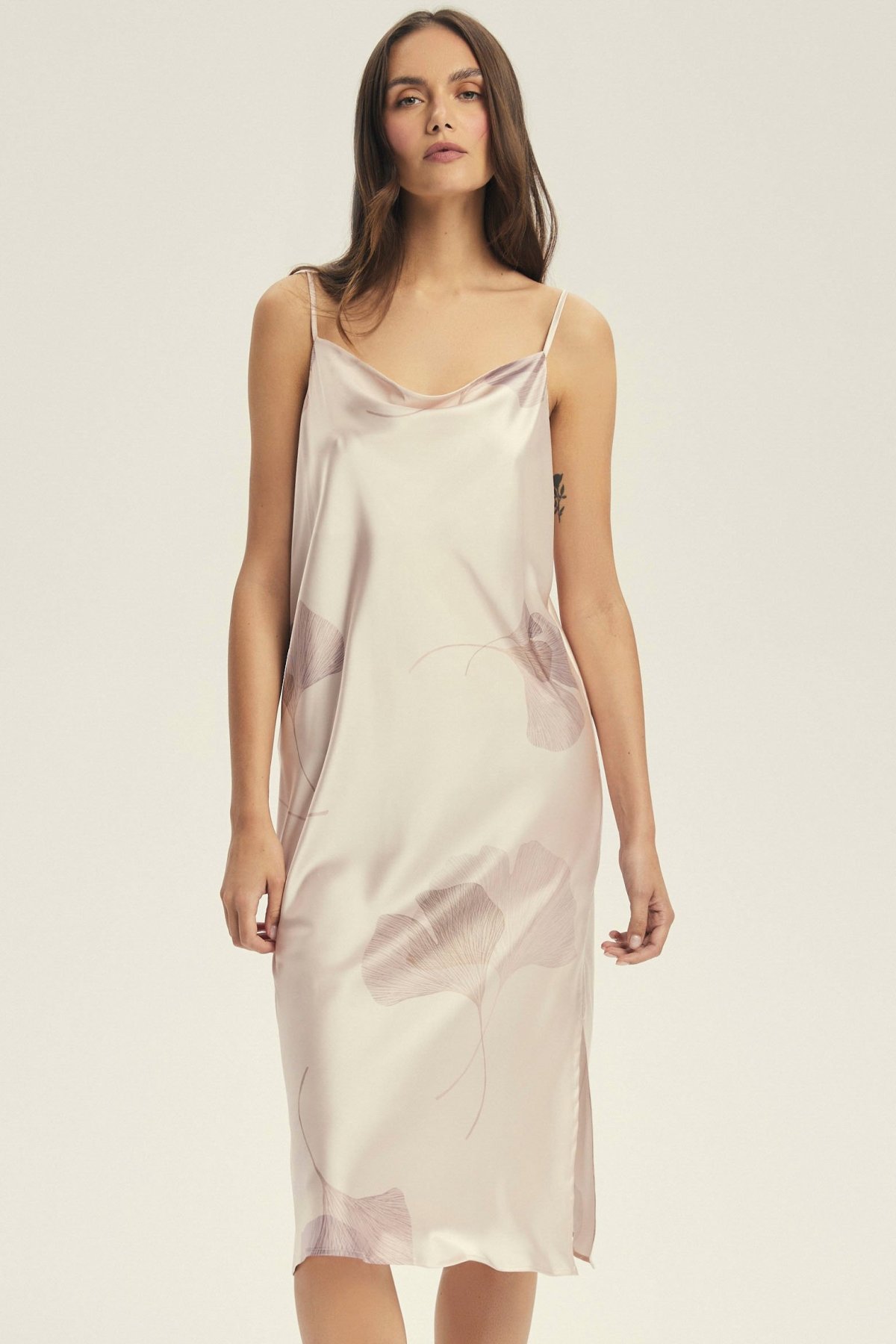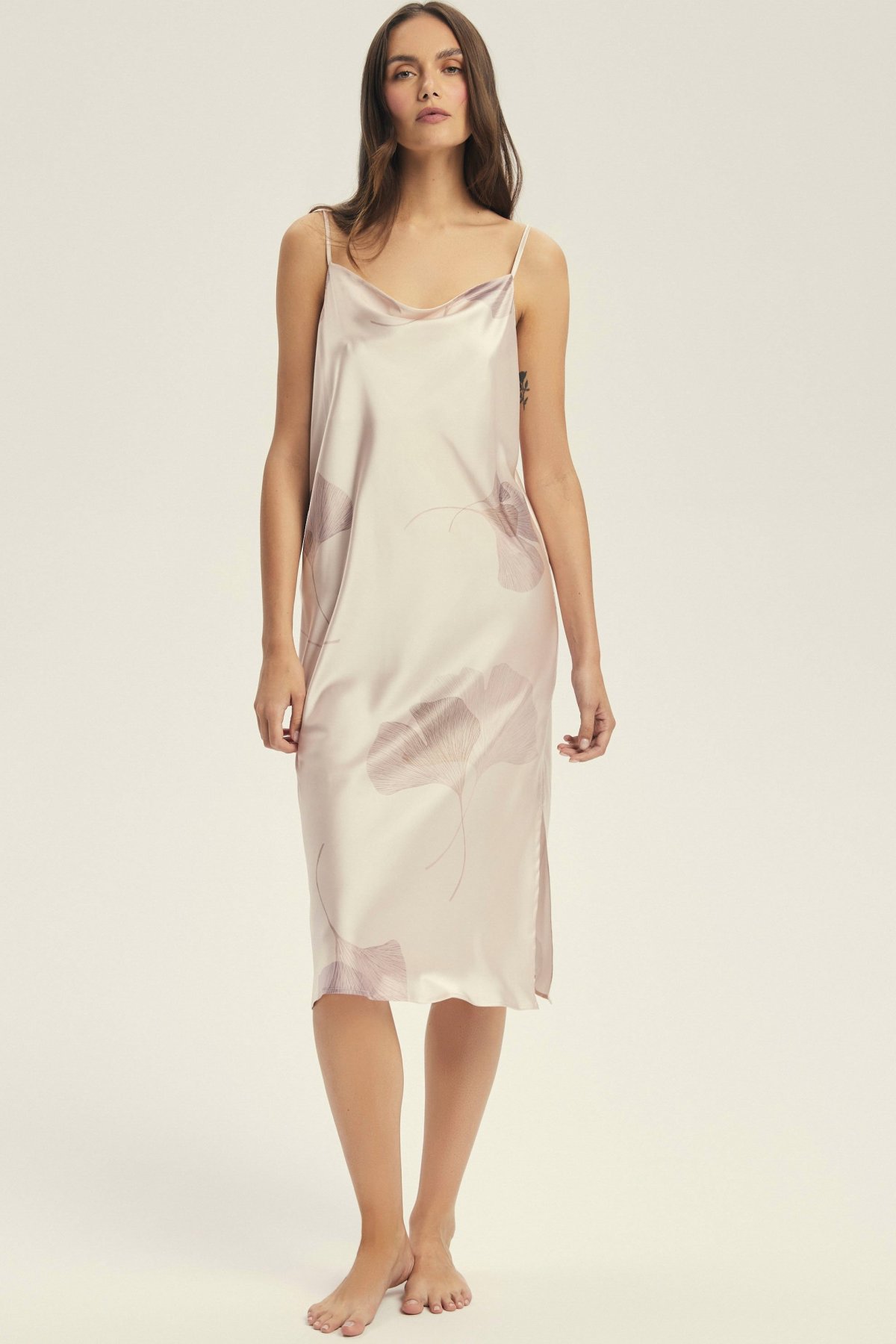 Noční košilka Capriccio v béžovém odstínu přináší do večerního rituálu dotek jemnosti a elegance. Její lesklá, hebká tkanina se při pohybu lehce vlní a vytváří efekt plovoucího saténu. Dekor listů působí jako ručně malovaný obraz. Výstřih krásně zvýrazňuje dekolt a přidává modelu ženskou gracióznost, kterou doplňuje midi délka s decentními rozparky po stranách. Capriccio je košilka, která proměňuje noc v okamžik klidu, půvabu a smyslné pohody.