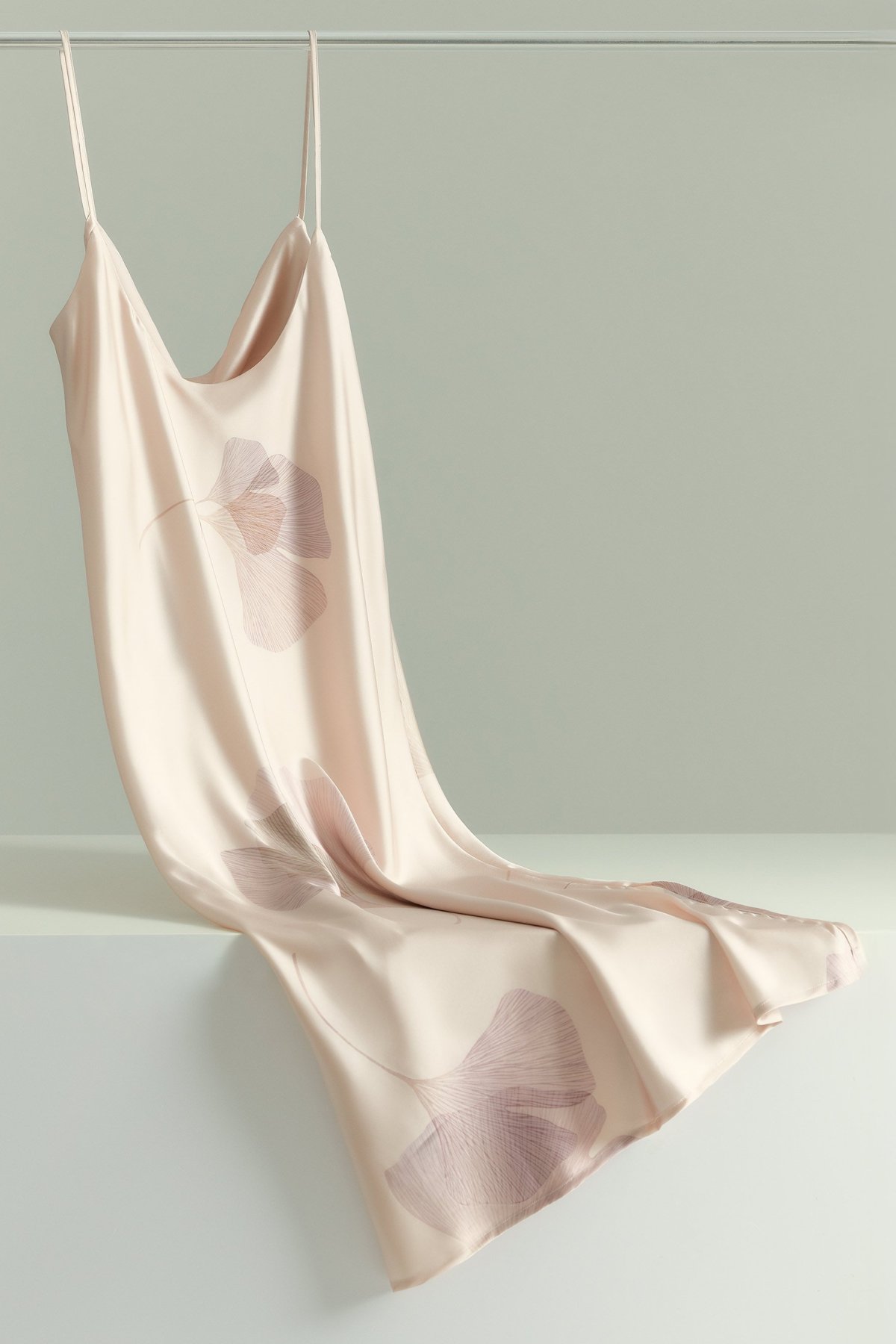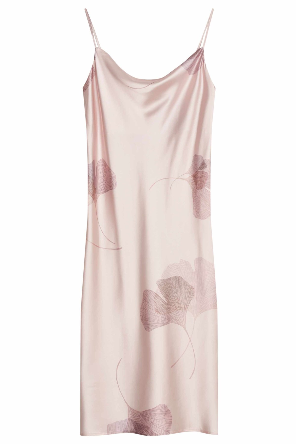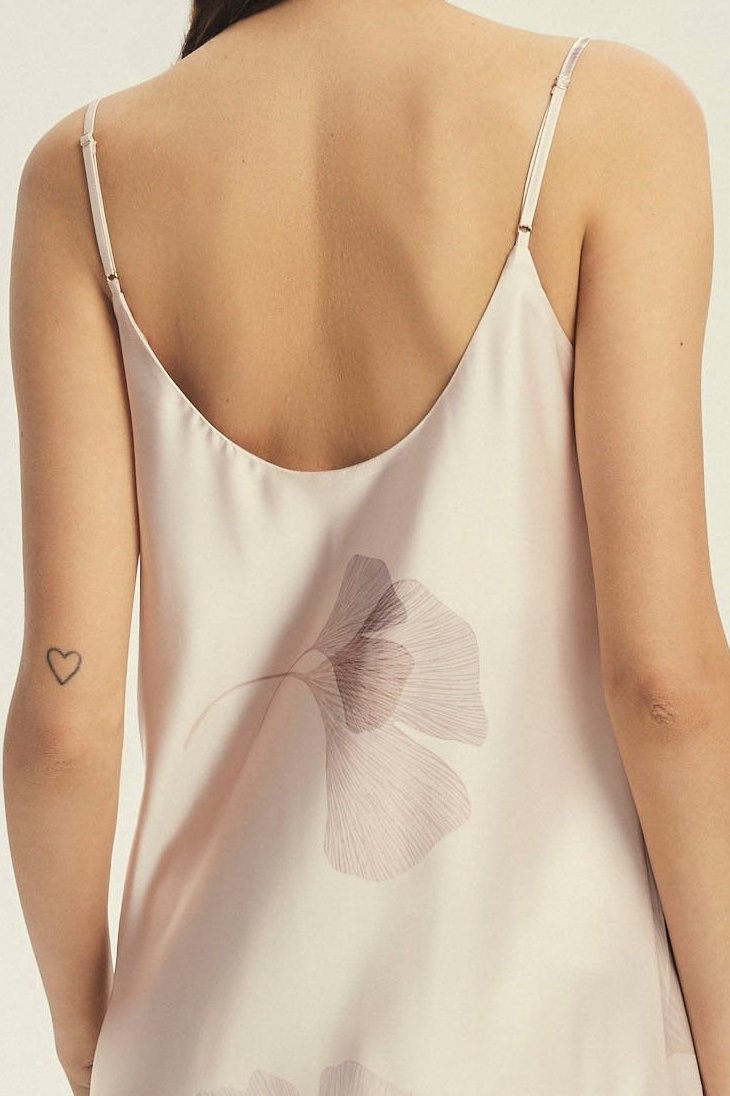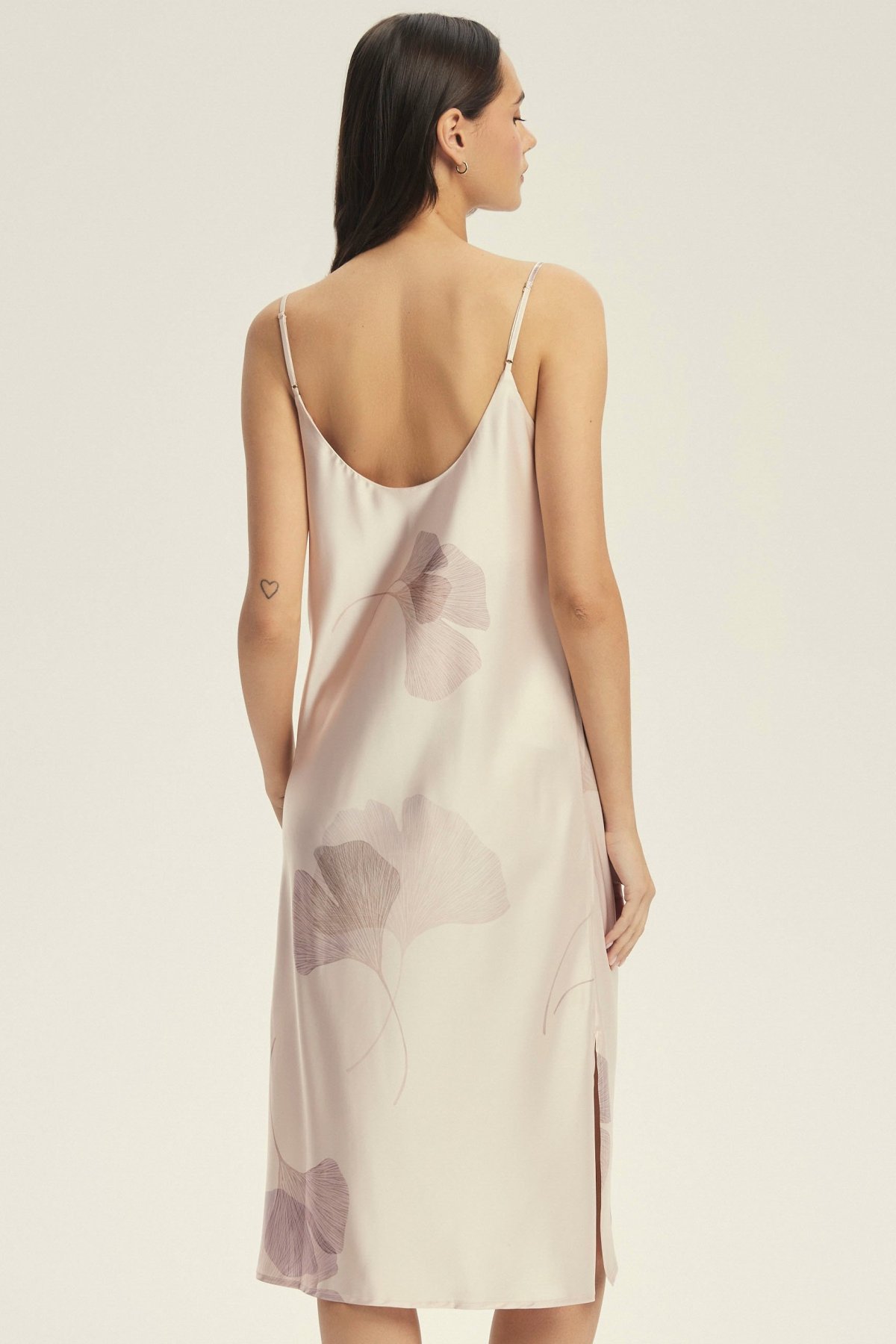 Noční košilka Capriccio v béžovém odstínu přináší do večerního rituálu dotek jemnosti a elegance. Její lesklá, hebká tkanina se při pohybu lehce vlní a vytváří efekt plovoucího saténu. Dekor listů působí jako ručně malovaný obraz. Výstřih krásně zvýrazňuje dekolt a přidává modelu ženskou gracióznost, kterou doplňuje midi délka s decentními rozparky po stranách. Capriccio je košilka, která proměňuje noc v okamžik klidu, půvabu a smyslné pohody.