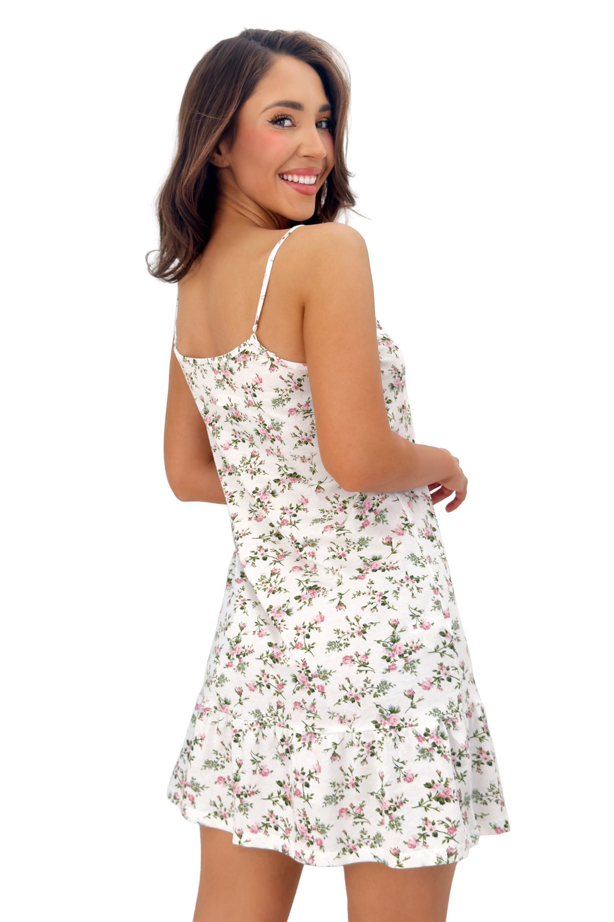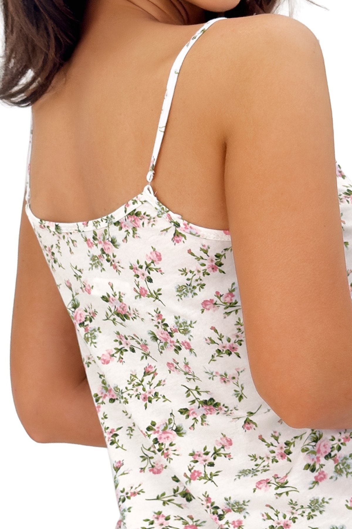Dámská noční košilka Emilka zaujme jemným květinovým vzorem a lehkým, pohodlným provedením. Tenká ramínka a volnější střih zajišťují příjemné nošení během spánku i domácího odpočinku. Spodní část zdobí široký dívčí volán, který dodává modelu měkký a romantický vzhled. Díky 100% bavlně je materiál příjemný na pokožce a vhodný pro každodenní nošení.
