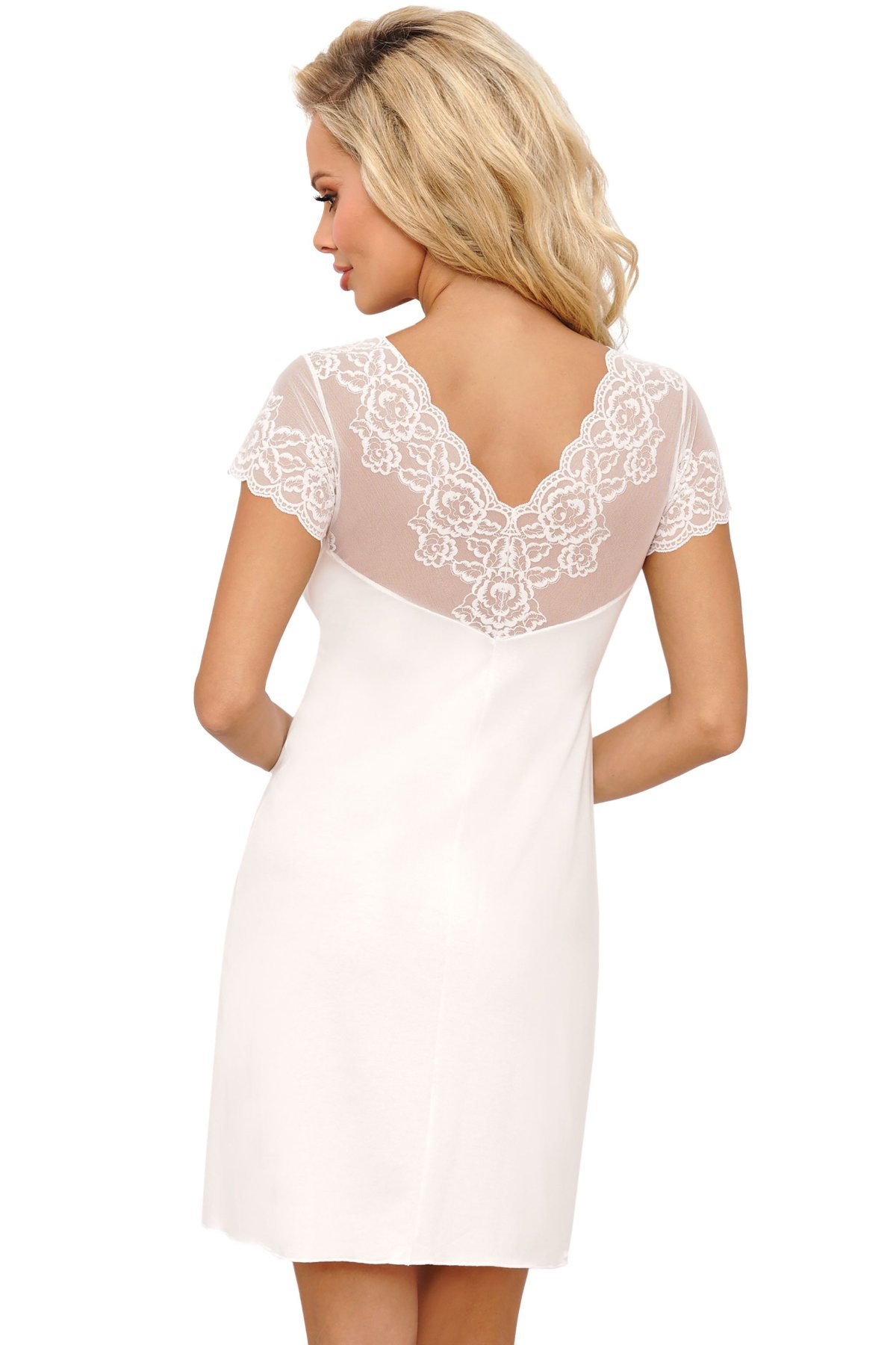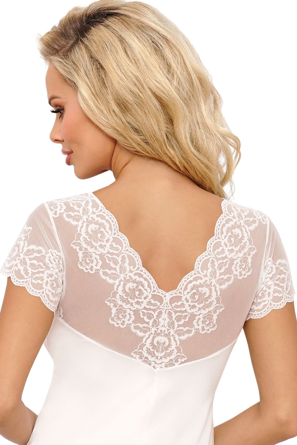 Šmrncovní košilka z luxusní viskózové tkaniny. Vrchní liniii ramen i dekoltu zdobí jemná krajka se vzorem květin. Košilka se ve spodní části lehce rozšiřuje, délka sahá nad kolena. Příjemný materiál, luxusní střih a neodolatelný design vytvářejí perfektní celek! Na vás je si tento skvost náramně užít.