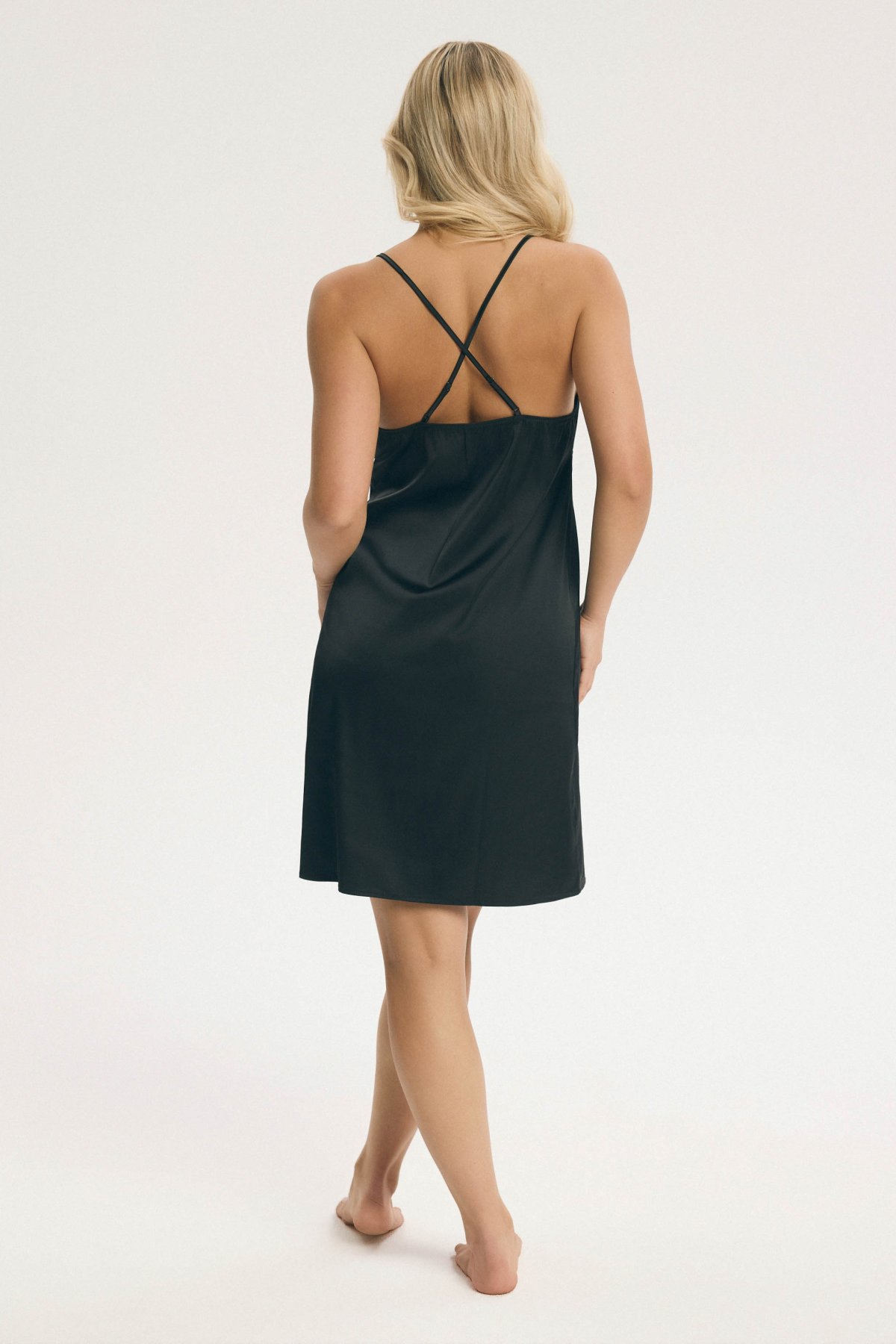 Dámská noční košile Pandorra sází na jednoduchý střih a výraznější detail v podobě krajkového výstřihu do V. Tenká ramínka přecházejí na zádech do kříženého uspořádání, které model opticky odlehčuje a zvýrazňuje linii zad. Volnější silueta se na těle měkce ukládá a působí pohodlně při spaní i domácím nošení. Provedení v kombinaci s jemně lesklým saténovým materiálem dodává košili elegantní a upravený vzhled.