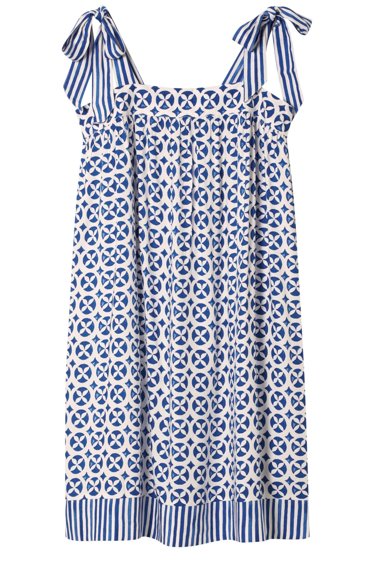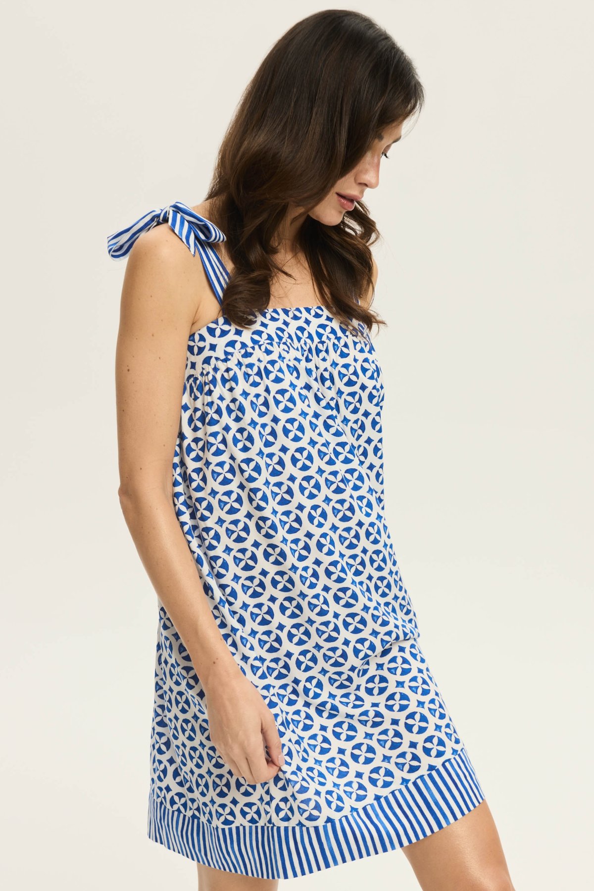 Noční košilka Rekha zaujme efektním spojením vzorů a uvolněným střihem. Je ušitá z lehké, vzdušné tkaniny, takže se skvěle hodí na léto, ať už doma, nebo na dovolené. Geometrický motiv kontrastuje s pruhovaným spodním lemem a mašličkami na ramenou, které nejsou jen ozdobou, ale zároveň umožňují regulaci délky ramínek. Volnější střih zajišťuje pohodlí a trapézová linie se lehce vznáší kolem postavy, aniž by ji obepínala. Celek působí dívčím, stylovým dojmem s jemným exotickým nádechem.