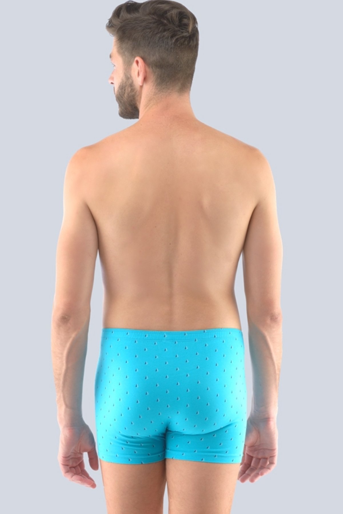 Boxerky s kratší nohavičkou, pánské šité prádlo. V pasovém kraji je zašitá širší pruženka. Nohavičky jsou začištěné podehnutím. Zadní díl je hladký. Boxerky jsou potištěné drobným vzorem (plachetnice). Materiál je vyroben z bavlny, která je doplněna elastanem. Úplet je vhodný pro všechny, kteří hledají přírodní materiály. Elastan přidává materiálu pružnost a zlepšuje jeho tvarovou stálost. Prádlo z tohoto materiálu je vhodné pro každodenní nošení.