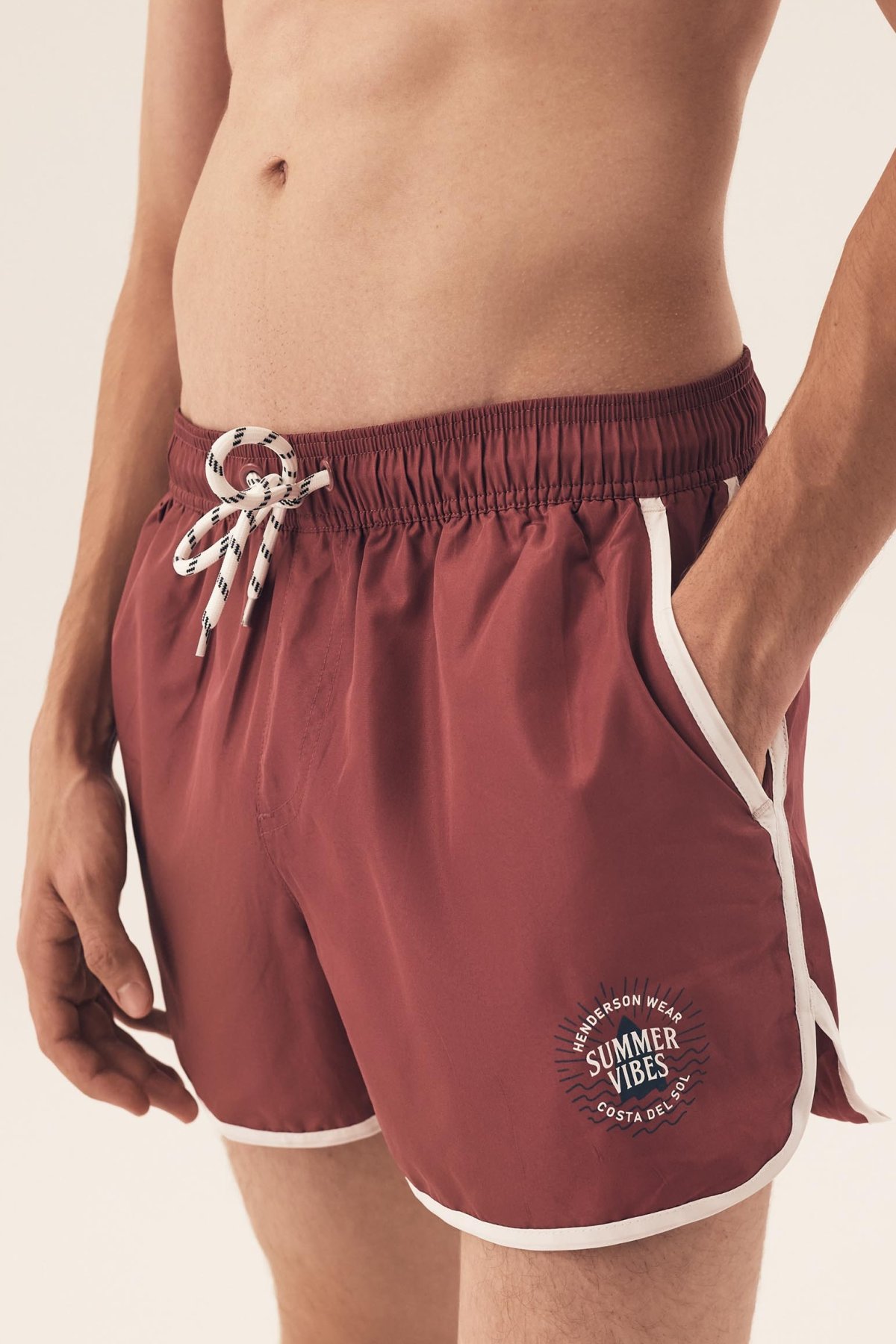 Pánské plavky nabízejí lehké nošení a pohodlné přizpůsobení v pase. Kratší střih s jemně zaoblenými nohavicemi působí sportovně a podporuje volnost pohybu.