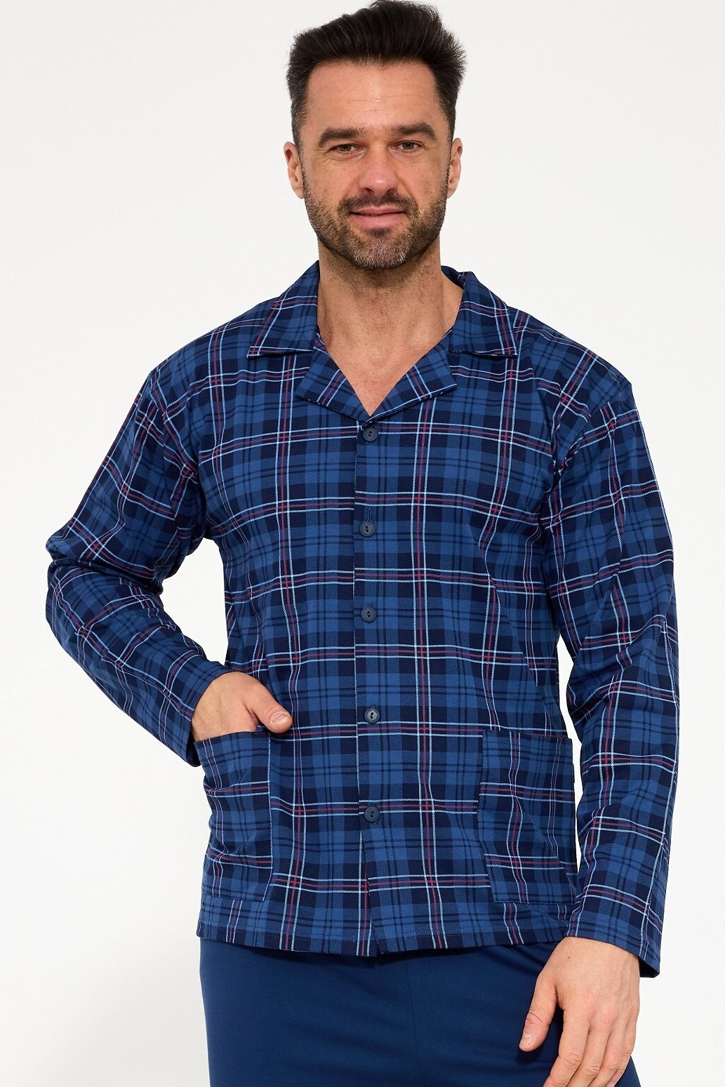 Horní díl v jemném kostkovaném vzoru je doplněn o límeček, zapínání na knoflíky a dvě praktické kapsy. Dlouhé jednobarevné kalhoty mají pohodlný pas s měkkou gumou, která netlačí. Měkká bavlna je příjemná na dotek, zaručuje prodyšnost a komfort při spánku i večerním odpočinku. Tento nadčasový model je ideální pro chladnější noci a skvěle se hodí i jako elegantní dárek pro muže, kteří si potrpí na kvalitu a klasický styl.