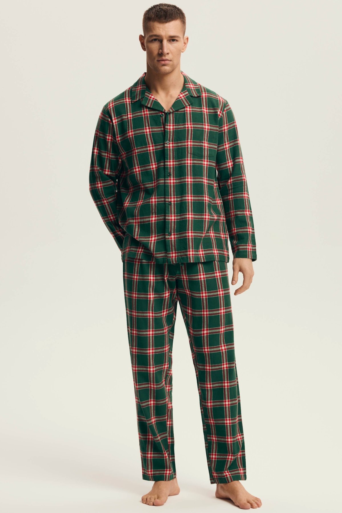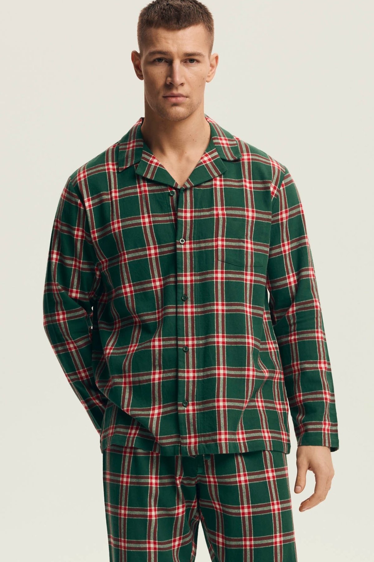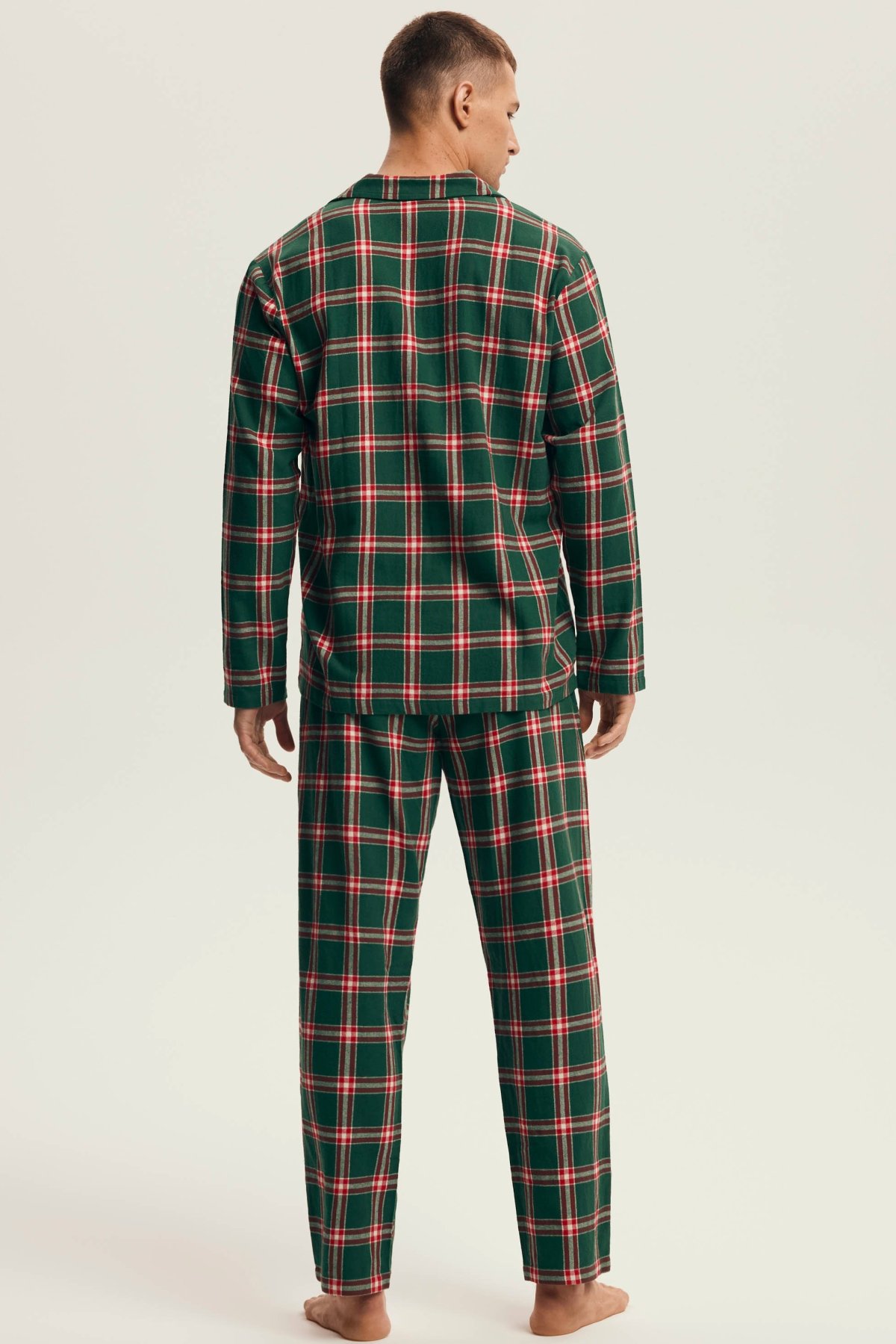 Pánské pyžamo Nut je synonymem klasické elegance a maximálního pohodlí. Vyrobené z měkké, čistě flanelové bavlny, která je prodyšná a zároveň příjemně hřeje. Horní díl má podobu košile s límečkem a knoflíkovým zapínáním, díky čemuž působí upraveně a nadčasově. Dlouhé kalhoty v zeleném kostkovaném vzoru mají elastický pas s regulací na šňůrku, takže se snadno přizpůsobí postavě. Tento model je ideální pro chladnější měsíce – perfektní pro muže, kteří hledají kombinaci stylu, tepla a každodenního komfortu.