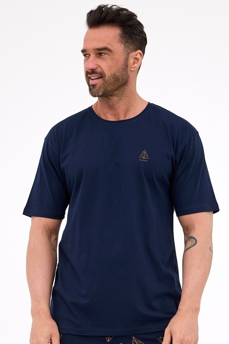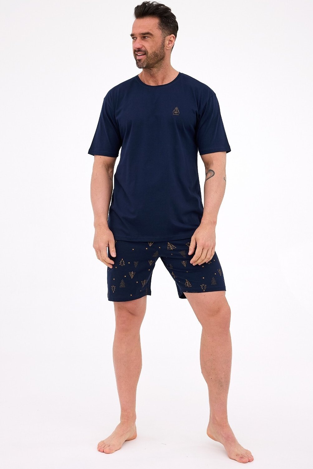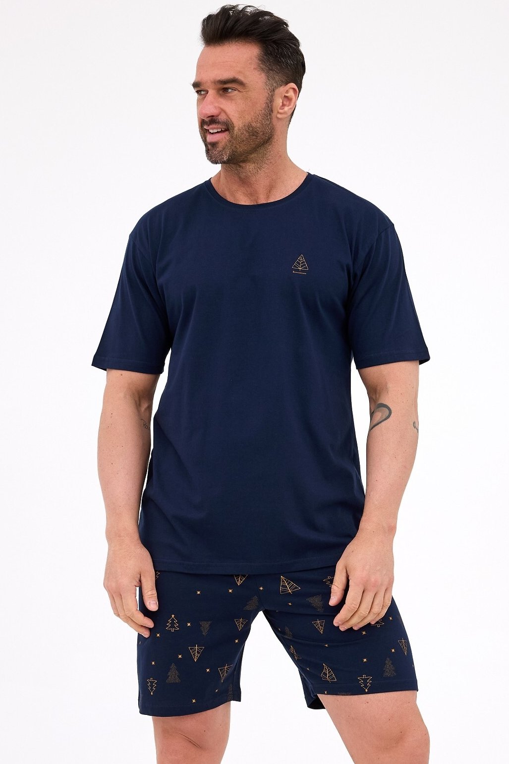 Vánoční pánské pyžamo Night spojující sváteční design s maximálním komfortem. Měkké bavlněné tričko s krátkým rukávem zdobí veselý vánoční motiv, který navodí příjemnou atmosféru. Dekolt je kulatý. Lehké šortky s potiskem stromečků a elastickým pasem zajistí volnost pohybu i pohodlí během celé noci.