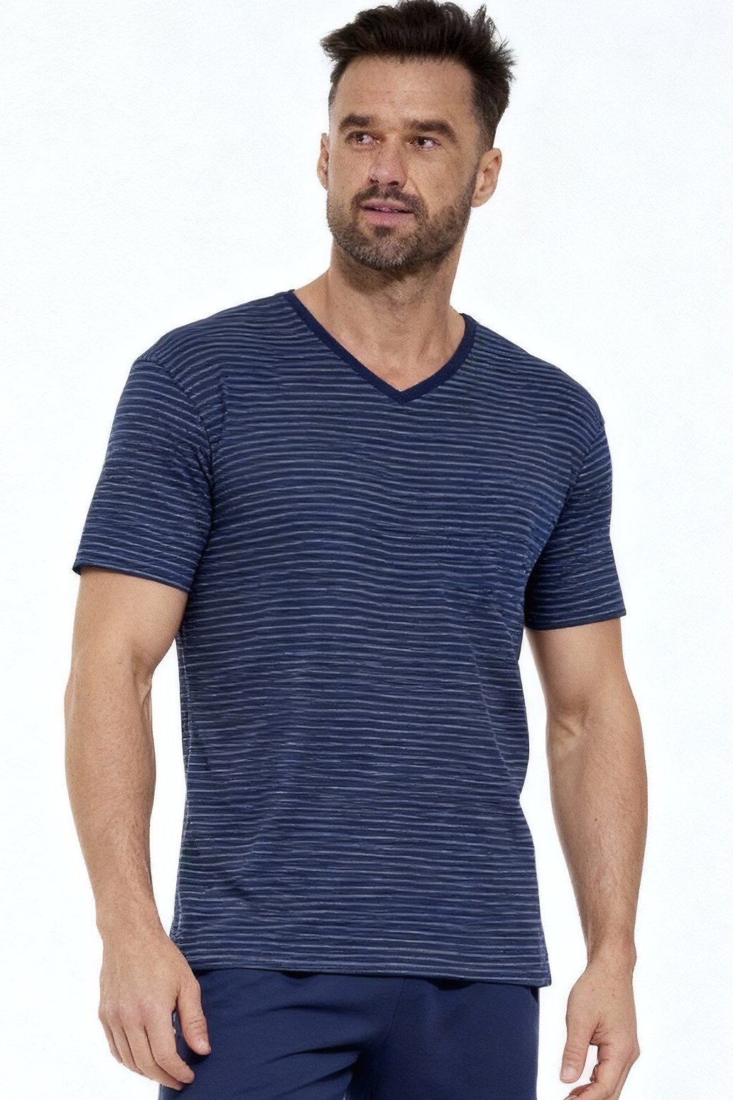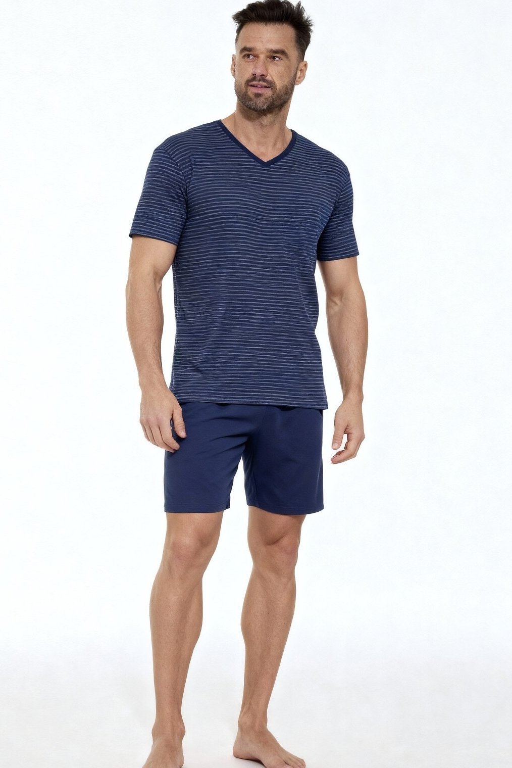 Pánské pyžamo představující klasickou kombinaci stylu a komfortu. Lehká bavlněná látka zaručuje příjemný pocit při nošení. Tričko s krátkým rukávem a výstřihem do V působí moderně a elegantně. Pruhovaný vzor dodává pyžamu nadčasový vzhled, který nikdy neomrzí. Jednobarevné šortky se širokou gumou v pase zajišťují volnost pohybu a pohodlí po celou noc. Tento model je perfektní pro muže, kteří hledají vyváženou kombinaci kvality, funkčnosti a stylu.