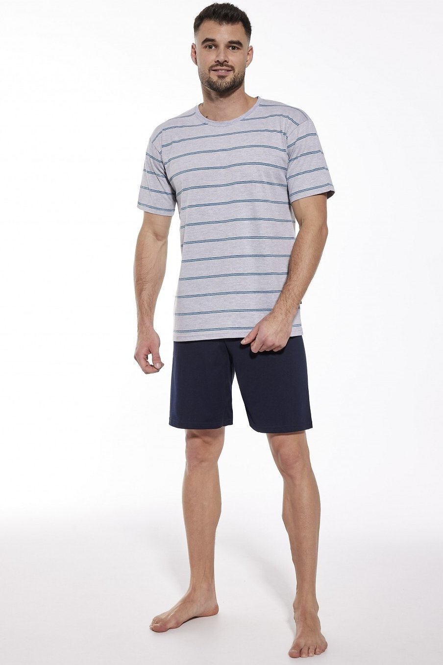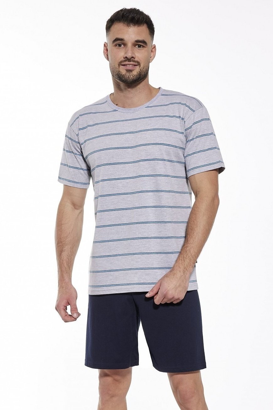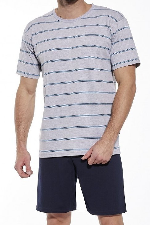Pánské pyžamo v šedé barvě. Jednoduchá elegance a komfort. Tričko s decentním pruhovaným vzorem působí moderně a vkusně. Jednobarevné šortky jsou maximálně pohodlné při spánku i relaxaci. Měkký bavlněný materiál je prodyšný, příjemný na dotek, postará se o optimální komfort po celou noc. Díky volnému střihu a pružnému pasu se pyžamo dokonale přizpůsobí postavě. Skvělá volba pro muže, kteří hledají ležérní, ale kvalitní noční oblečení.