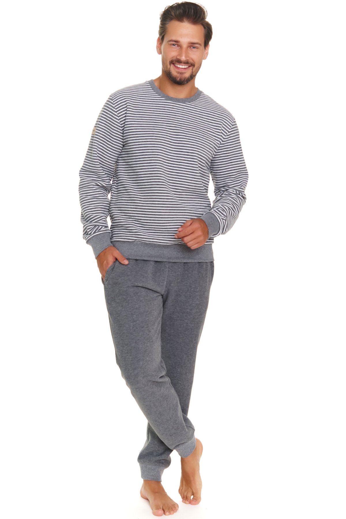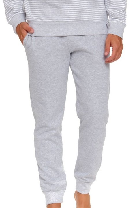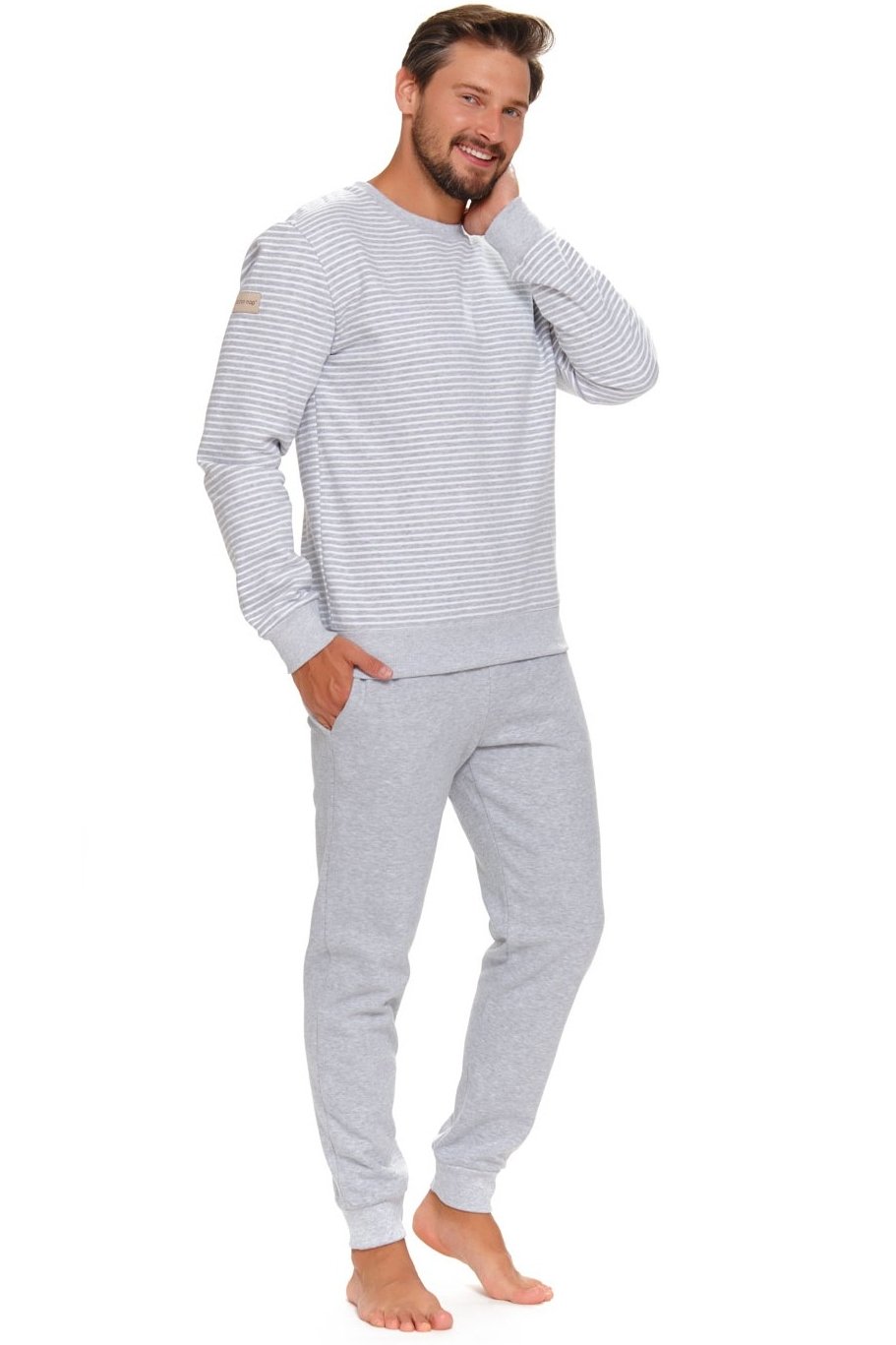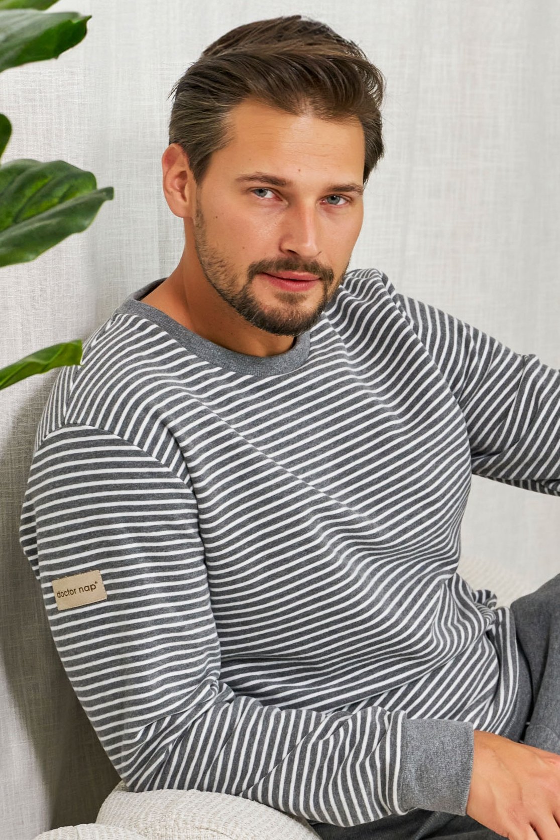 Pánské pyžamo Doctor Nap v šedých tónech s jemnými proužky. Vyrobené z kvalitní směsi bavlny a polyesteru, nabízí příjemný pocit na pokožce a ideální tepelný komfort během chladnějších dnů. Dlouhé rukávy a kalhoty s volnějším střihem zaručují naprostou volnost pohybu, zatímco elastický pas zvyšuje pohodlí při nošení. Materiál je jemně hřejivý, díky čemuž lze pyžamo využít nejen na spaní, ale také jako stylový domácí komplet. Klasický střih, decentní barvy a precizní zpracování dělají z tohoto modelu univerzální volbu pro muže, kteří dávají přednost kvalitě, jednoduchosti a pohodlí.