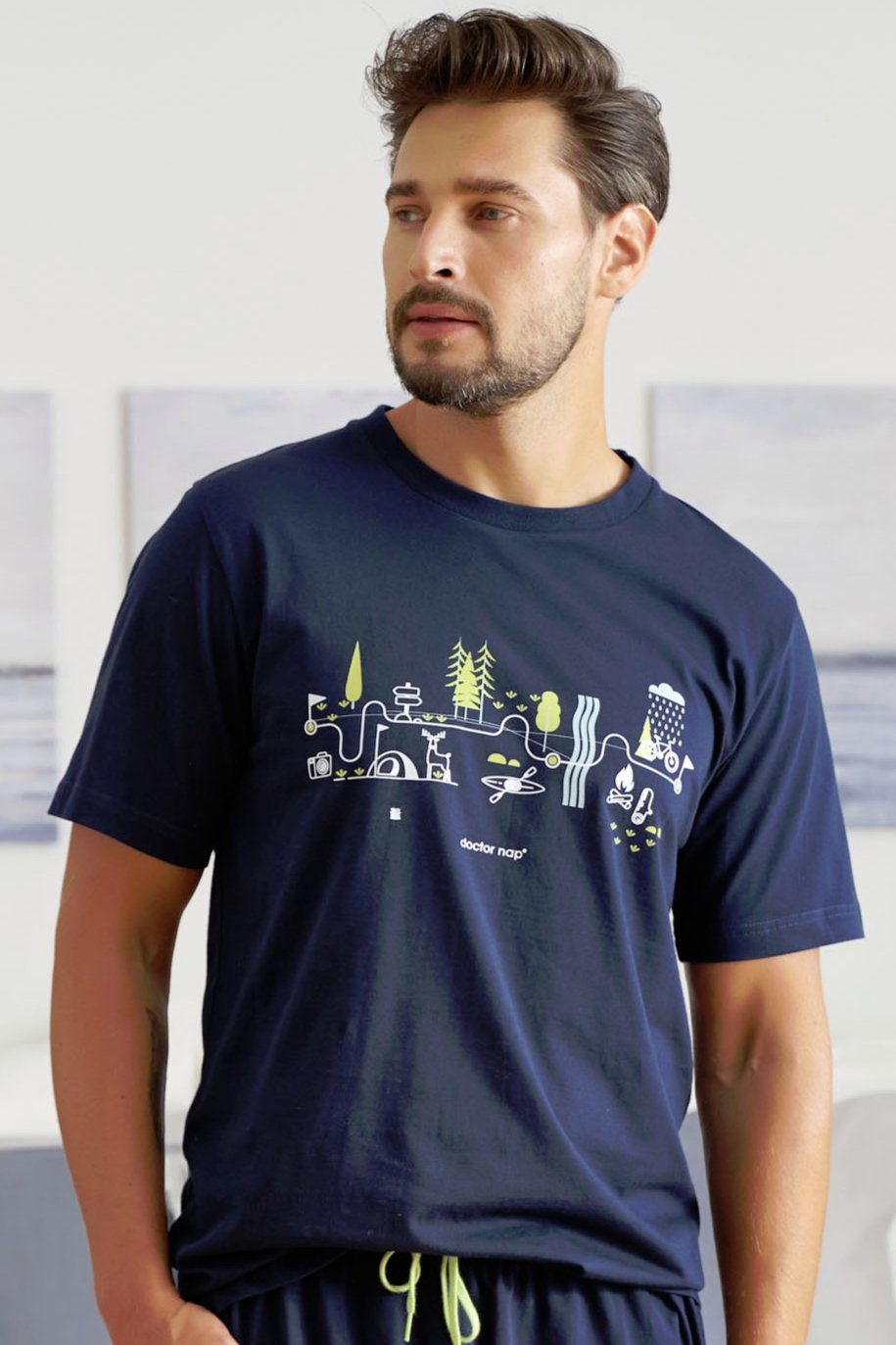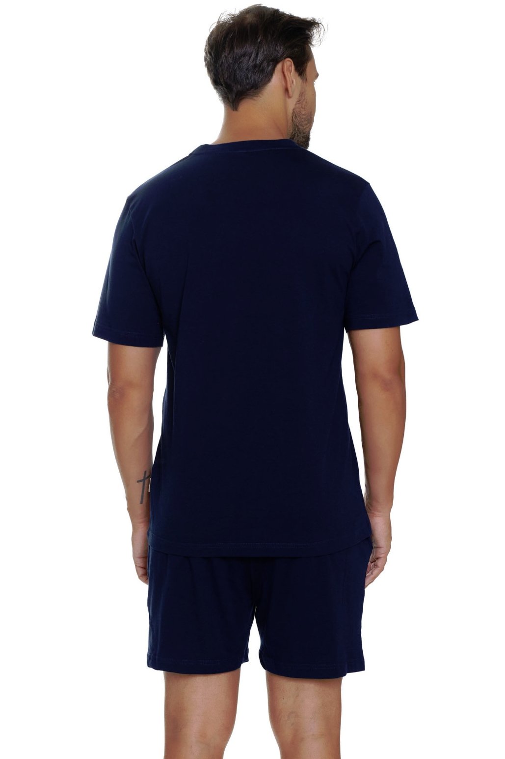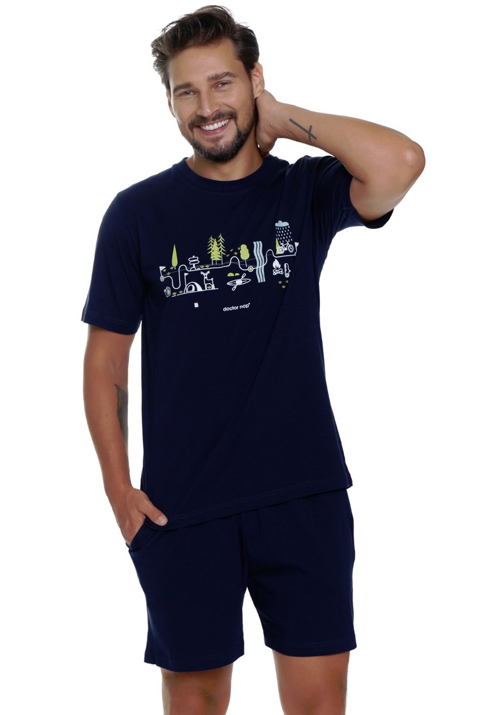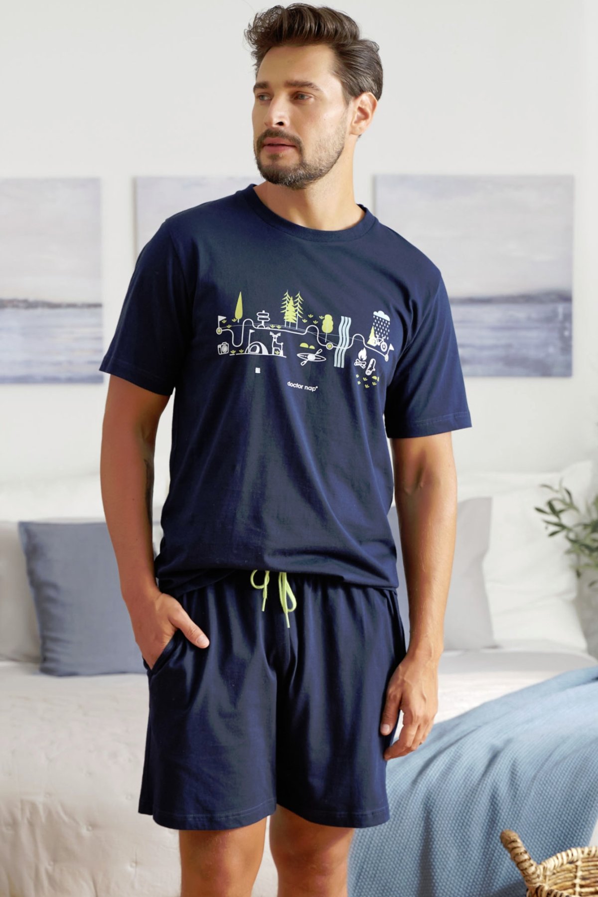 Dvoudílné pánské pyžamo v elegantní námořnické modři. Společník pro pohodlný spánek i lenivé víkendové ráno. Klasické tričko s krátkým rukávem a decentním potiskem je vyrobeno z jemné bavlněné tkaniny, která příjemně dýchá a zaručuje celonoční komfort. Krátké šortky s praktickými kapsami a pružným pasem skvěle padnou, neomezují v pohybu a poskytují maximální volnost.