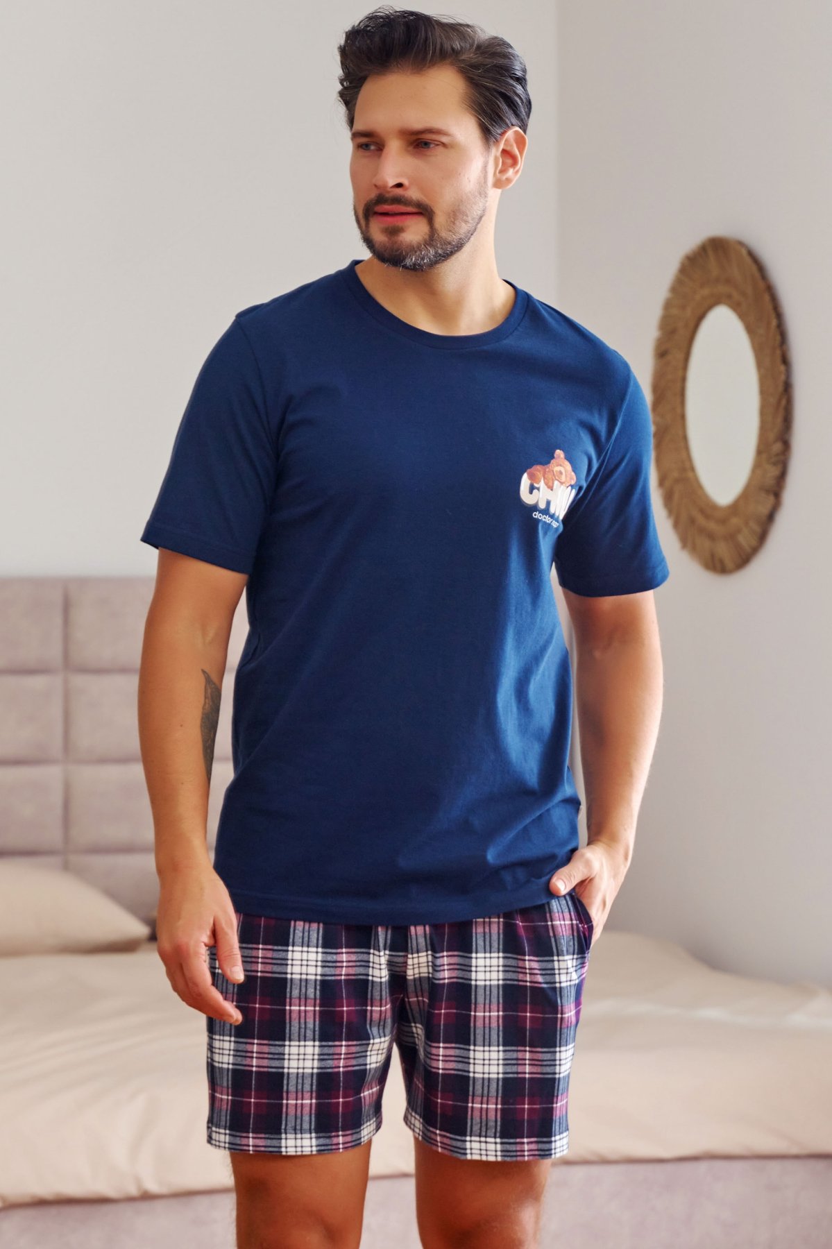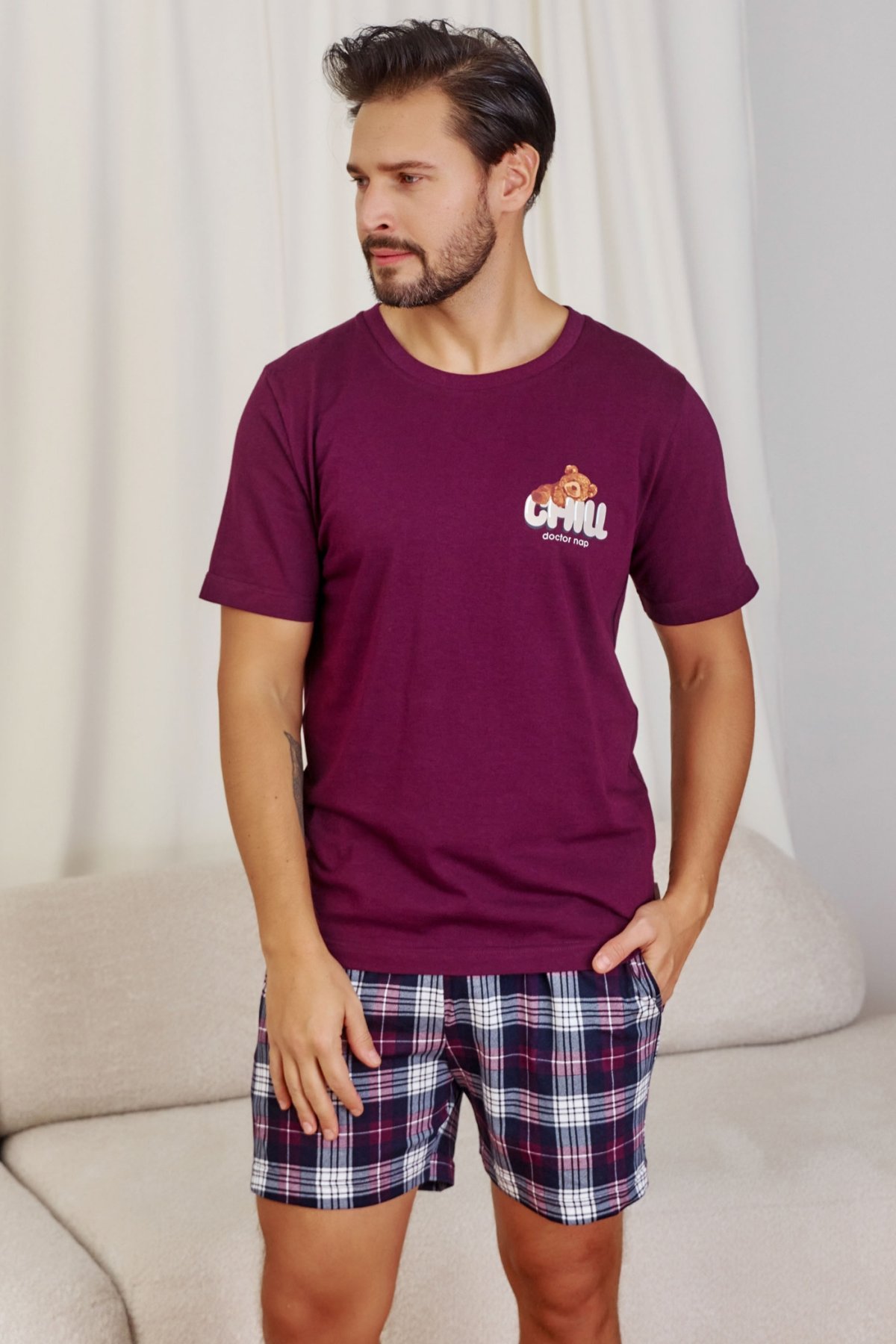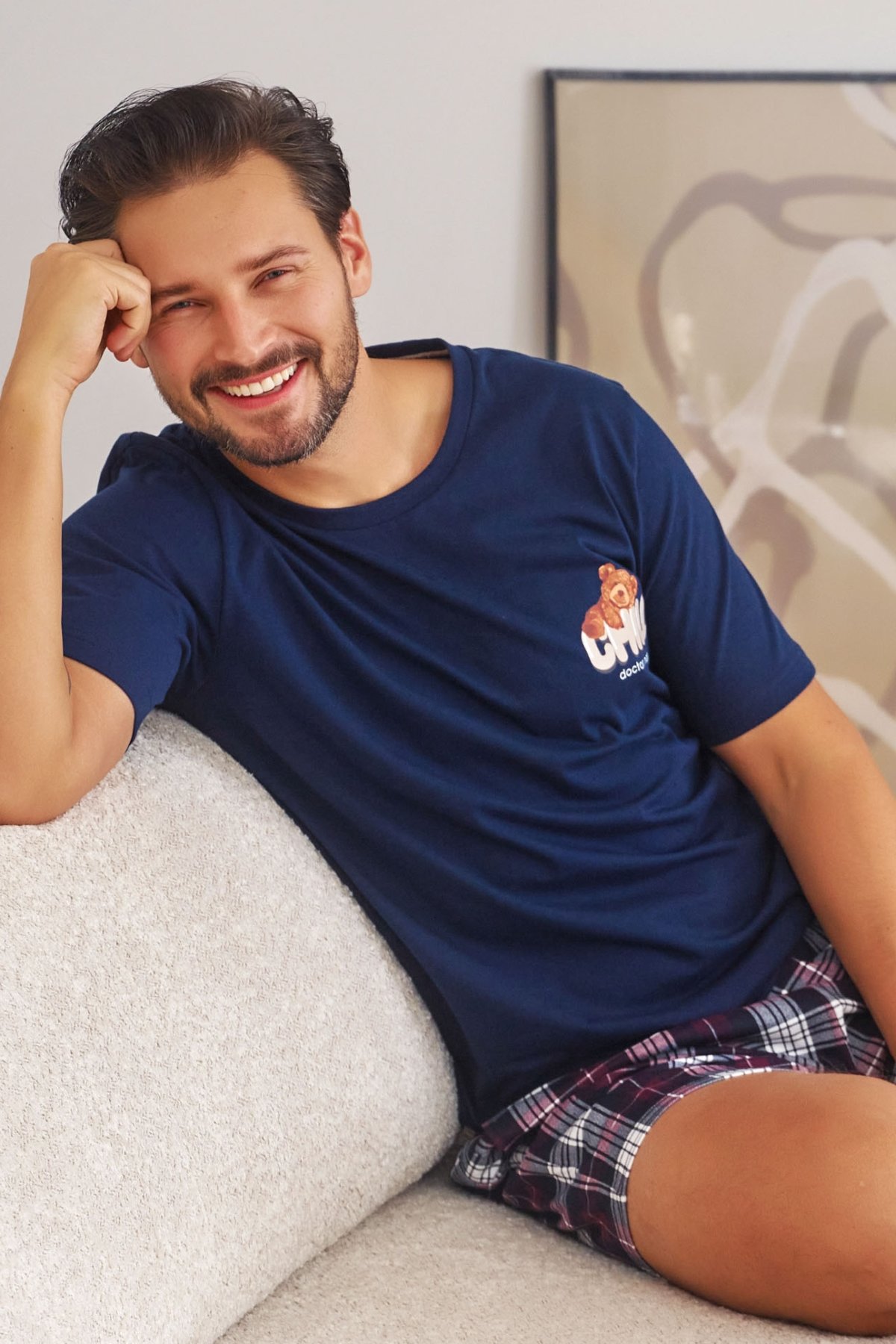 Pánské dvoudílné pyžamo kombinující jednoduchý design a funkční pohodlí. Tričko s potiskem „Chill“ je s krátkým rukávem a kulatým dekoltem. Krátké šortky s kostkovaným vzorem mají elastický pas a praktické kapsy po stranách. Pyžamo má ležérní střih, který neomezuje a je vhodné jak na spaní, tak na domácí relaxaci.