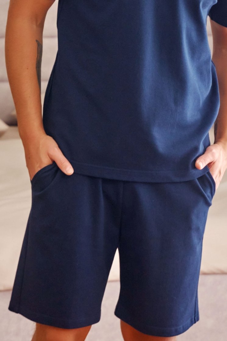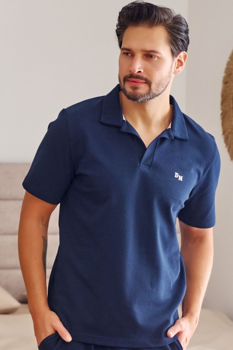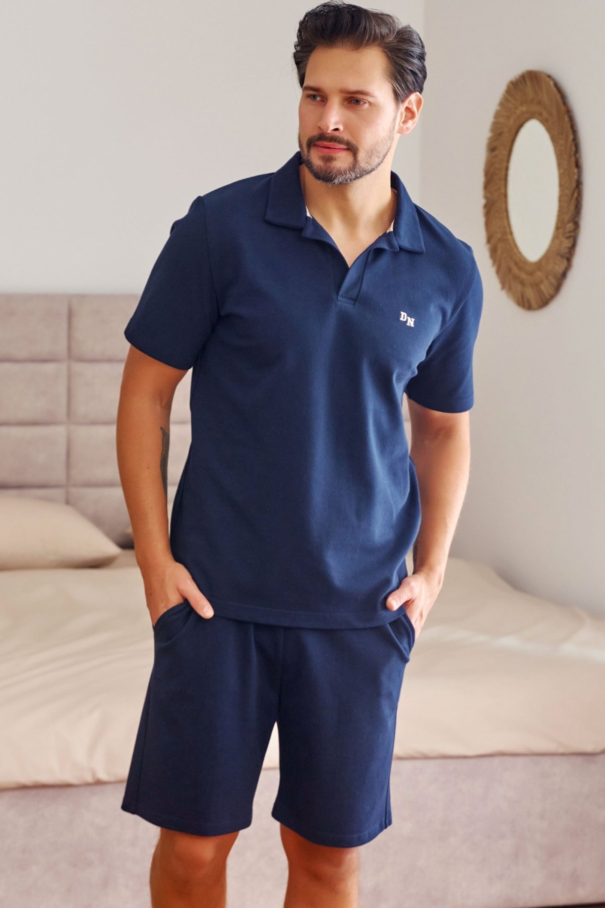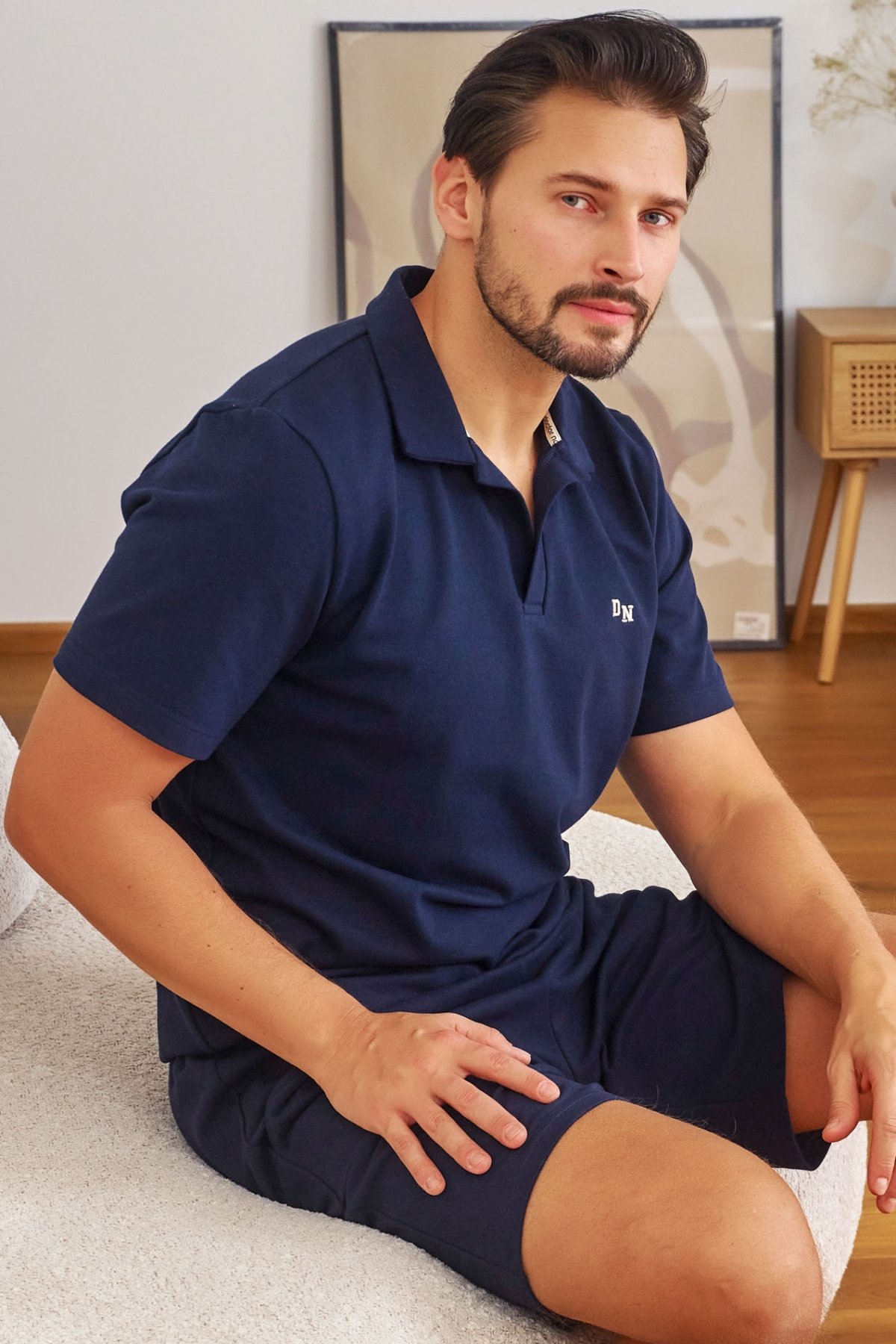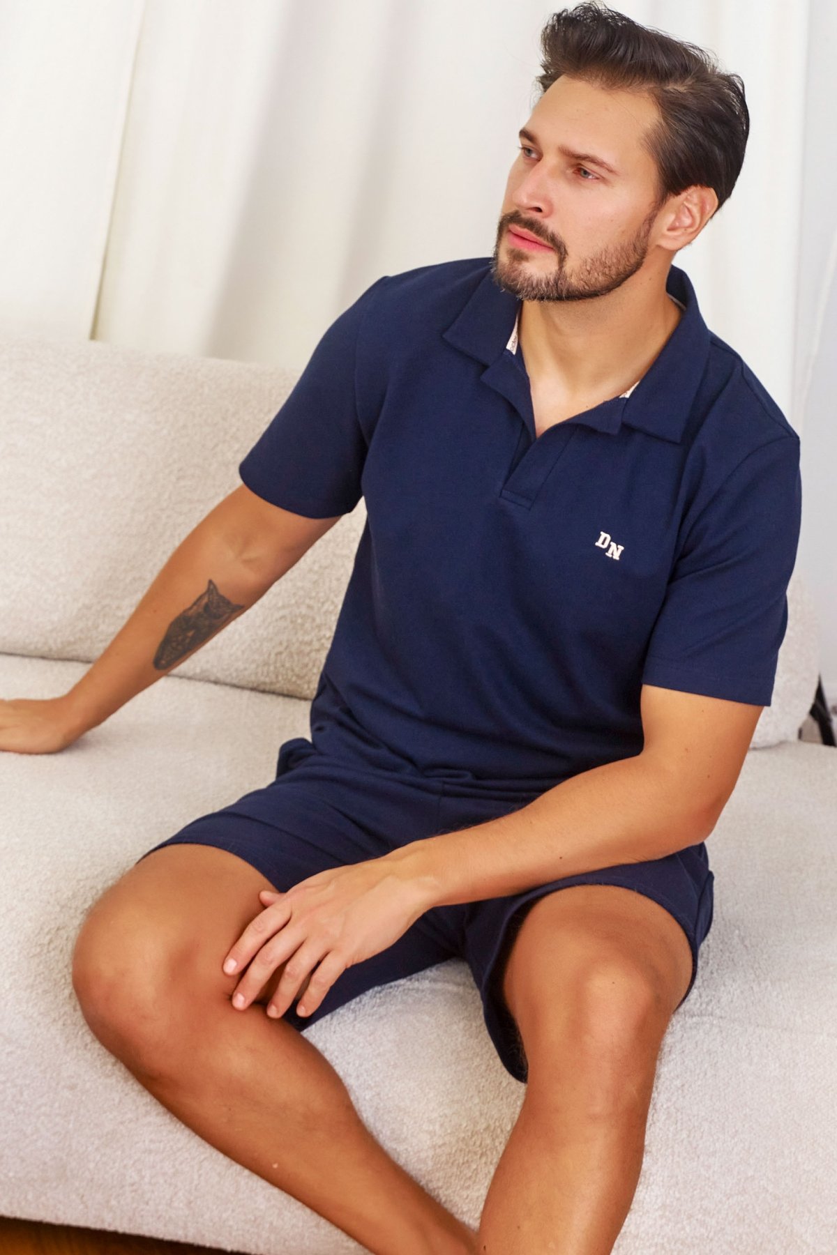 Pánské pyžamo ve stylu polo spojuje eleganci a pohodlí. Horní díl s krátkým rukávem a límečkem má klasický střih doplněný decentním logem na hrudi. Krátké šortky s kapsami a kontrastní šňůrkou v pase zajišťují pohodlí i při každodenním nošení. Materiál z měkké, prodyšné bavlny poskytuje komfort během spánku i domácího odpočinku. Pyžamo má moderní, nadčasový vzhled, který ocení muži preferující kombinaci jednoduchosti a kvality.