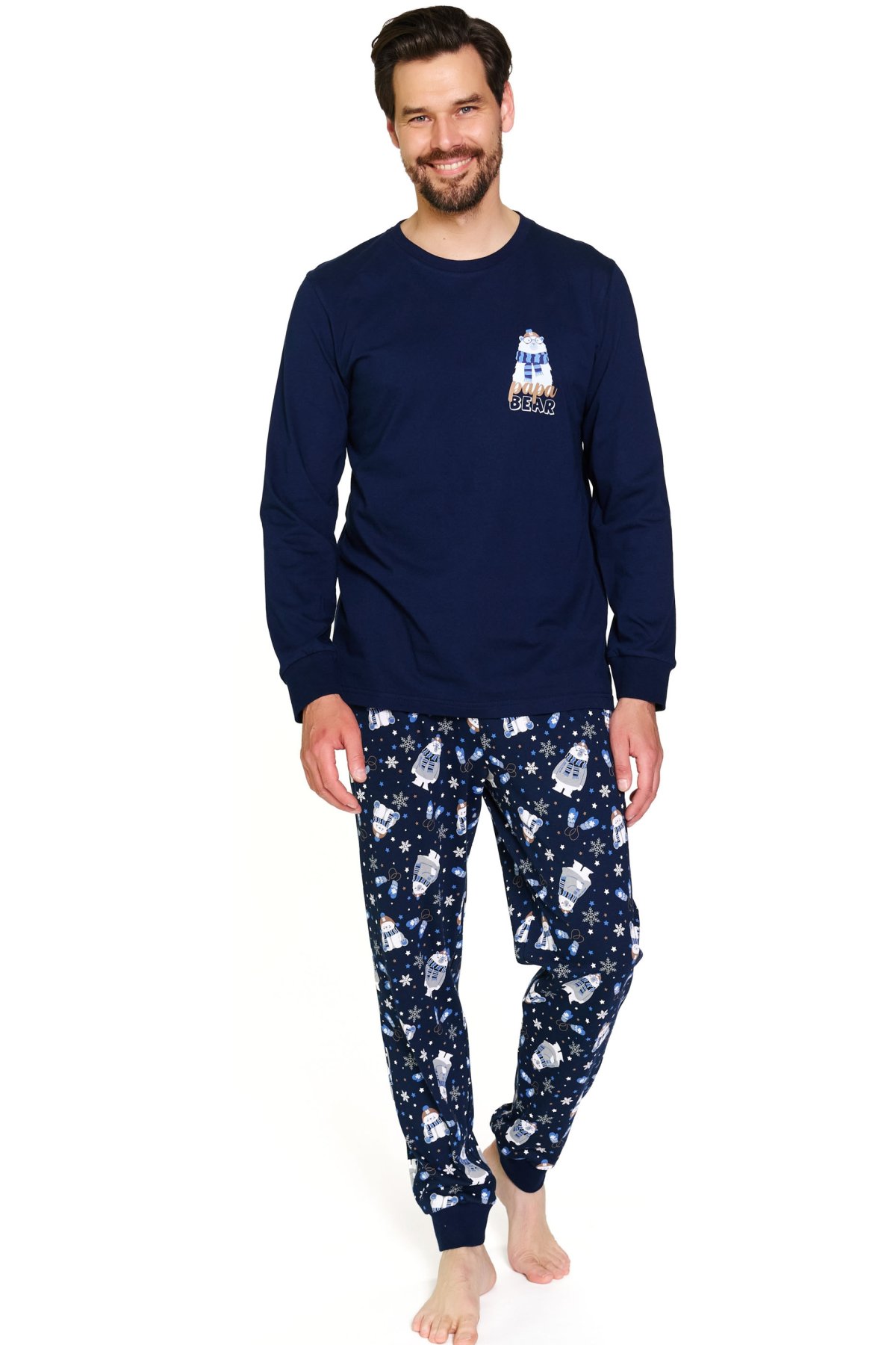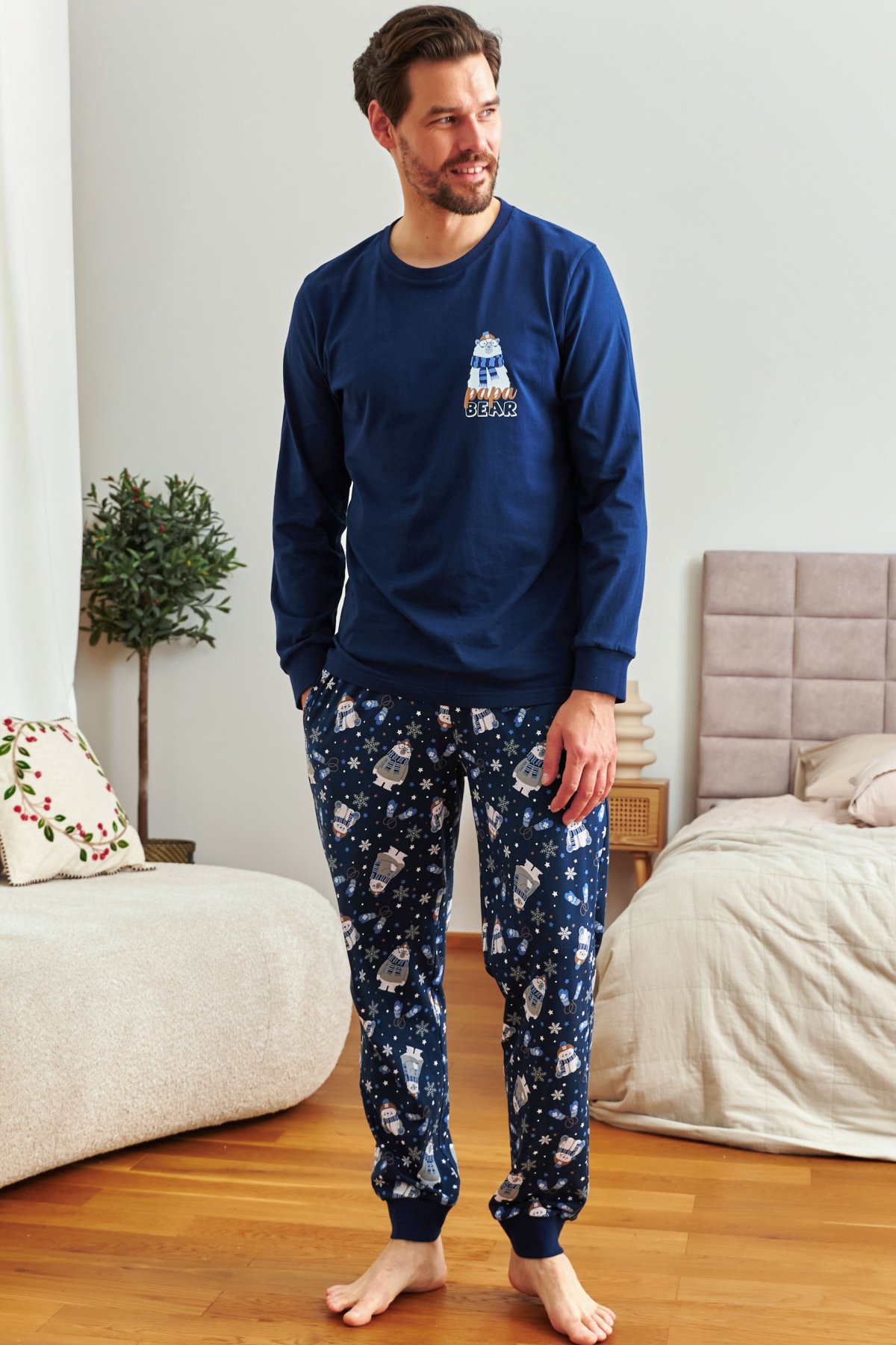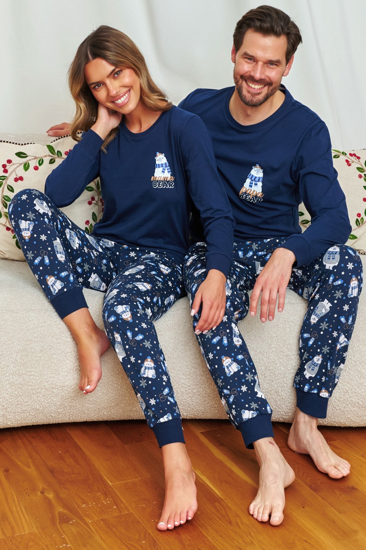 Horní díl s dlouhým rukávem zdobí přátelský motiv medvěda, který dodává kompletu uvolněný charakter, zatímco dlouhé vzorované kalhoty zajišťují pohodlí a volnost pohybu. Lehce elastický materiál se dobře přizpůsobí postavě a drží tvar i po opakovaném praní. Pyžamo je perfektní na domácí relax i klidný spánek – jednoduše nadčasový kousek, který si oblíbíte na první obléknutí.