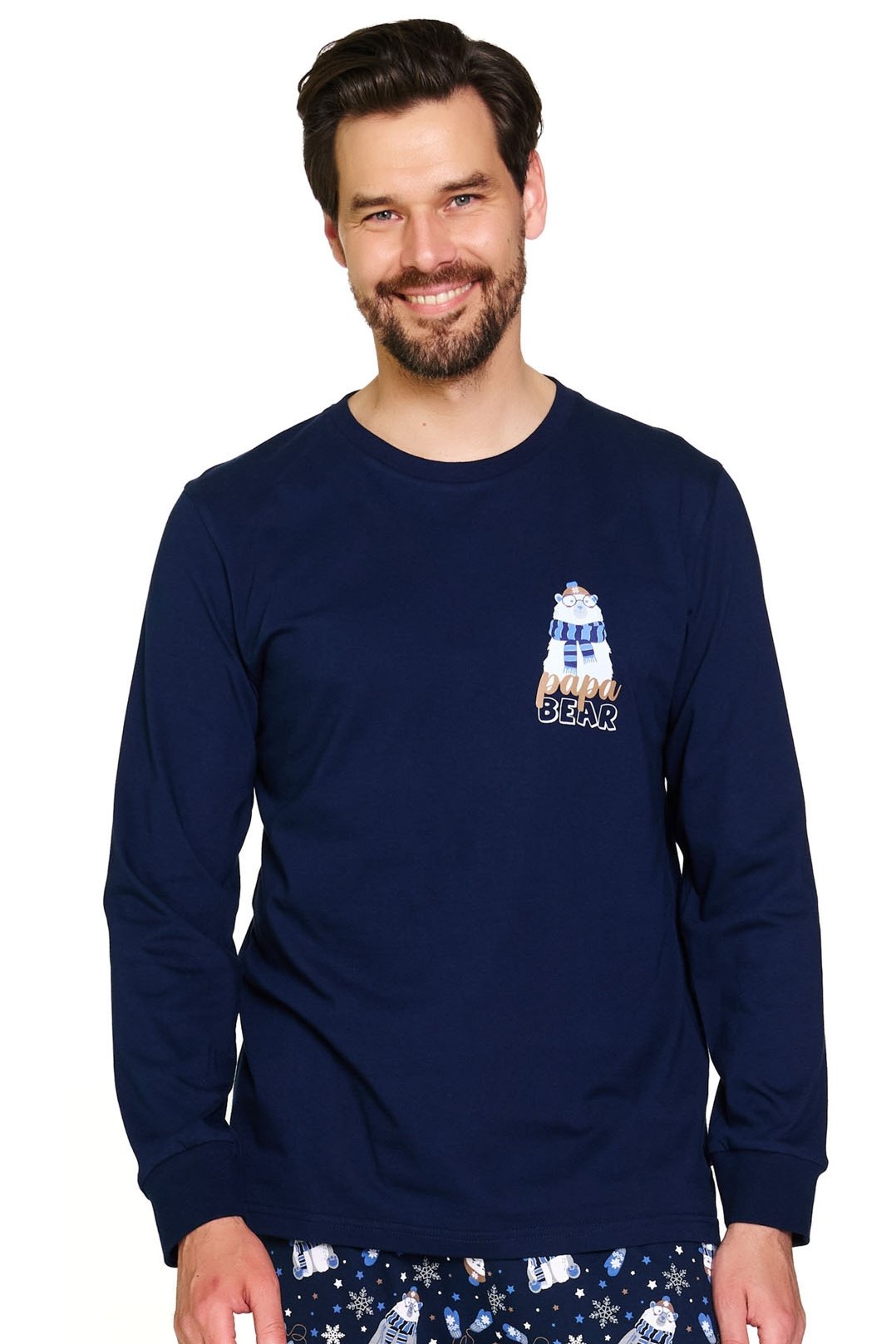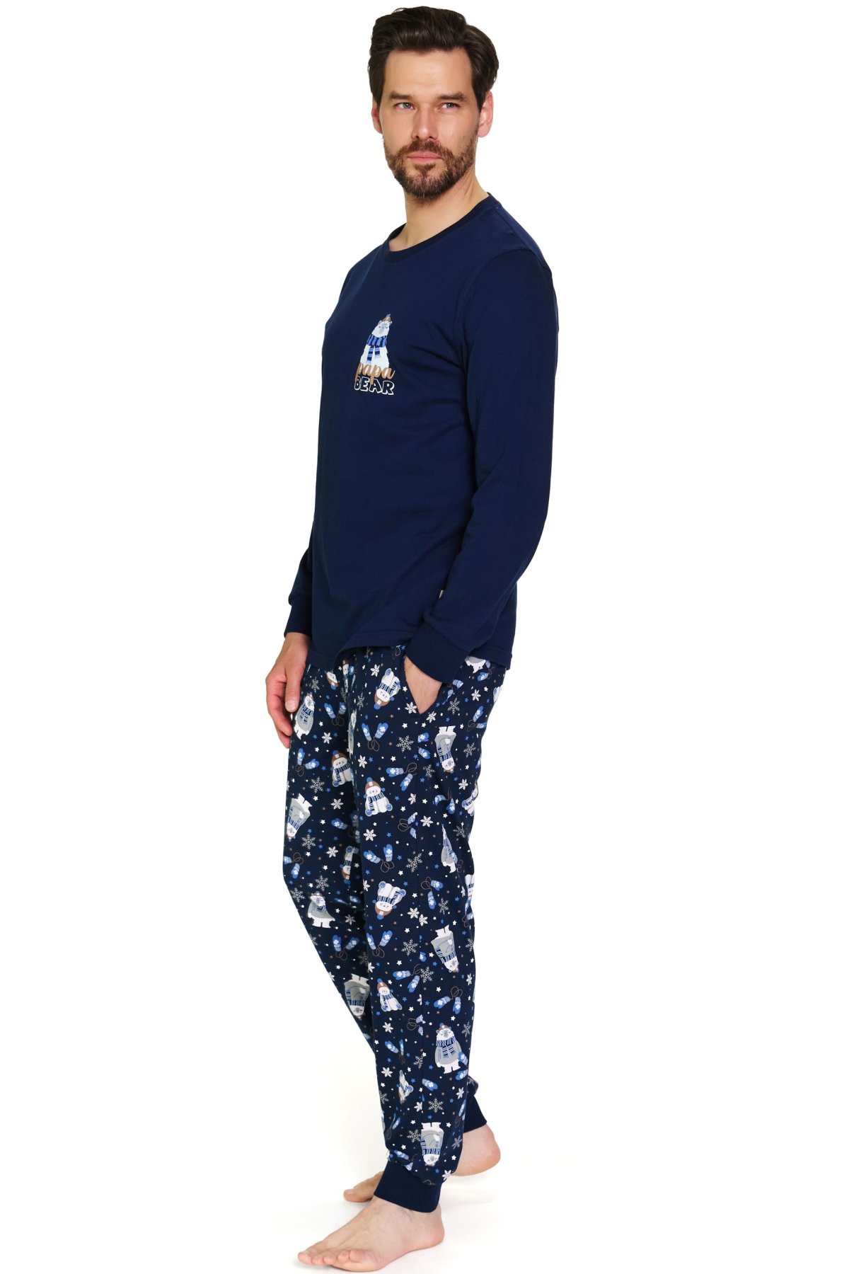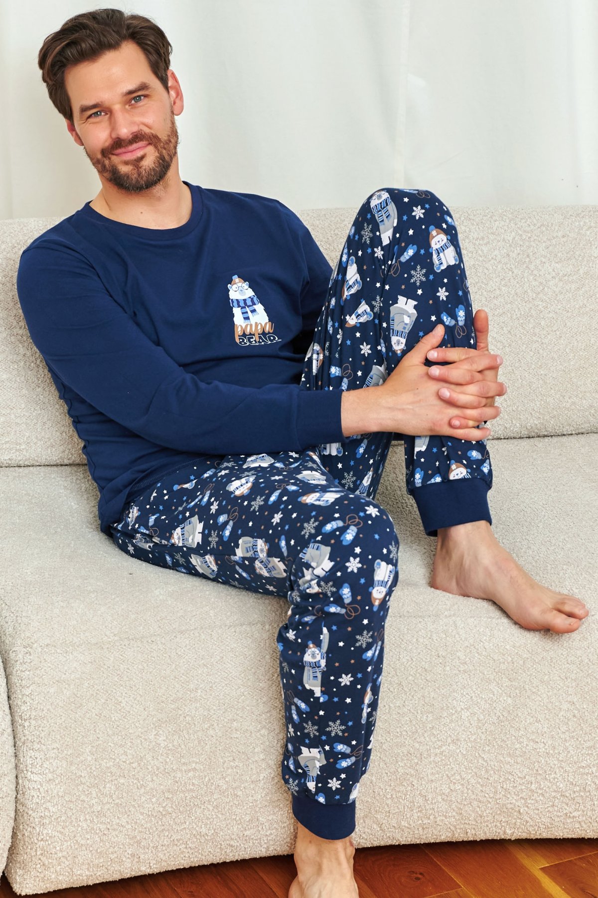 Horní díl s dlouhým rukávem zdobí přátelský motiv medvěda, který dodává kompletu uvolněný charakter, zatímco dlouhé vzorované kalhoty zajišťují pohodlí a volnost pohybu. Lehce elastický materiál se dobře přizpůsobí postavě a drží tvar i po opakovaném praní. Pyžamo je perfektní na domácí relax i klidný spánek – jednoduše nadčasový kousek, který si oblíbíte na první obléknutí.