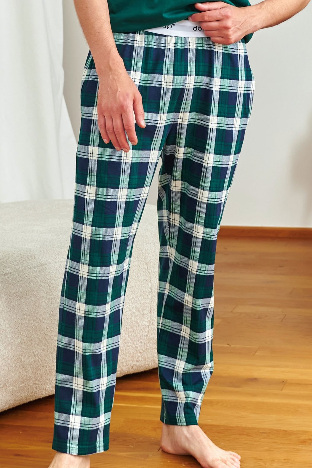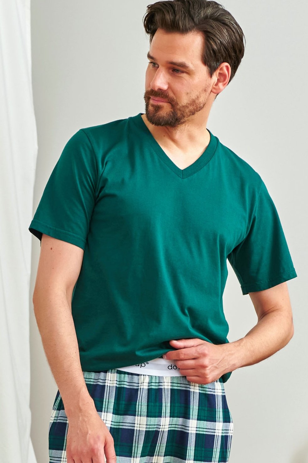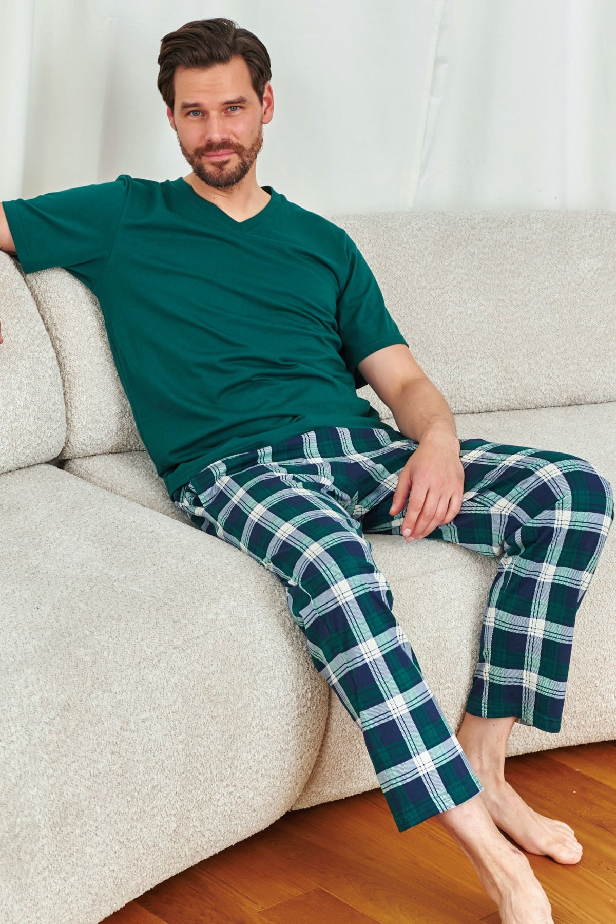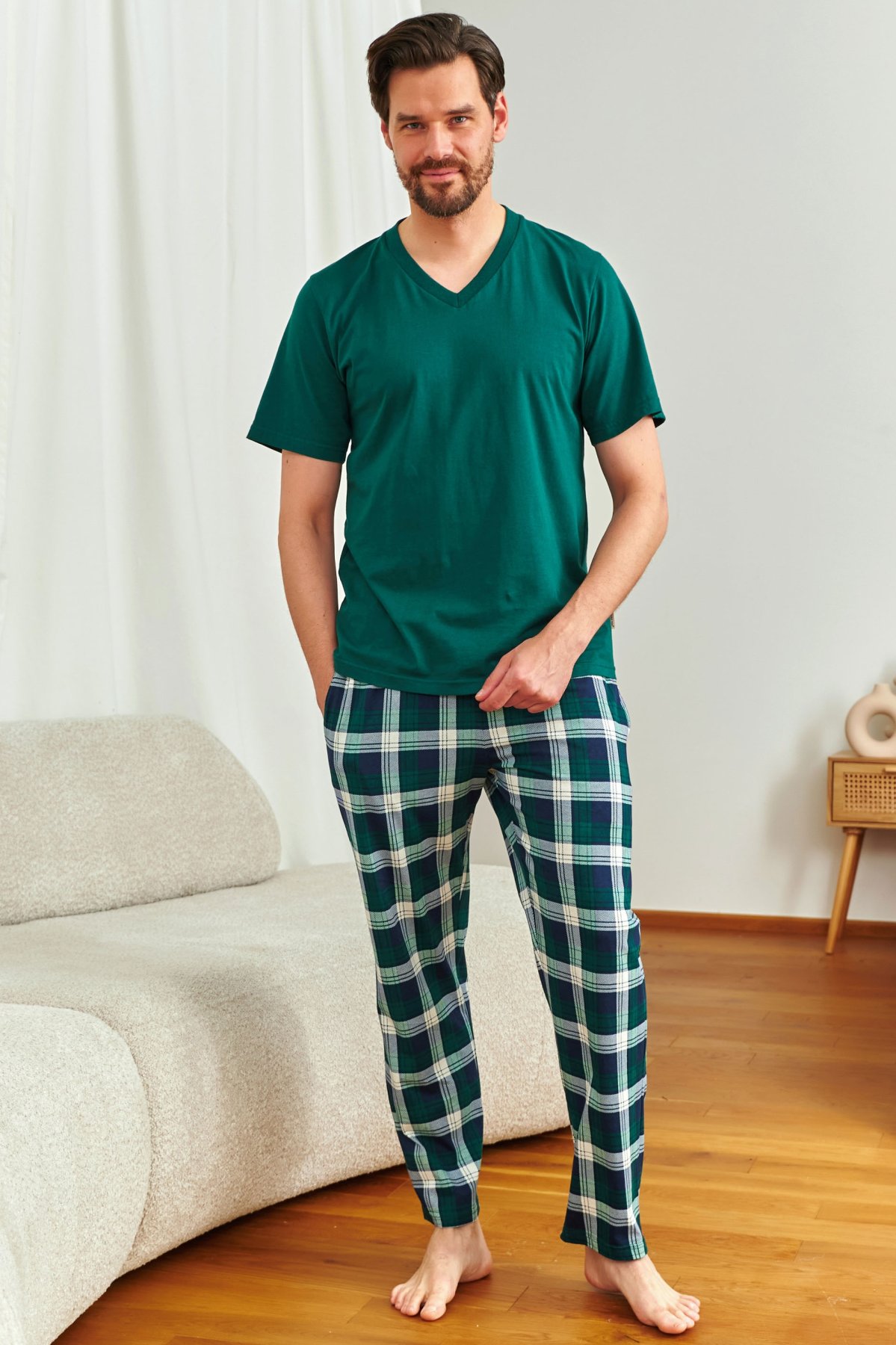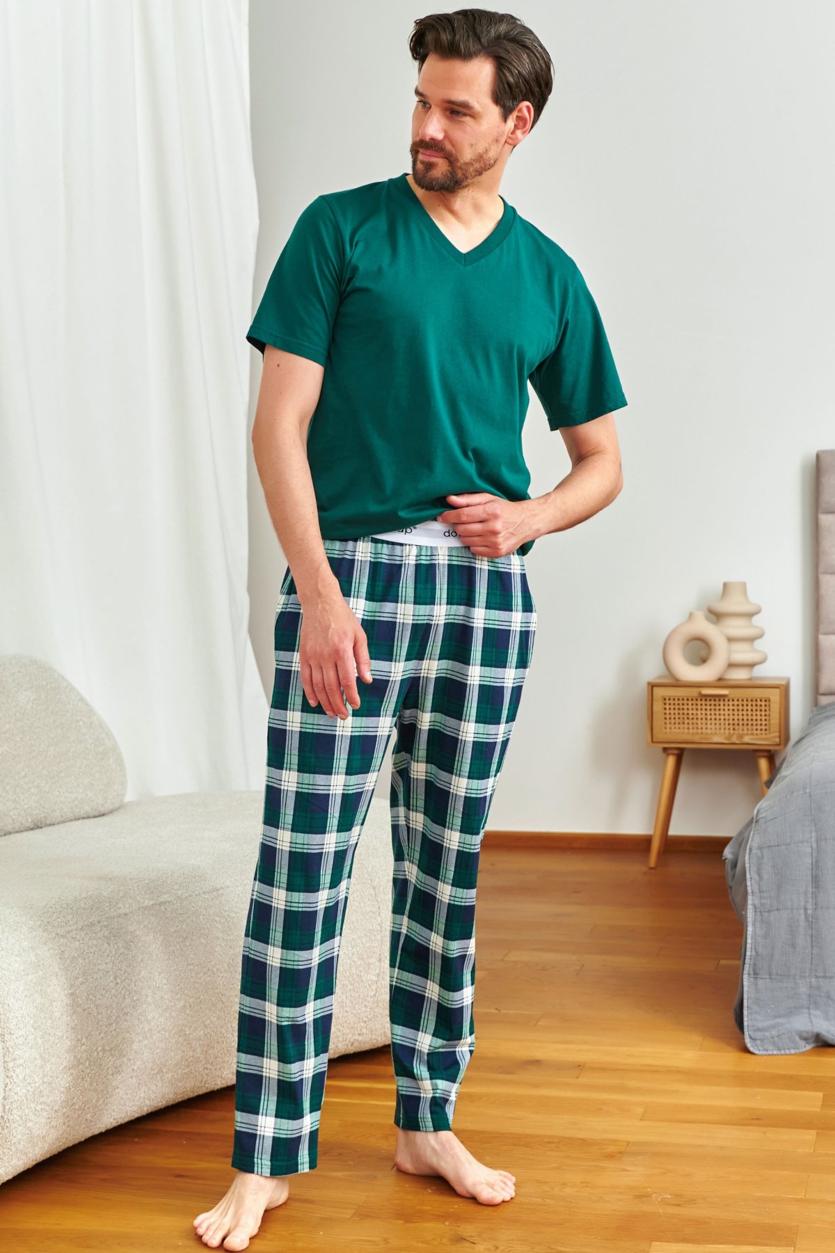 Lehká bavlna je šetrná k pokožce, takže se budete cítit komfortně po celou noc. Zelené tričko s výstřihem do „V“ působí moderně a nenuceně, dlouhé kostkované kalhoty přidávají nadčasový šmrnc. Elastický pas s ozdobnou gumou drží spolehlivě na místě, aniž by tlačil, a poskytuje volnost pohybu při spaní i domácím relaxu. Pyžamo snadno zkombinujete se županem či druhým modelem z téže kolekce – vytvoříte tak sladěný a praktický homewear set. Ideální volba pro muže, kteří hledají pohodlí, kvalitní materiál a čistý, klasický design v jednom.