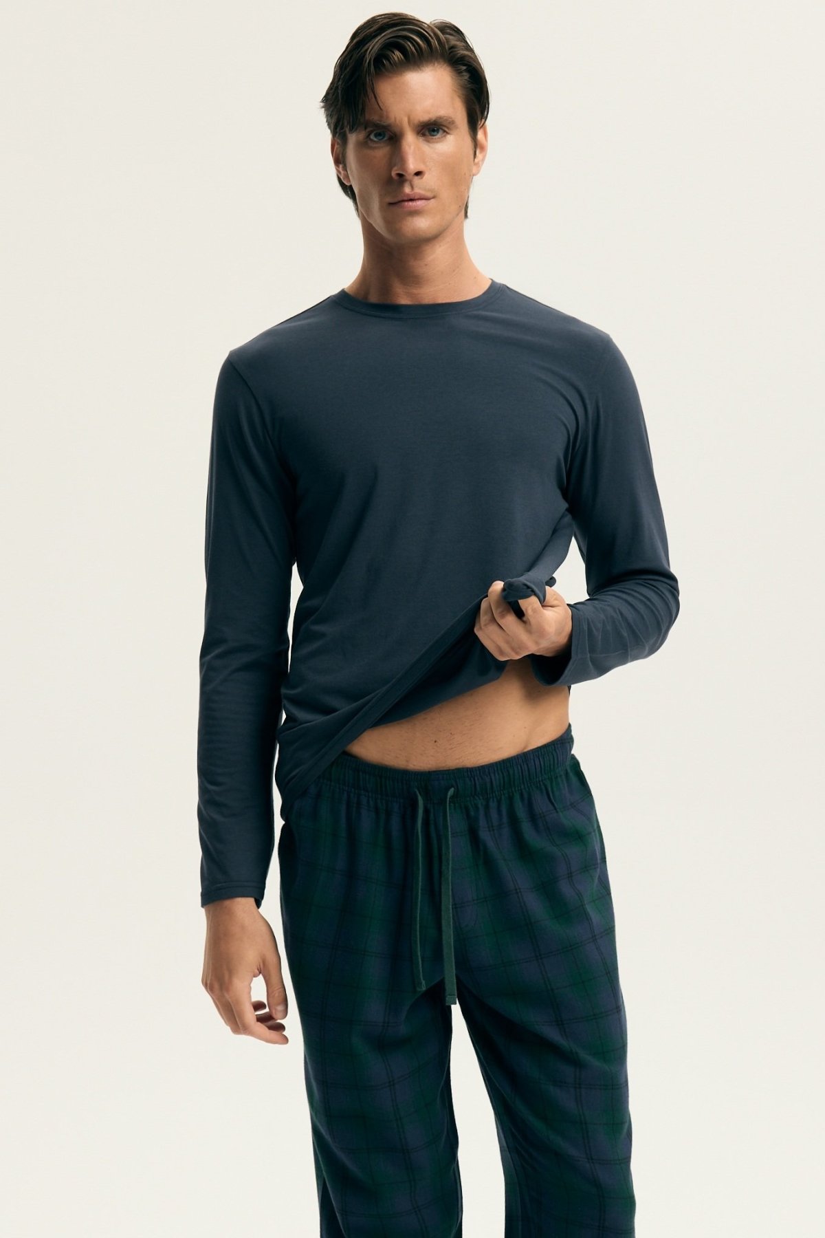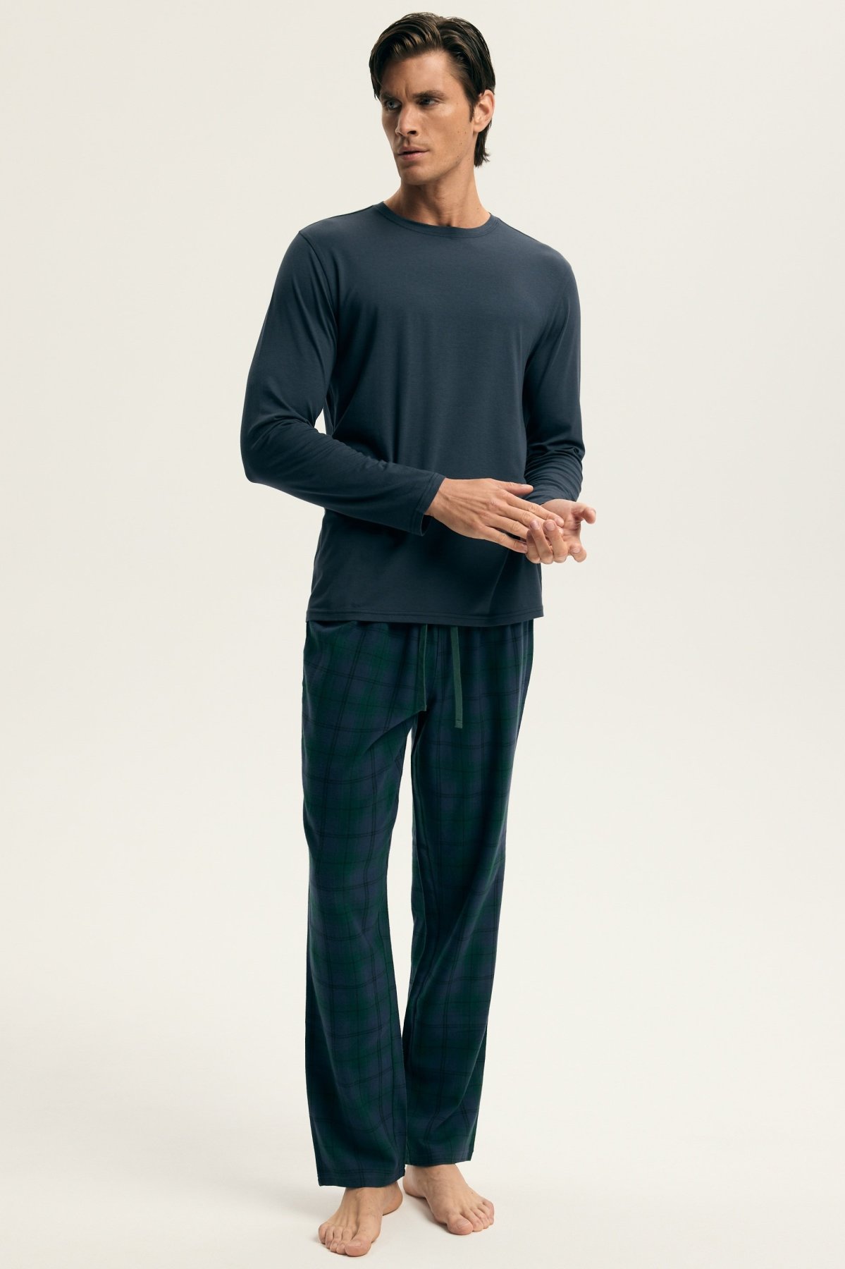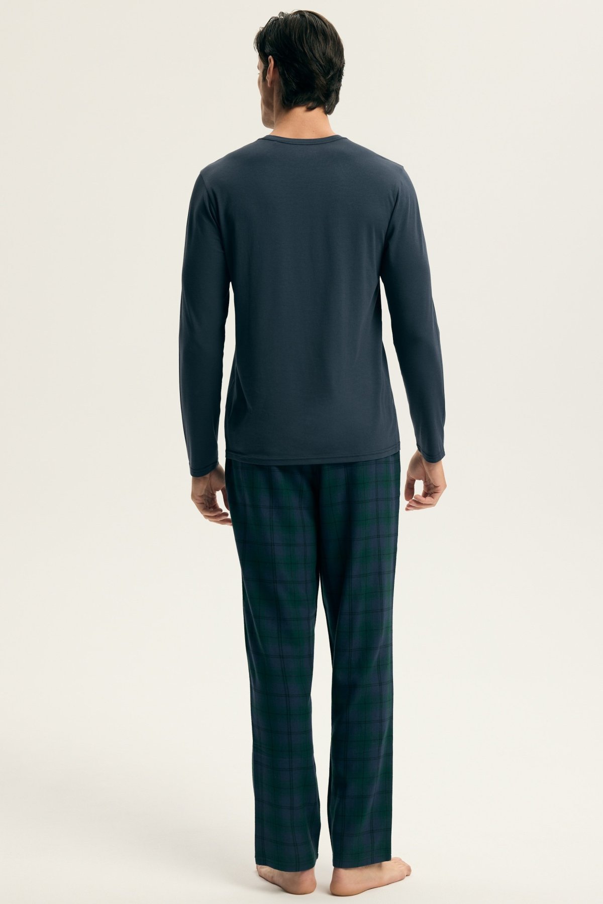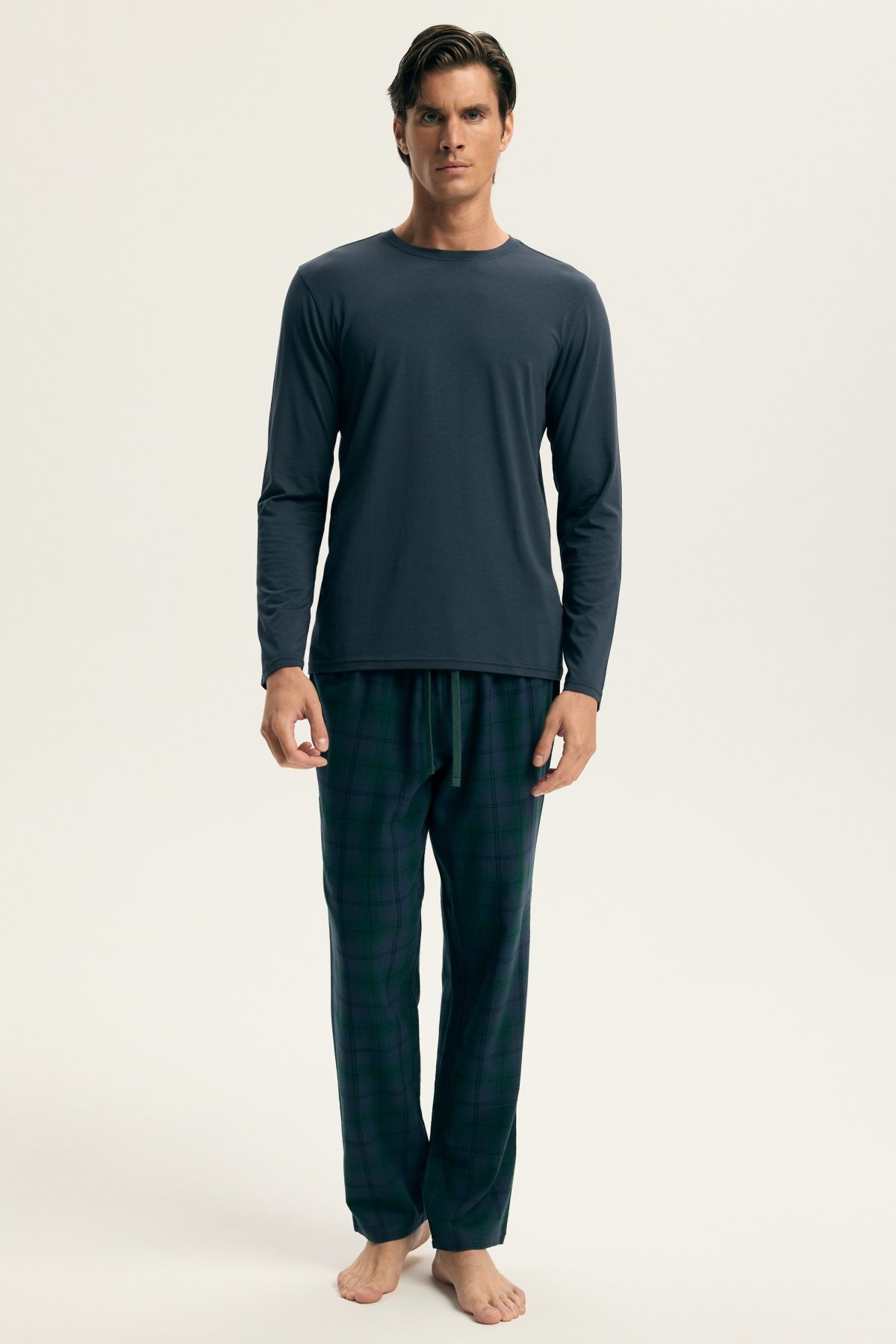 Pánské pyžamo Annex představuje ideální rovnováhu mezi komfortem a kvalitou. Jednobarevný horní díl z bavlny a modalu je výjimečně měkký, pružný a prodyšný, díky čemuž se dokonale přizpůsobí tělu a poskytne maximální pohodlí během noci. Spodní část tvoří kostkované kalhoty z přírodní bavlny, které umožňují pokožce volně dýchat a přinášejí příjemný pocit svěžesti. Elastický pas doplňují stahovací šňůrky.