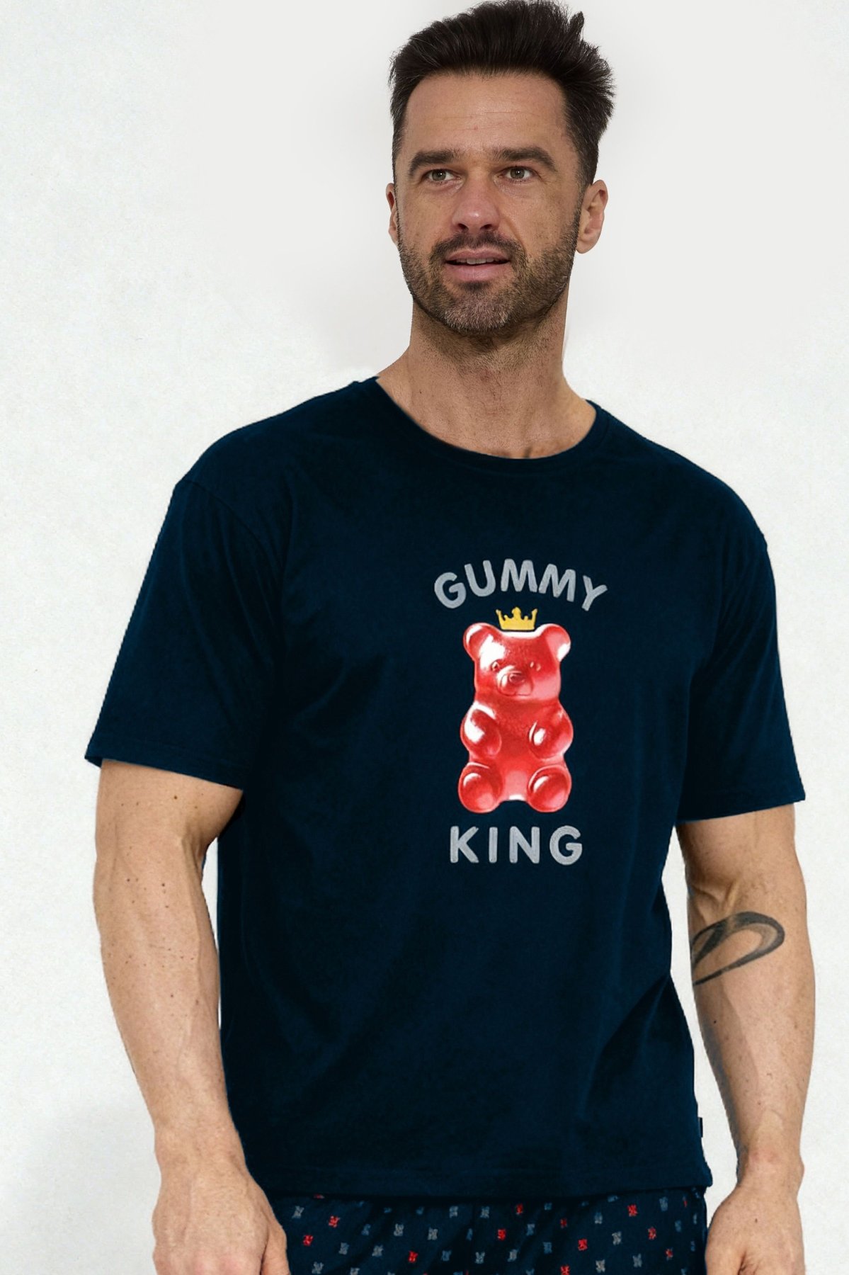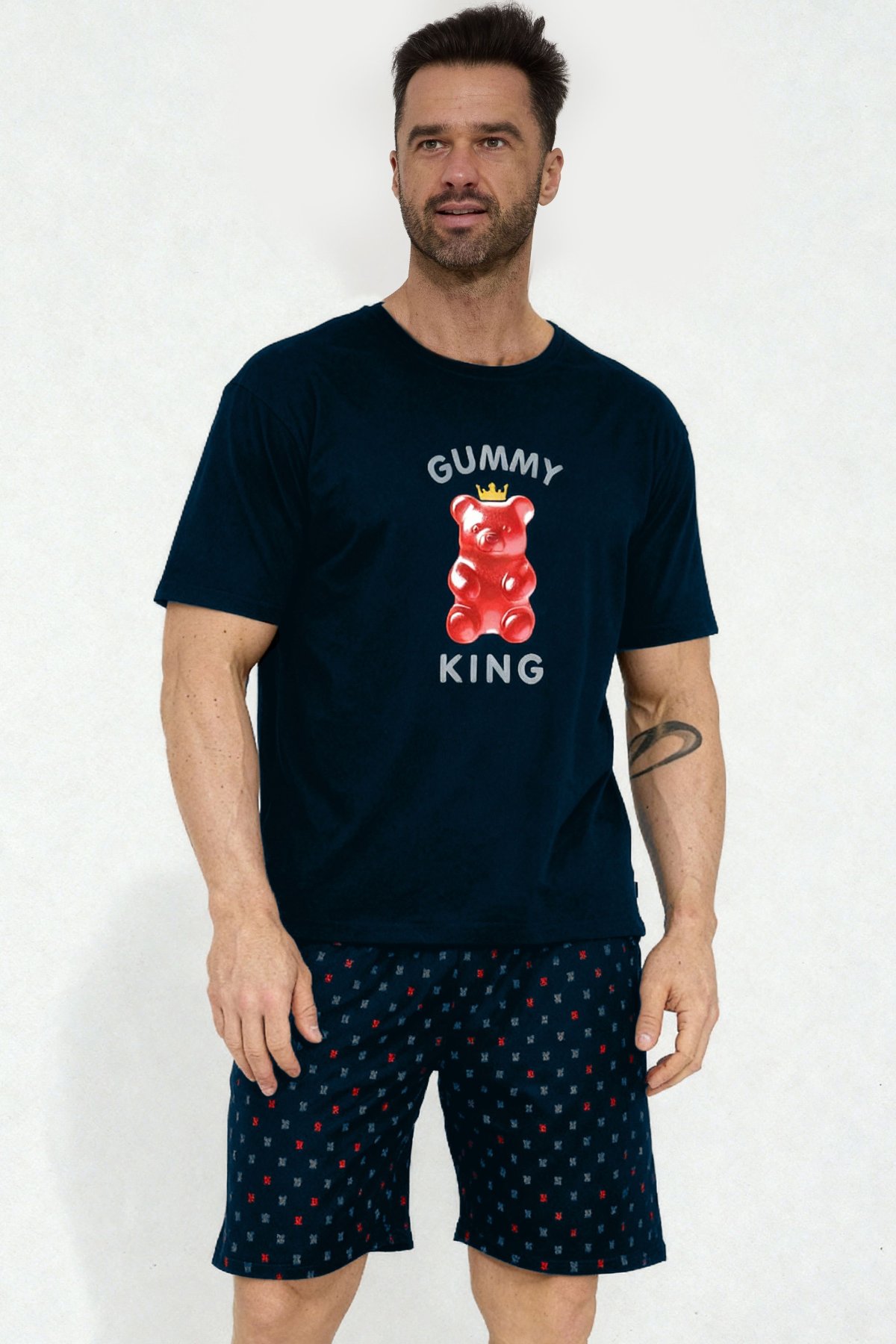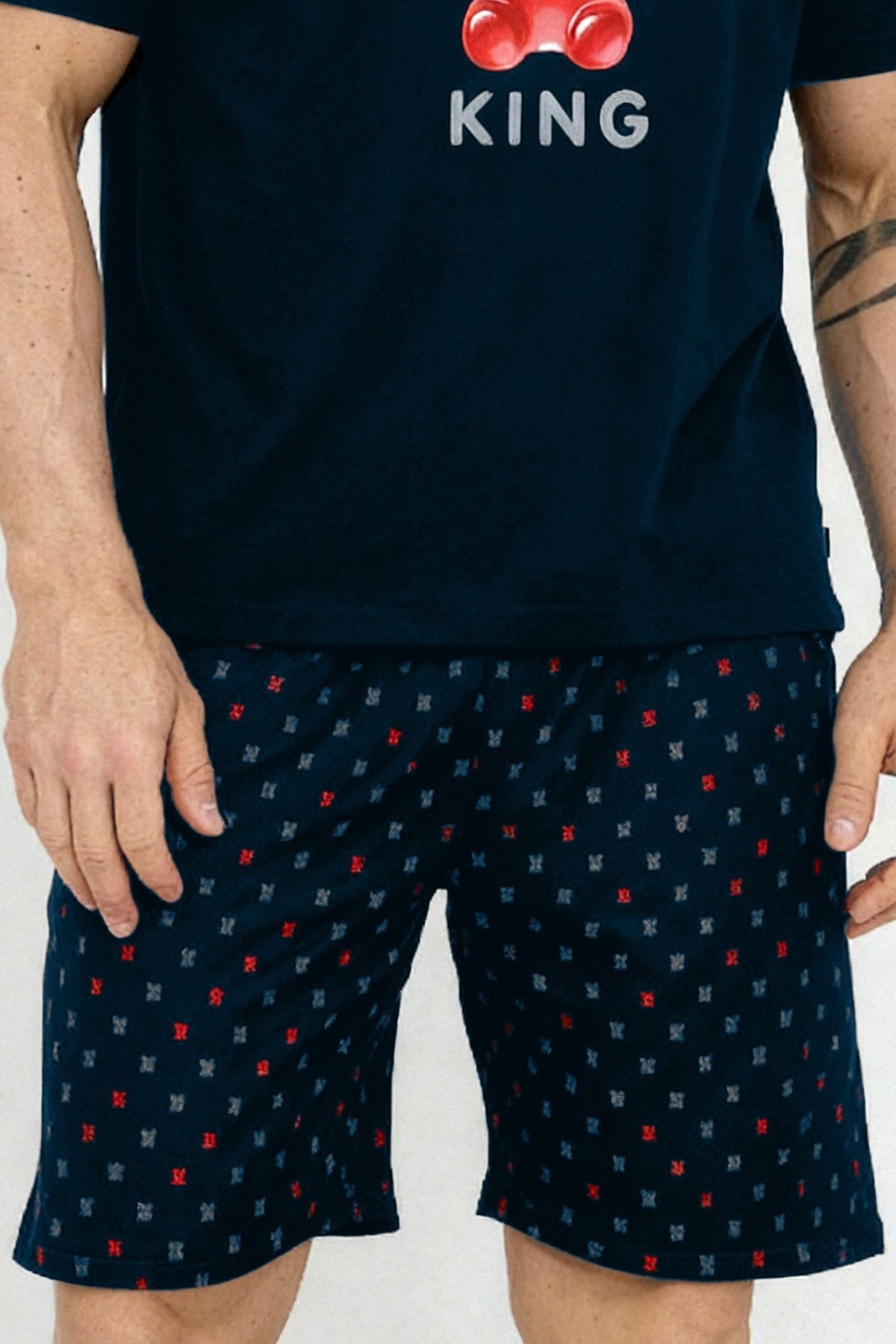 Pánské pyžamo Gummy King přináší spojení zábavy, pohodlí a kvality. Tmavě modré tričko zdobí veselý motiv gumového medvídka, který dodává outfitu originální a hravý charakter. Krátké šortky s barevným potiskem perfektně ladí s horním dílem a zaručují pohodlí i volnost pohybu. Měkký bavlněný materiál je prodyšný a příjemný na dotek, takže se v pyžamu budete cítit skvěle po celou noc. Ideální volba pro muže, kteří mají smysl pro humor a chtějí se cítit dobře nejen ve dne, ale i během spánku.