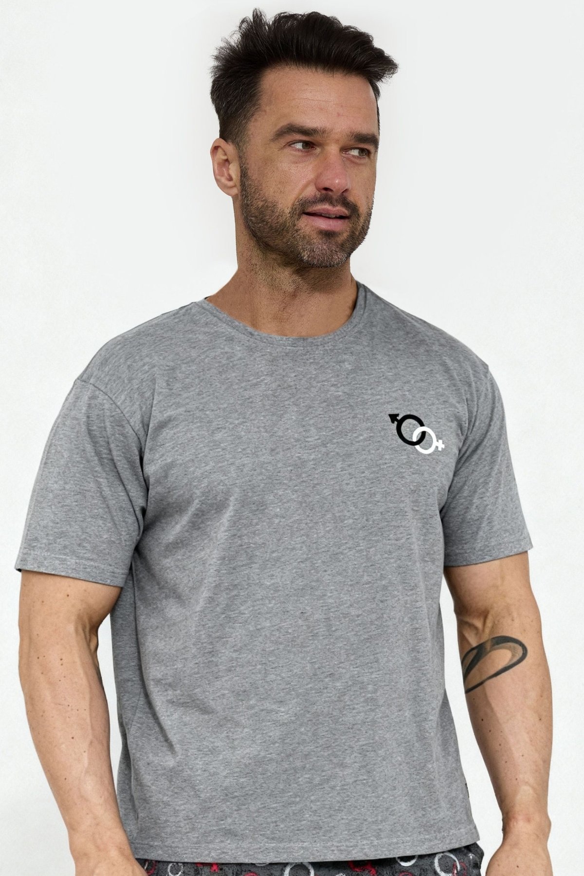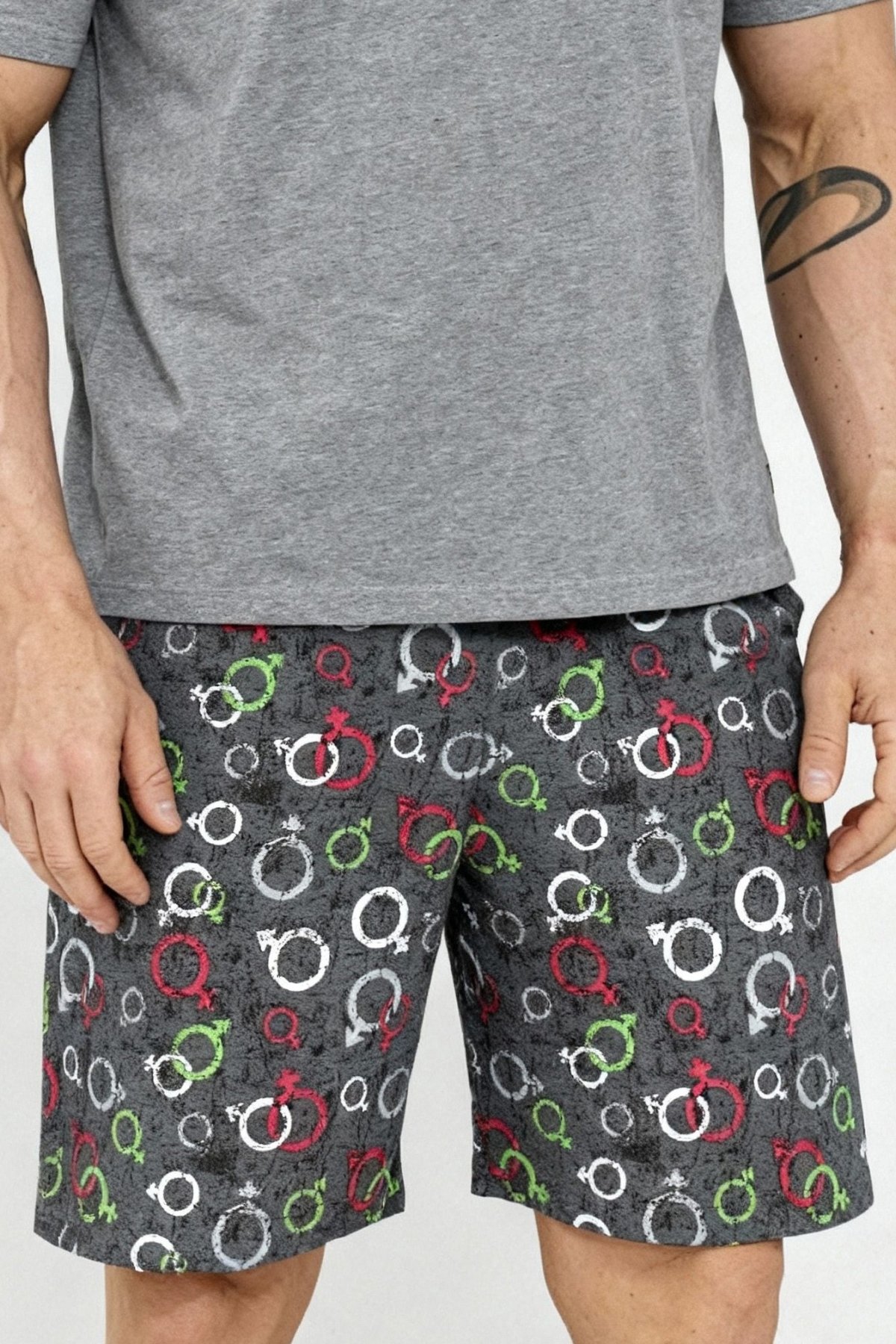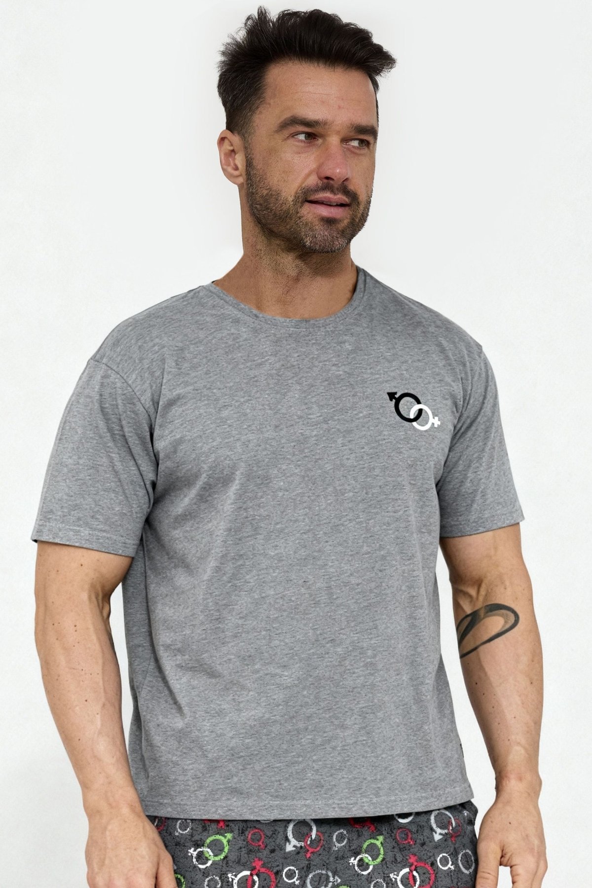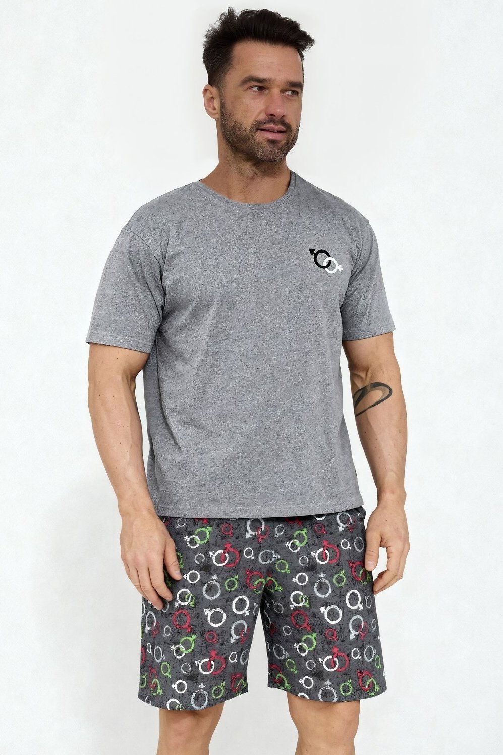 Pánské pyžamo Love Symbols spojuje moderní design s maximálním pohodlím. Jednoduché šedé tričko s krátkým rukávem doplňuje drobný potisk na hrudi, který dodává modelu decentní, ale osobitý vzhled. Krátké šortky s hravým vzorem vytvářejí zajímavý kontrast a zaručují volnost pohybu. Díky měkké bavlně je pyžamo příjemné na dotek, prodyšné a vhodné pro každodenní nošení. Elastický pas se dokonale přizpůsobí postavě a netlačí, což zaručuje pohodlí po celou noc. Tento model je ideální pro muže, kteří preferují ležérní styl a kvalitní zpracování.