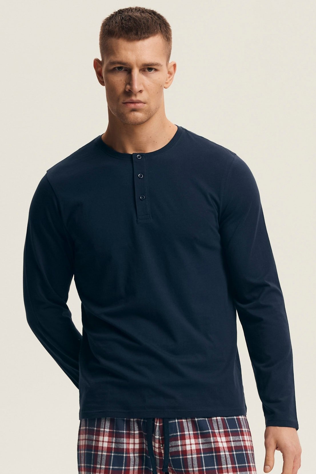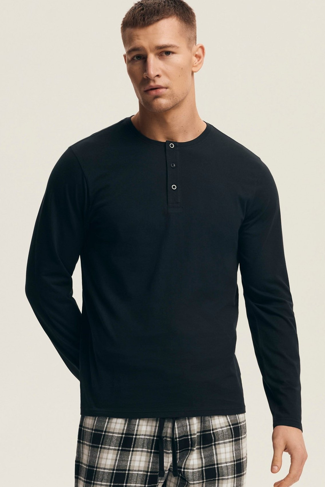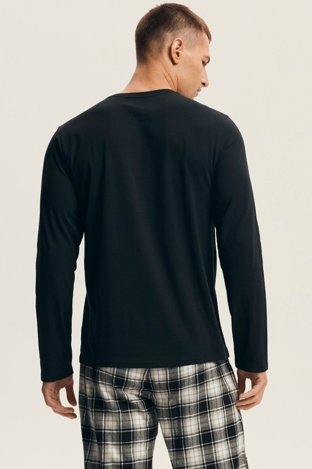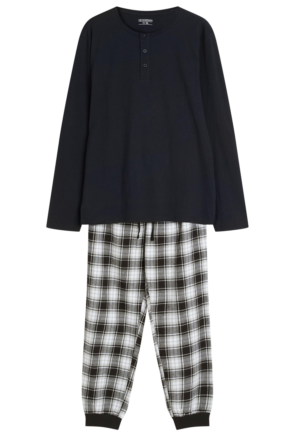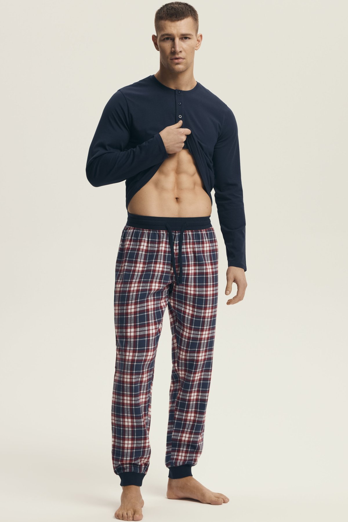 Pánské pyžamo Noir spojuje klasiku s moderním pohodlím. Měkká bavlněná tkanina je prodyšná a příjemná na dotek, díky čemuž poskytuje komfort po celou noc. Jednobarevné tričko s dlouhým rukávem a zapínáním u krku na knoflíčky působí elegantně a uvolněně zároveň. Dlouhé flanelové kalhoty s kostkovaným vzorem doplňuje elastický pas s regulací na šňůrku a praktické žebrované lemy na nohavicích, které zajišťují stabilní padnutí. Pyžamo je ideální volbou pro chladnější období – hřejivé, stylové a maximálně pohodlné.