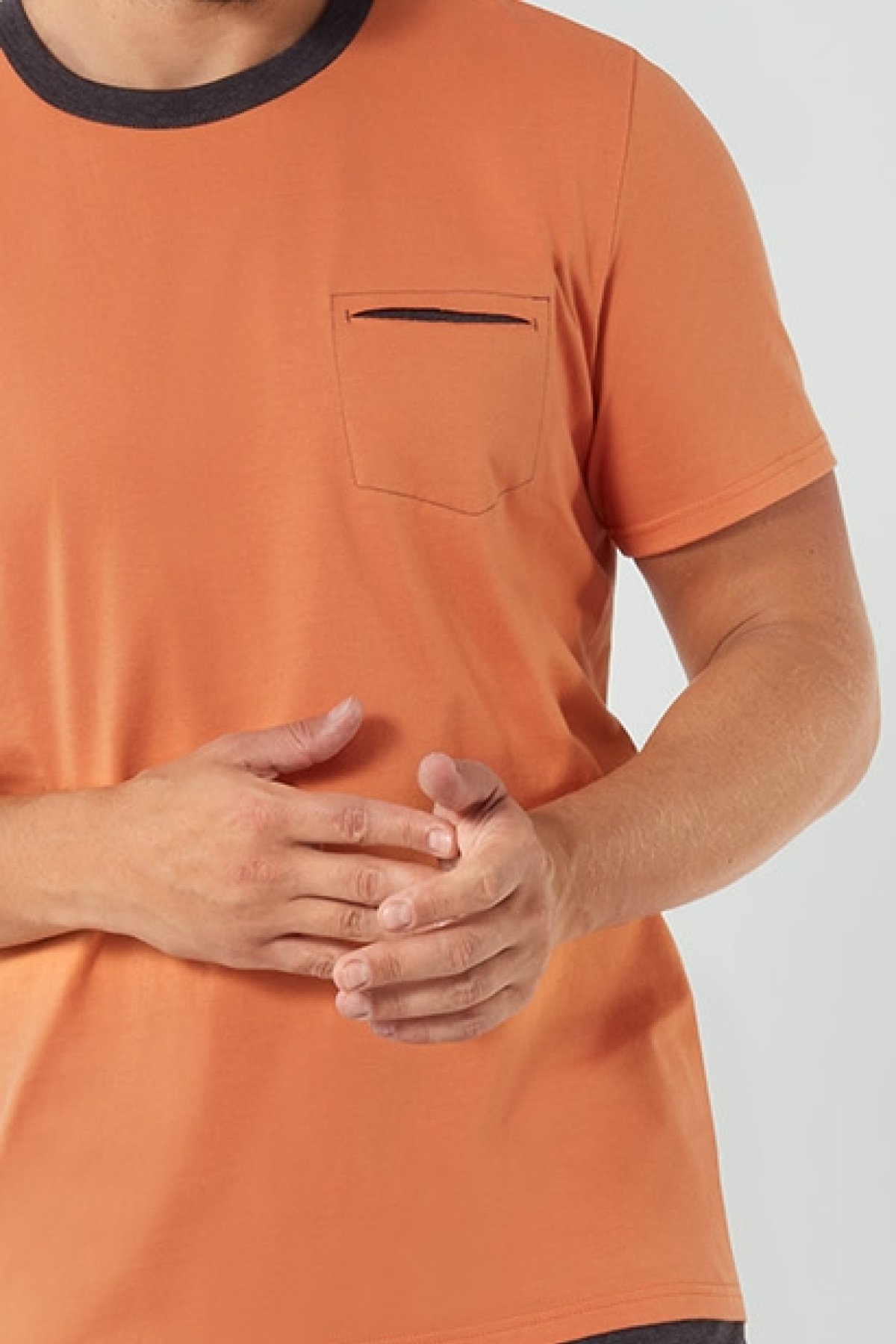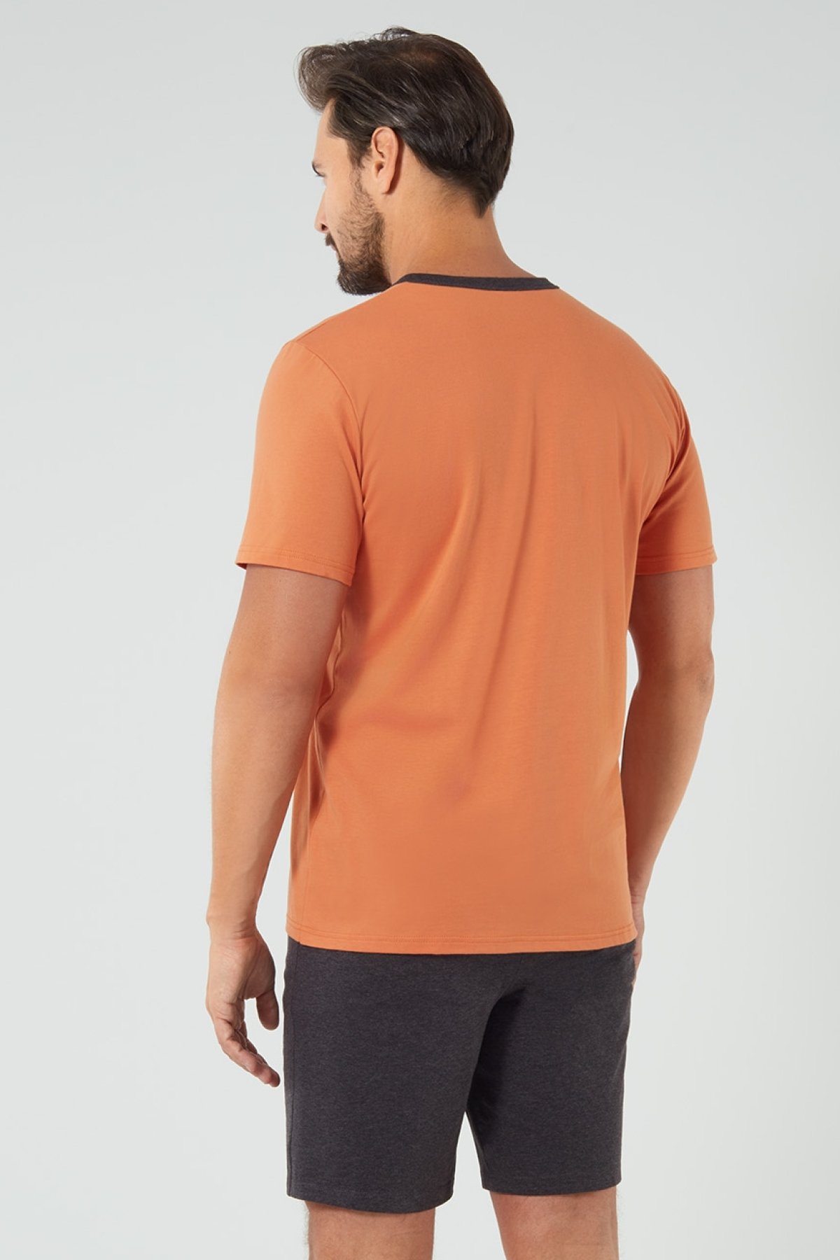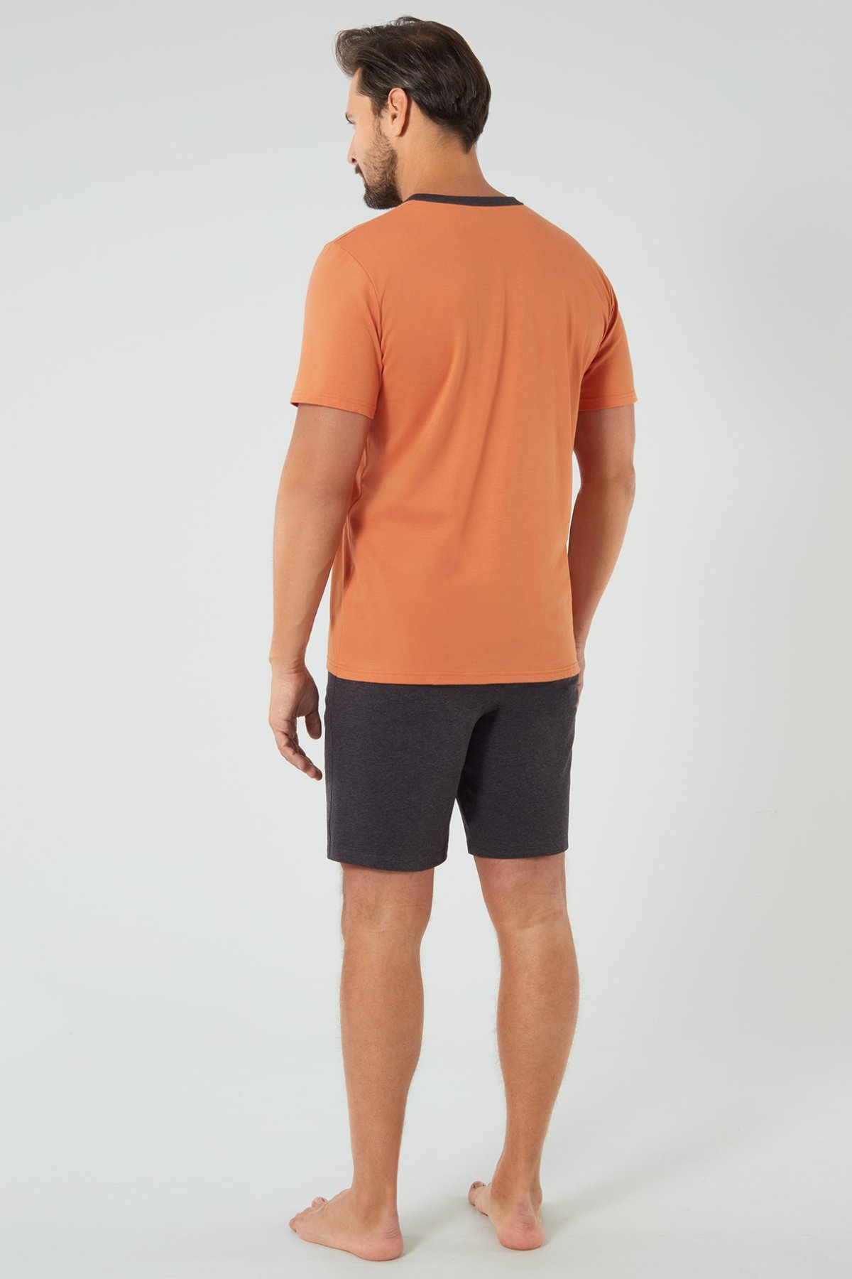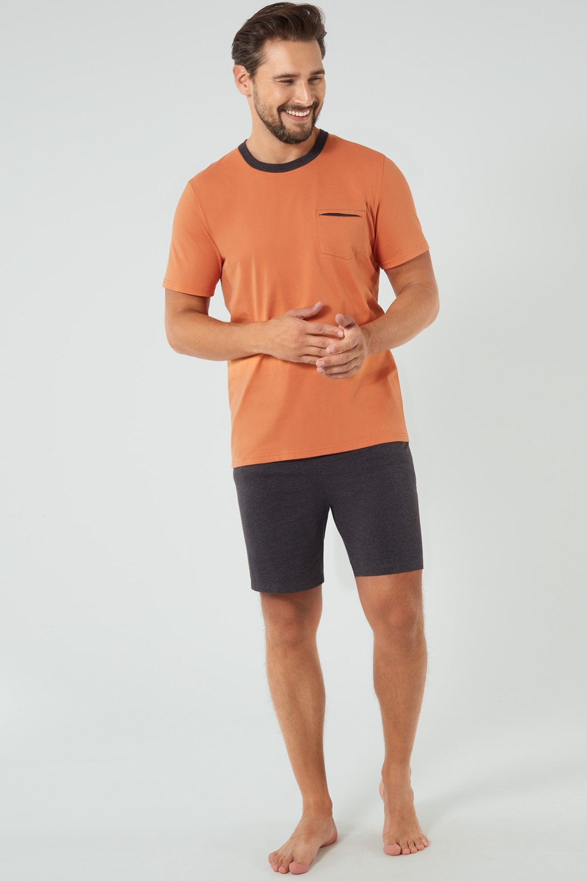 Pánské pyžamo s krátkým rukávem a šortkami pro pohodlné nošení po celý rok. Volnější, rovný střih spolu s netlačící gumou v pase zajišťuje volnost pohybu, dobře sedí na různých typech postavy a je velmi příjemné při nošení. Pyžamo je ušité z bavlněného úpletu, který je prodyšný, měkký a příjemný na dotek. Horní díl je z hladkého materiálu a doplňuje ho ozdobná náprsní kapsička. Šortky jsou z hladkého materiálu.