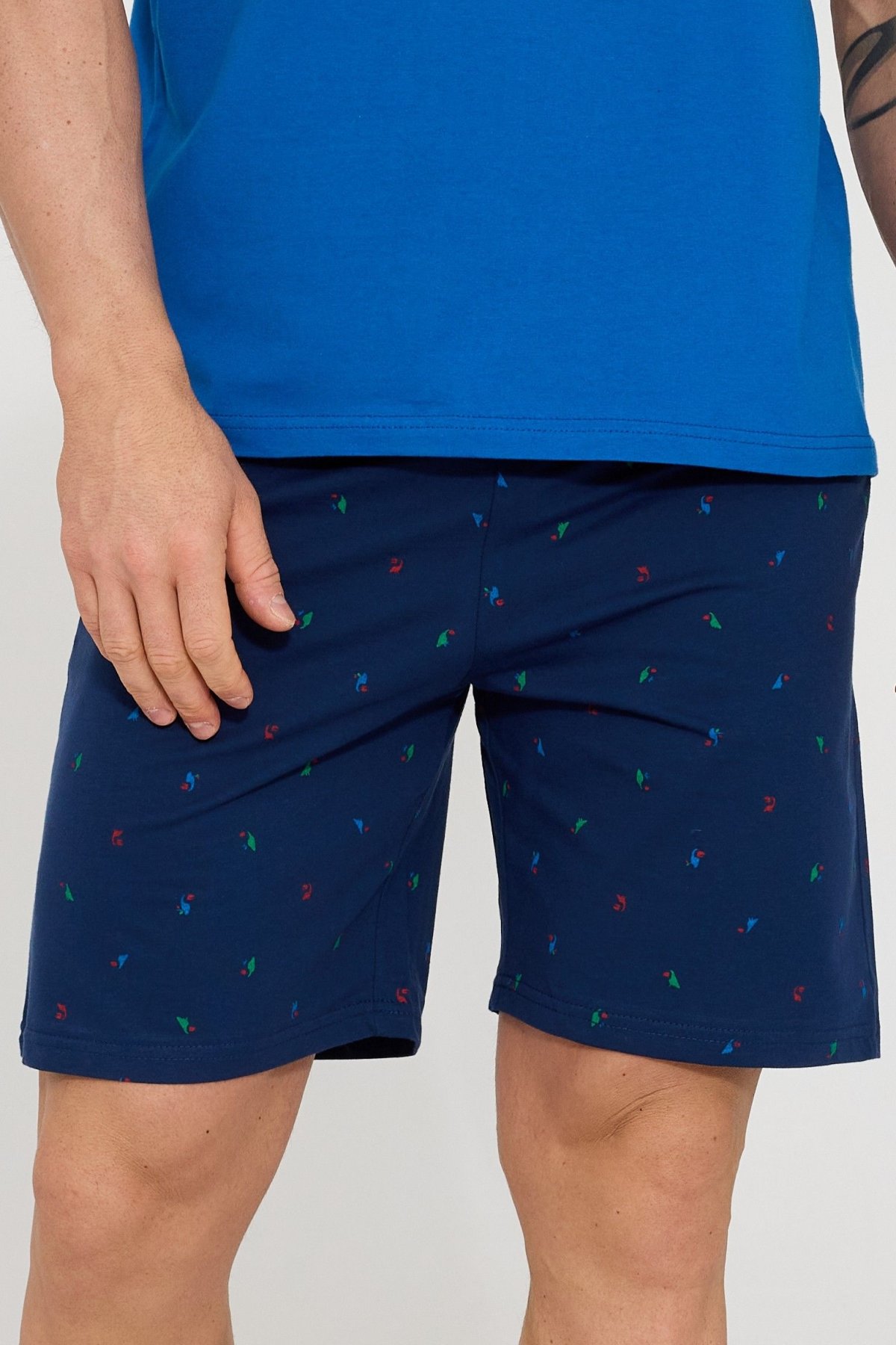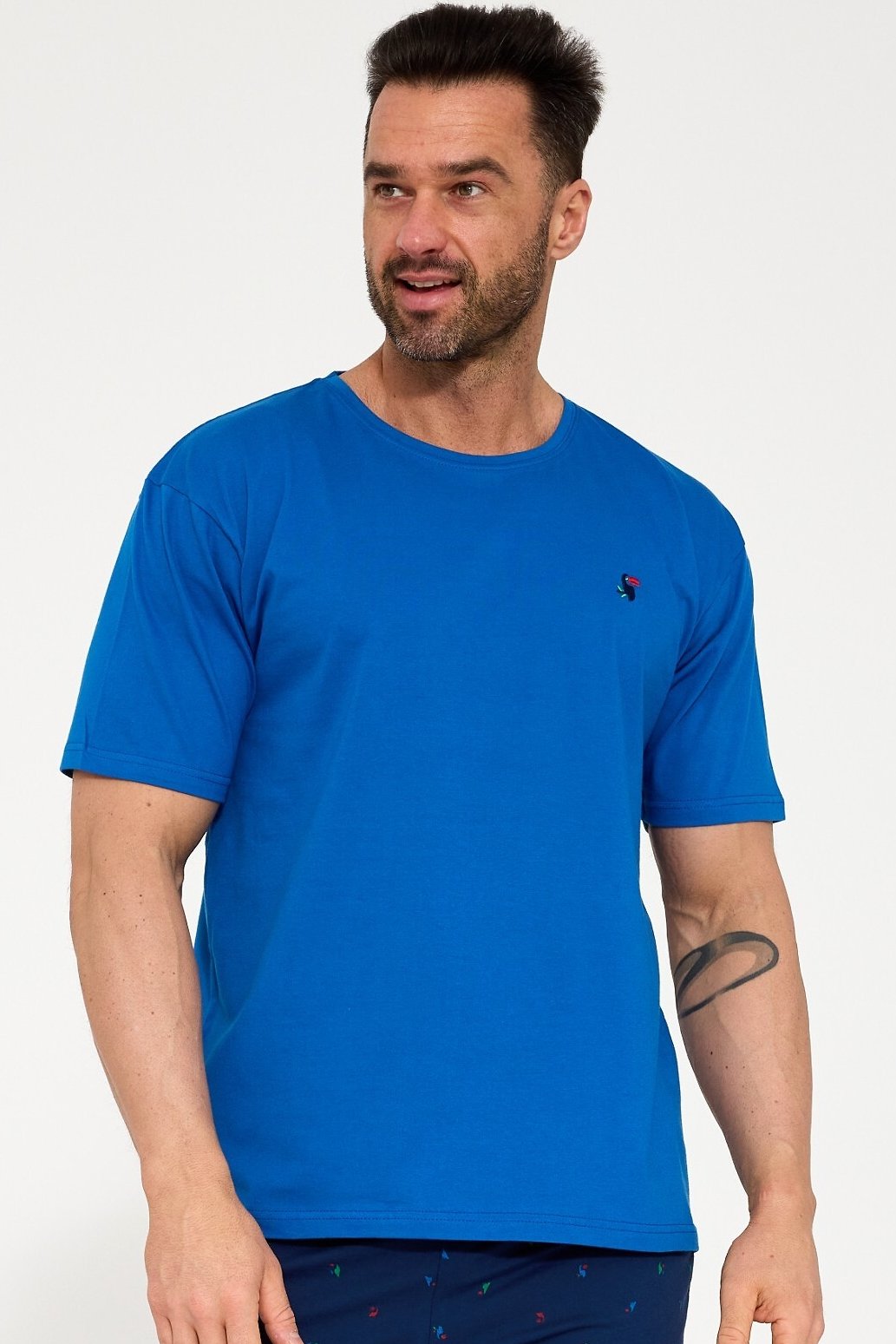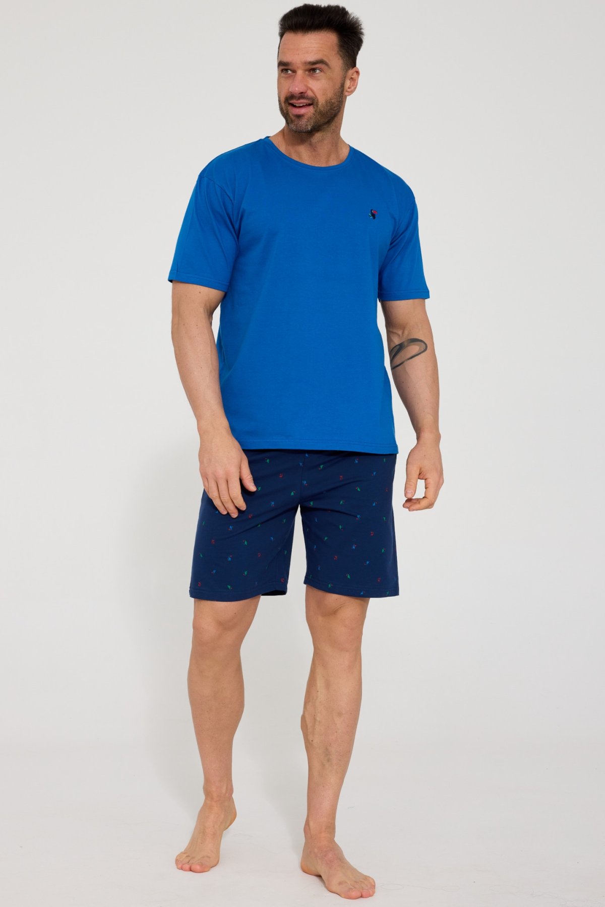 Pánské pyžamo Toucan zaujme svým svěžím letním designem a výjimečným pohodlím. Hladké modré tričko zdobí drobná výšivka exotického tukana, která dodává celku originální charakter. K tomu perfektně ladí krátké šortky s barevným tropickým potiskem, ideální pro teplé noci. Měkká bavlna je prodyšná a příjemná během nošení. Pyžamo má volný střih poskytující maximální komfort během spánku i odpočinku. Skvělá volba pro muže, kteří si potrpí na kvalitu, lehkost a nenápadný styl.