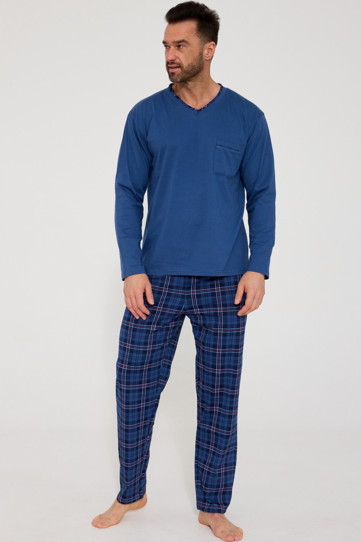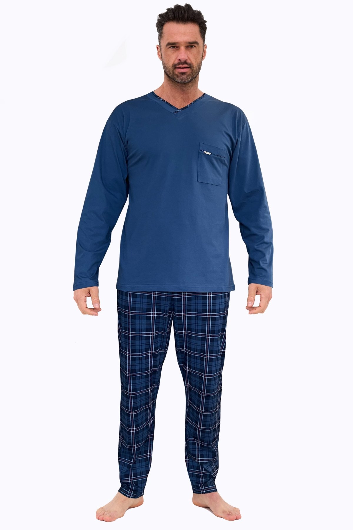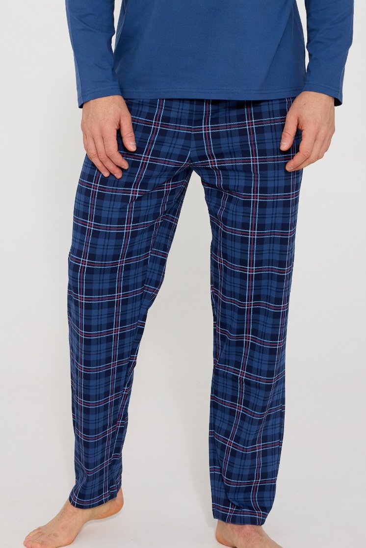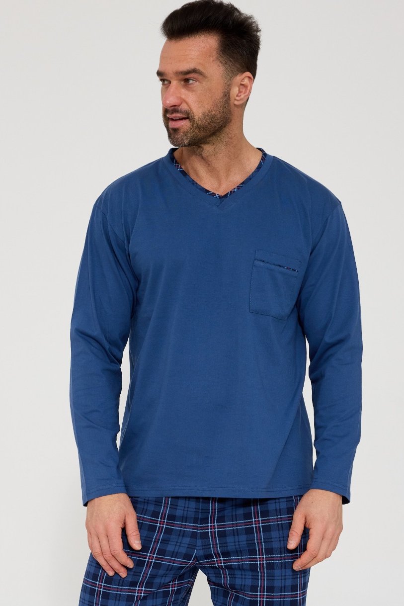 Pánské pyžamo Victor je ideální pro všechny muže, kteří ocení klasiku, pohodlí a kvalitu. Jednobarevné tričko s dlouhým rukávem a výstřihem do V působí elegantně, dlouhé kalhoty v tradičním károvaném vzoru dodávají modelu stylový charakter. Díky měkké bavlně pyžamo poskytuje maximální komfort, je prodyšné a příjemné na dotek. Elastický pas se přizpůsobí postavě a zaručí volnost pohybu během spánku i odpočinku. Pyžamo je vhodné i jako praktický dárek – nadčasové, pohodlné a dokonale zpracované.