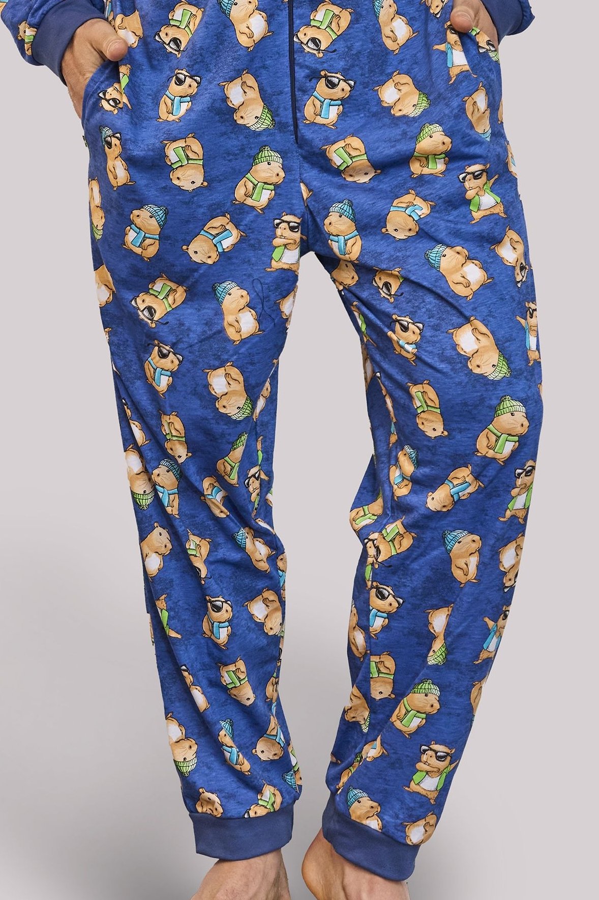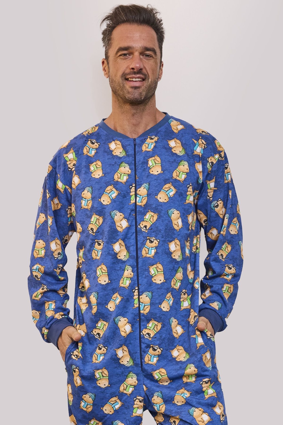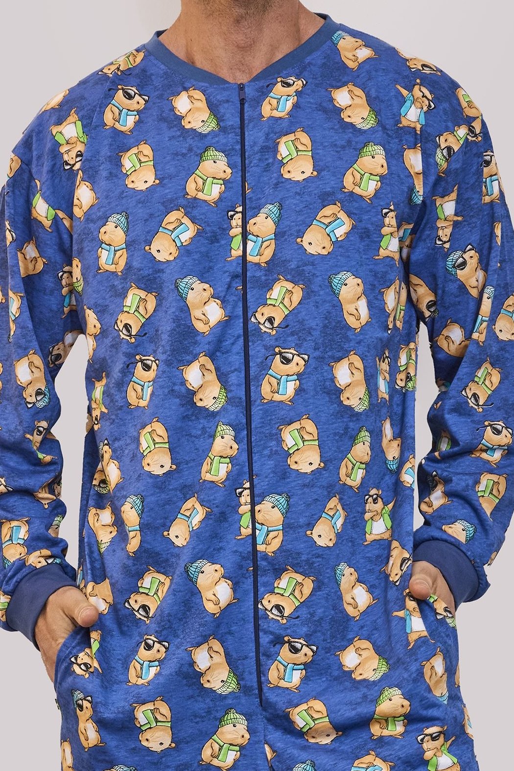 Pánský overal Capybara 2 je ideální volbou pro muže, kteří hledají spojení hravosti, pohodlí a kvalitního zpracování. Vyrobený z bavlny, je příjemný na dotek, prodyšný a zajišťuje komfort po celý den i noc. Dlouhé rukávy a nohavice s elastickým zakončením perfektně drží tvar a zabraňují posouvání materiálu. Praktický zip usnadňuje oblékání, boční kapsy dodávají modelu funkčnost. Originální potisk s motivem kapybary dodává pyžamu osobitý, veselý charakter. Skvělá volba na chladné večery i lenivé víkendové ráno – pro pohodlí se špetkou humoru.