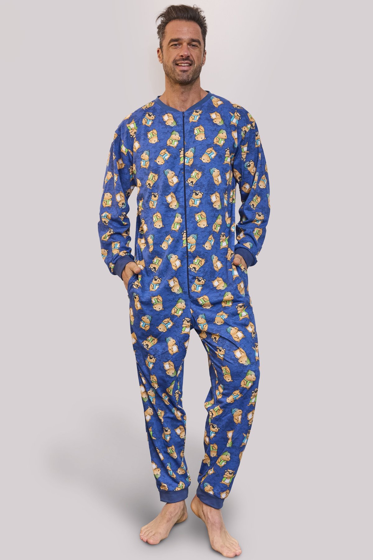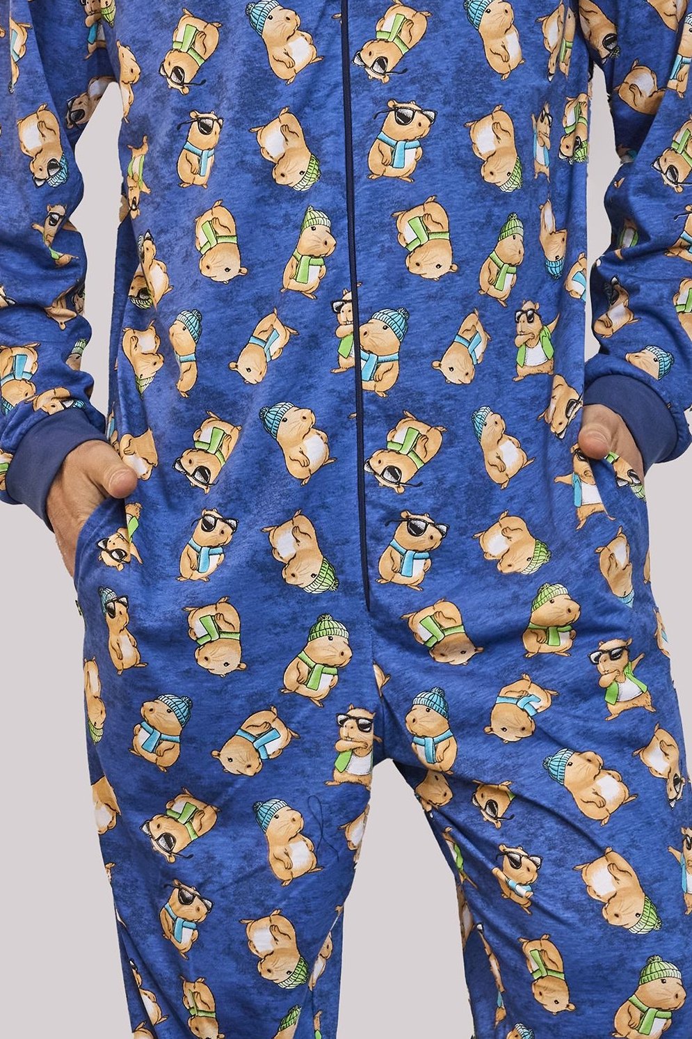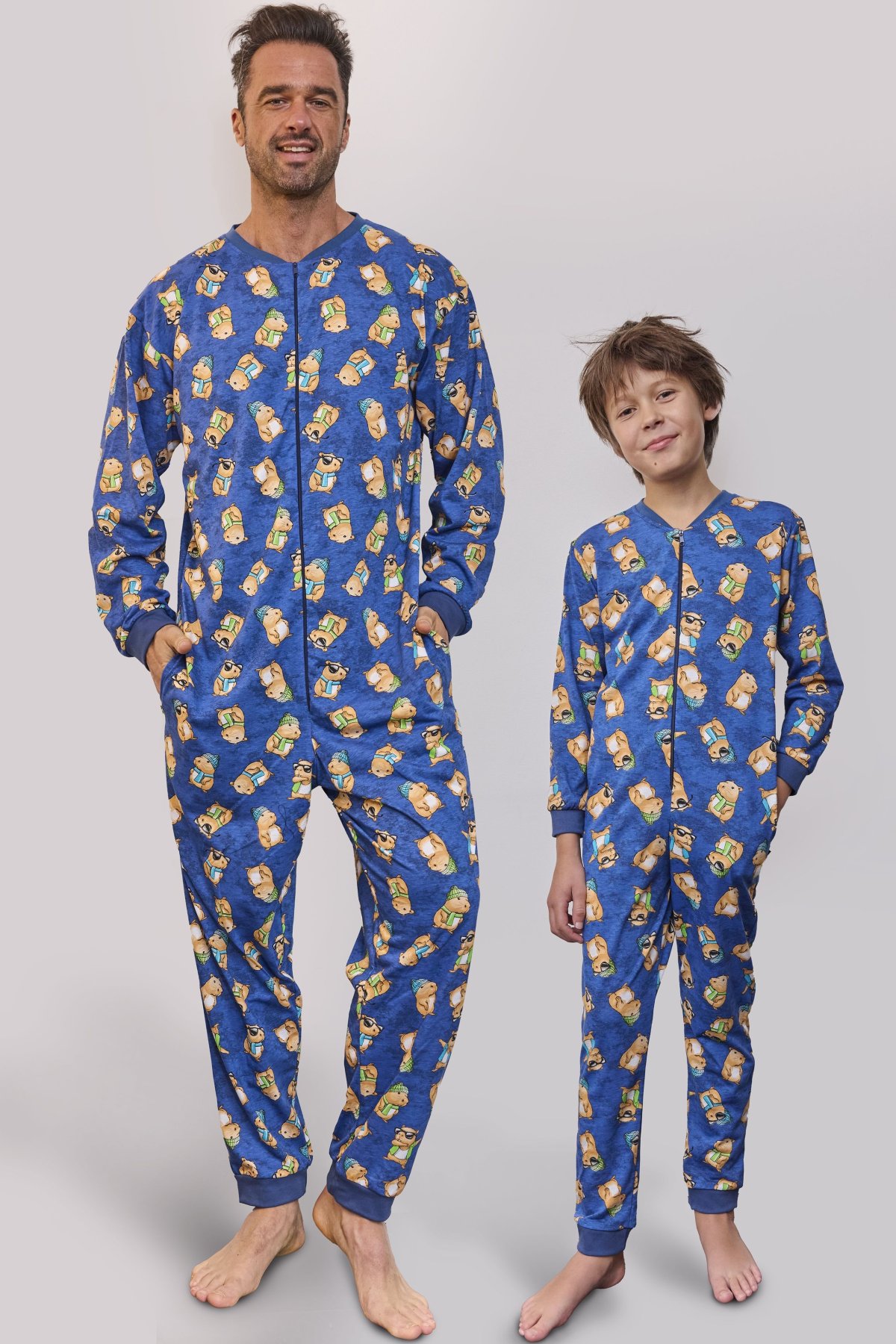 Pánský overal Capybara 2 je ideální volbou pro muže, kteří hledají spojení hravosti, pohodlí a kvalitního zpracování. Vyrobený z bavlny, je příjemný na dotek, prodyšný a zajišťuje komfort po celý den i noc. Dlouhé rukávy a nohavice s elastickým zakončením perfektně drží tvar a zabraňují posouvání materiálu. Praktický zip usnadňuje oblékání, boční kapsy dodávají modelu funkčnost. Originální potisk s motivem kapybary dodává pyžamu osobitý, veselý charakter. Skvělá volba na chladné večery i lenivé víkendové ráno – pro pohodlí se špetkou humoru.