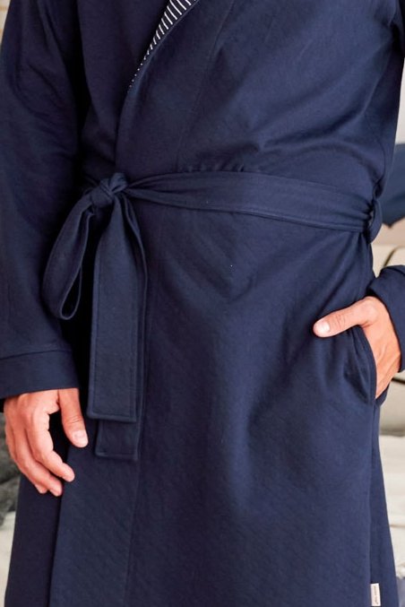 Pánský, tmavě modrý župan, který vyniká nadčasovým střihem a komfortem. Měkký, na dotek hebký materiál příjemně hřeje a díky certifikaci OEKO-TEX® je šetrný k pokožce. Šálový límec působí upraveně a dodává modelu punc klasické elegance, zatímco jemné proužkované detaily u límce podtrhují moderní homewear styl. Praktické kapsy pojmou telefon či drobnosti a pásek v pase umožní snadno přizpůsobit obvod. Délka akorát neomezuje v pohybu – ideální jak po sprše, tak pro pohodové víkendové ráno. Pokud hledáte župan, který spojuje kvalitu zpracování, komfort a univerzální design, tenhle kousek bude trefou do černého.