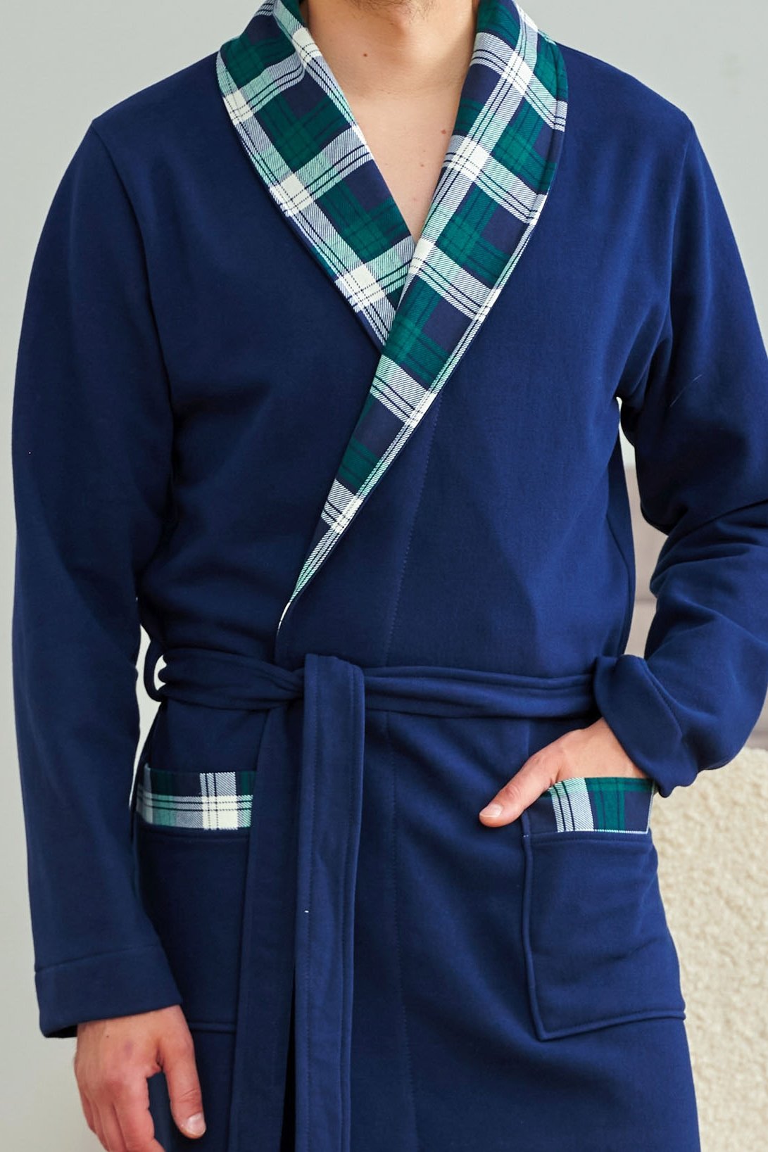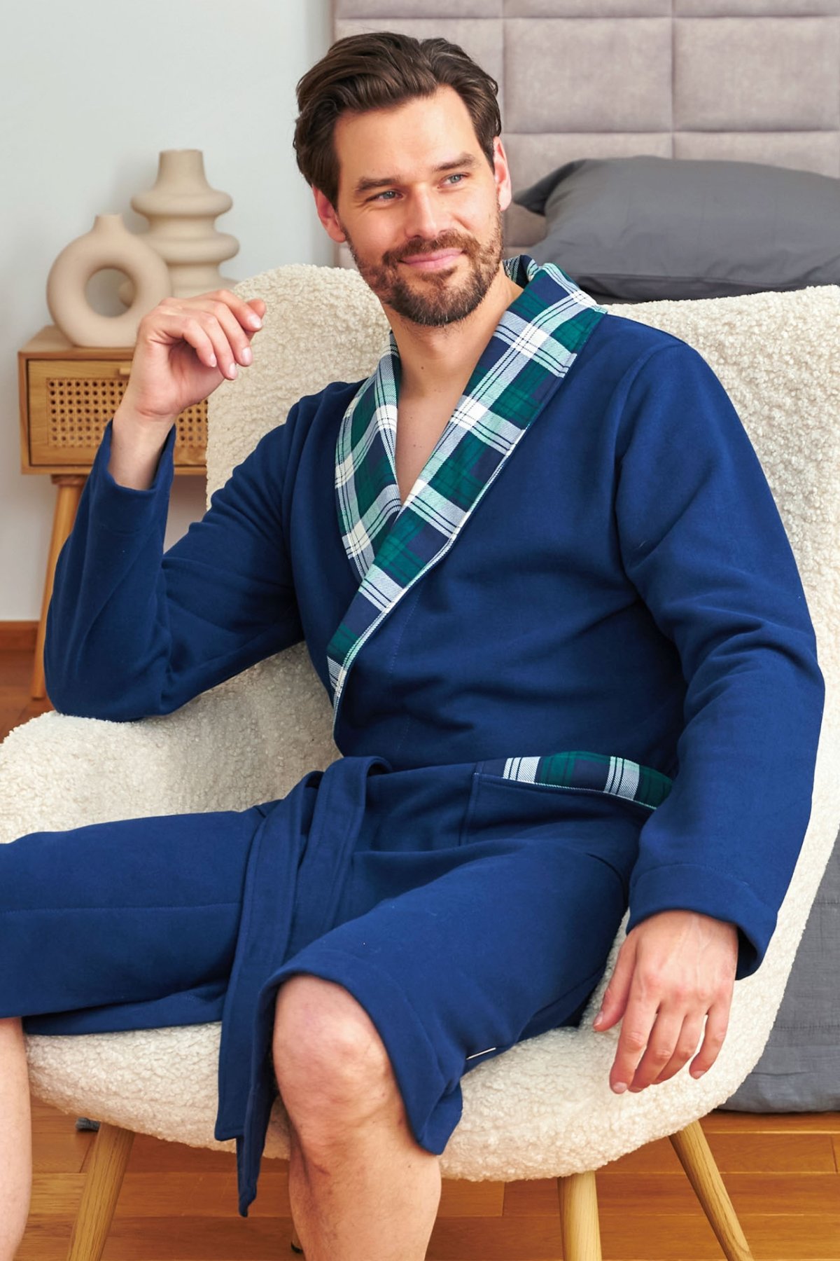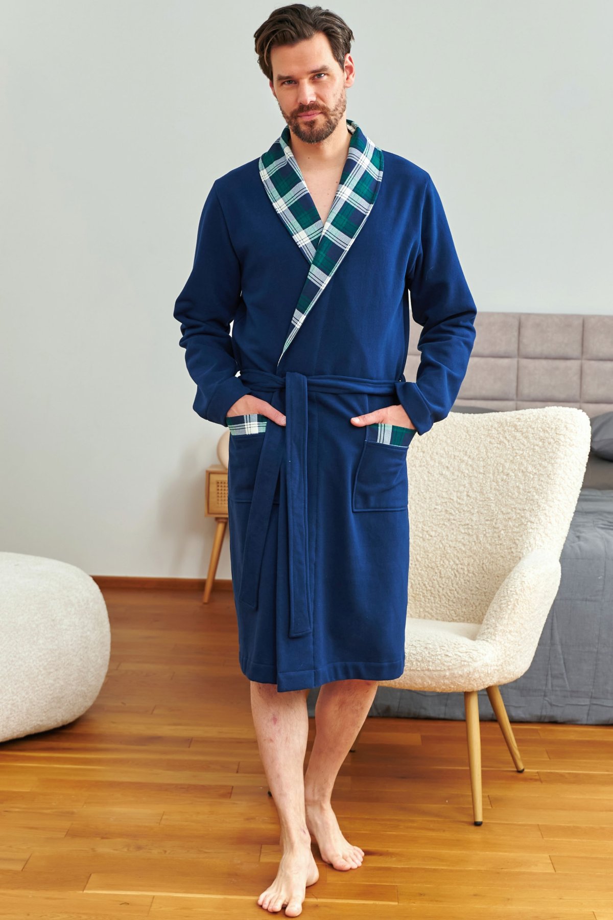 Šálový límec působí uhlazeně, decentní kostkované lemování dodává moderní akcent. Praktický pásek umožní snadno upravit obvod a dvě prostorné kapsy pojmou telefon, kapesník či jiné drobnosti. Nadčasový střih lichotí postavě a neomezuje v pohybu. Ideální volba pro muže, kteří nechtějí dělat kompromisy mezi stylem a pohodlím. Pro sladěný „couple look“ můžete zkombinovat s dámským županem ze stejné kolekce. Tento župan se rychle stane základním kouskem vašeho domácího šatníku.