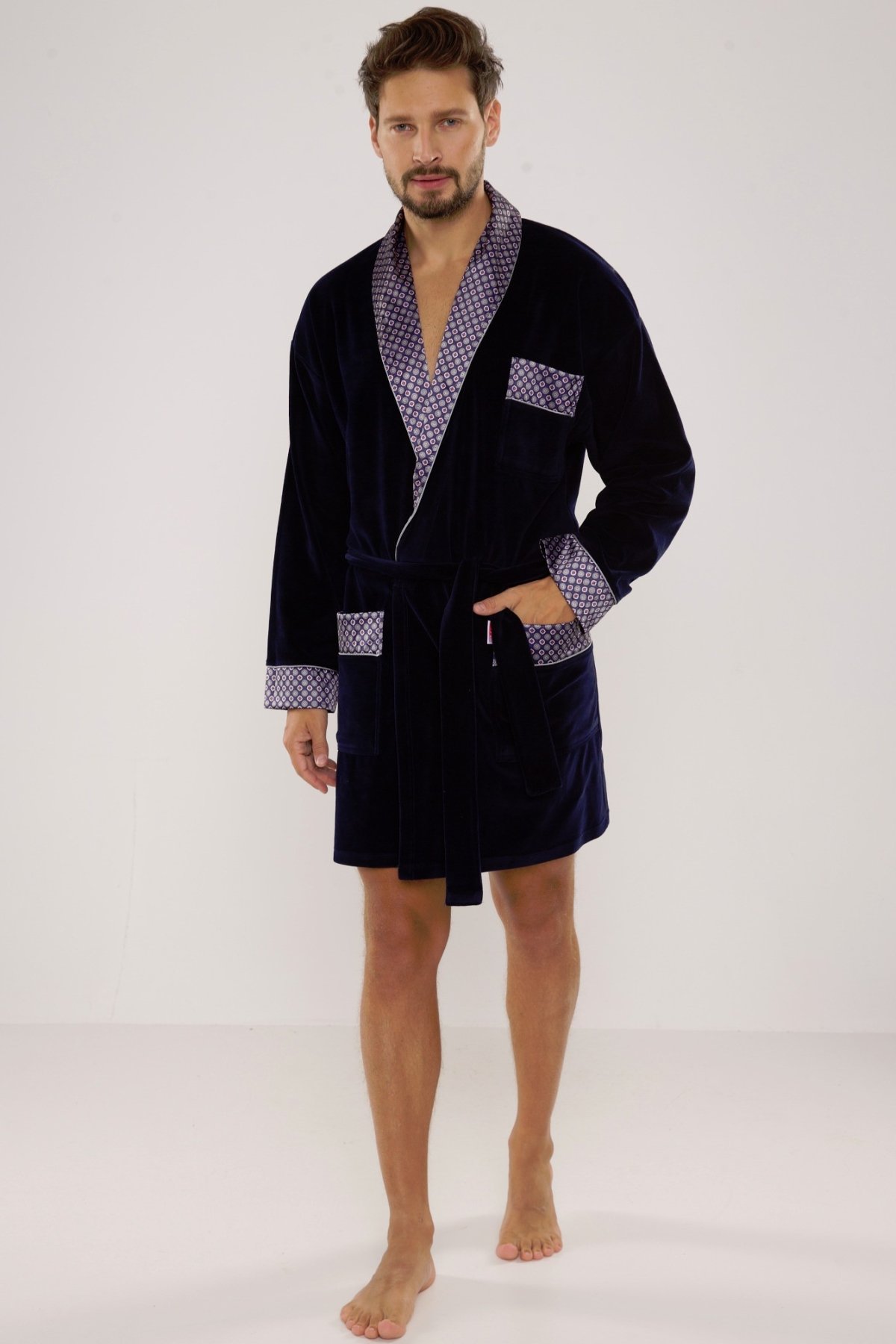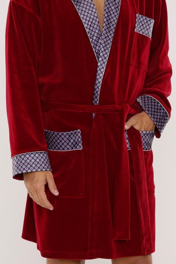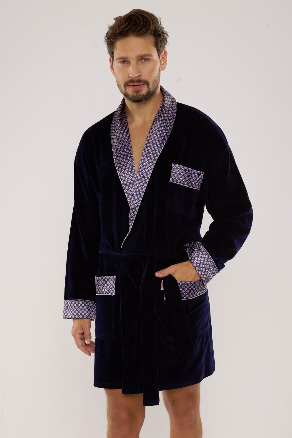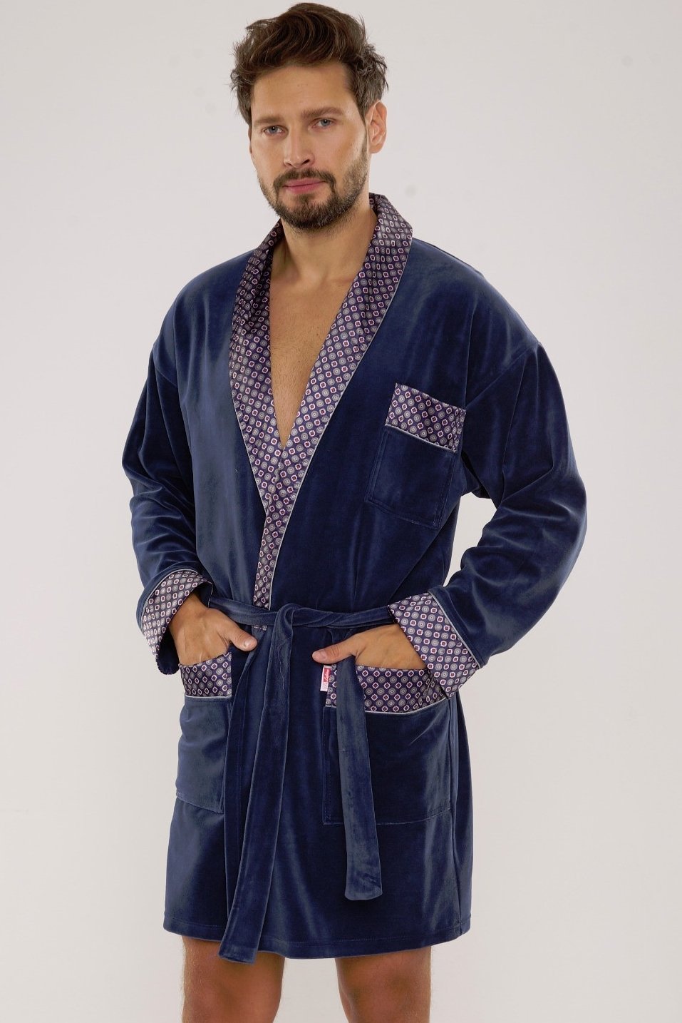 Pánský župan Bonjour v krátké verzi kombinuje pohodlí, funkčnost a nadčasovou eleganci. Vyrobený z kvalitního veluru s vysokým podílem bavlny. Je mimořádně měkký, hřejivý a příjemný na dotek. Klasický střih se šálovým límcem a páskem v pase zaručuje pohodlné nošení i atraktivní vzhled. Praktické kapsy – dvě po stranách a jedna menší na hrudi – poskytují prostor na drobnosti. Saténové lemy s decentním vzorem dodávají županu luxusní charakter. Kousek ideální pro muže, kteří si cení kvality, stylu a pohodlí po koupeli nebo při domácím odpočinku.