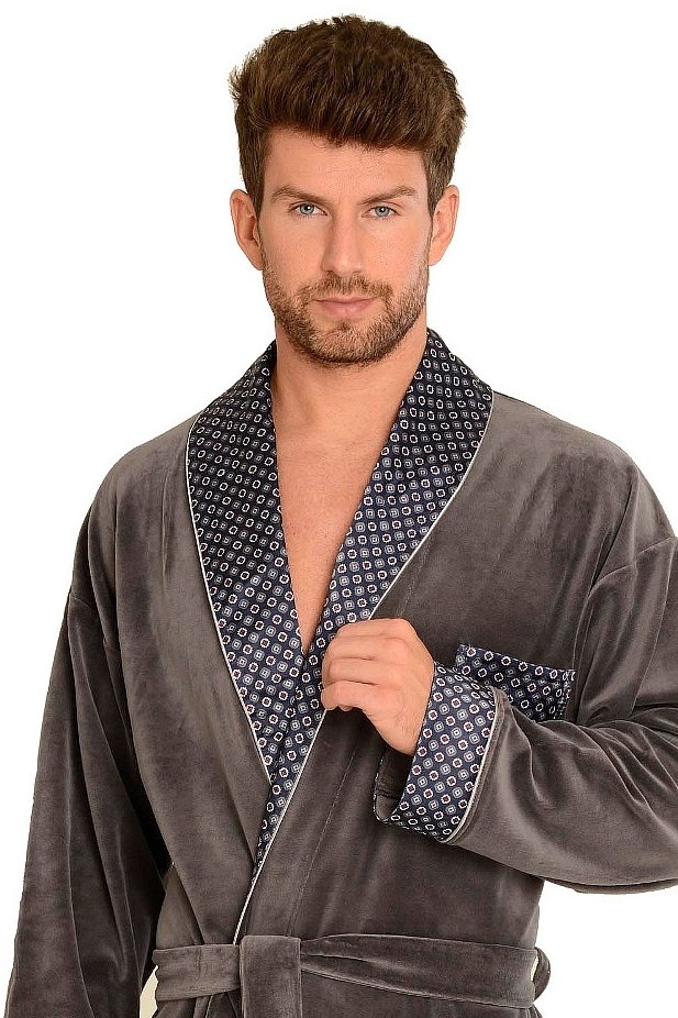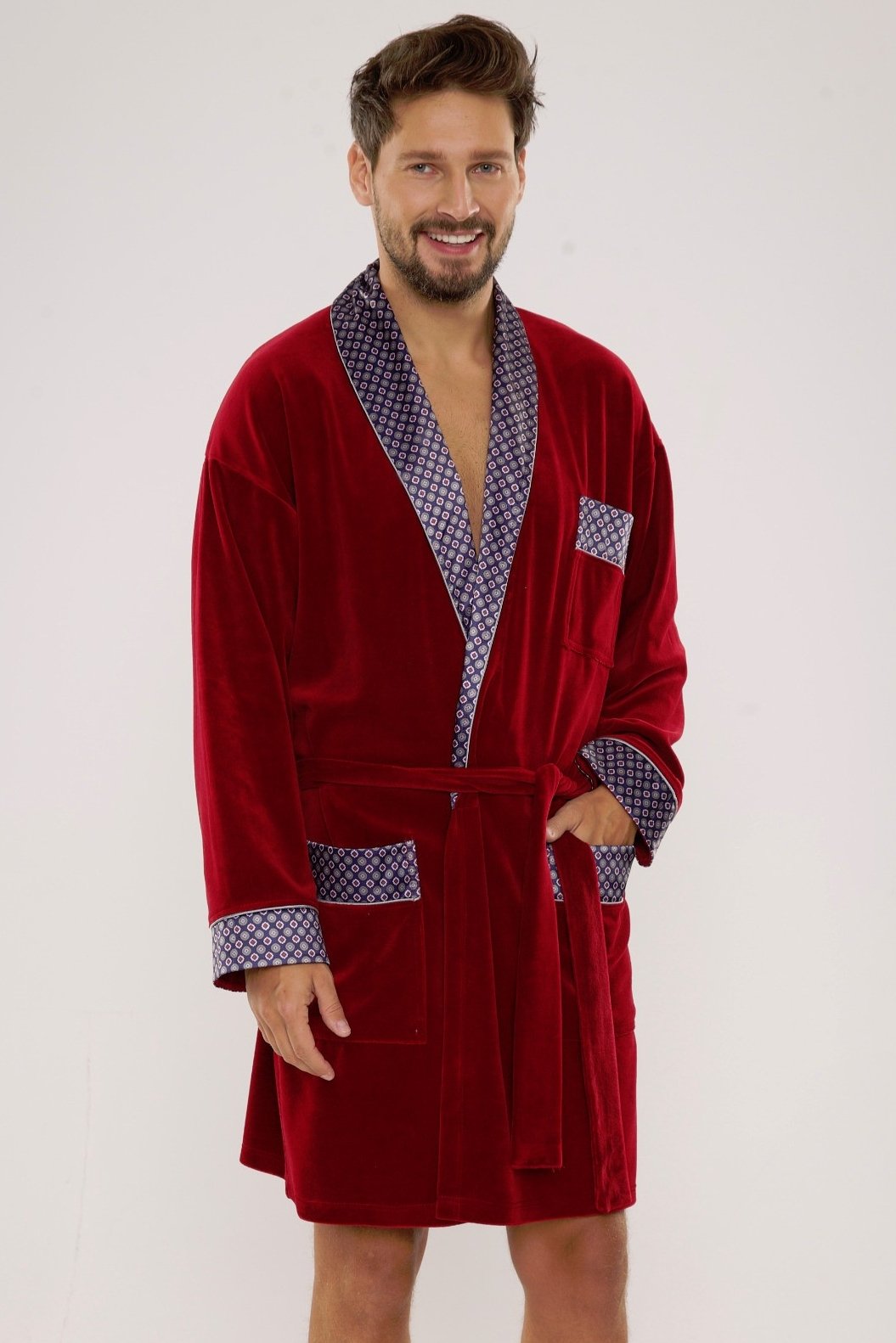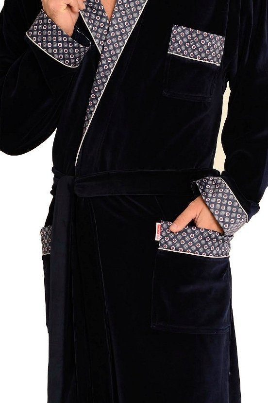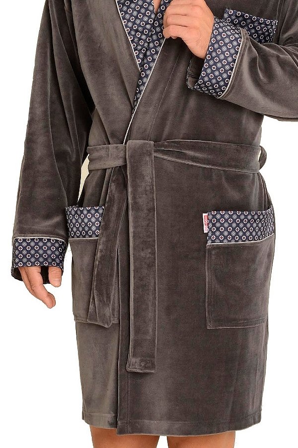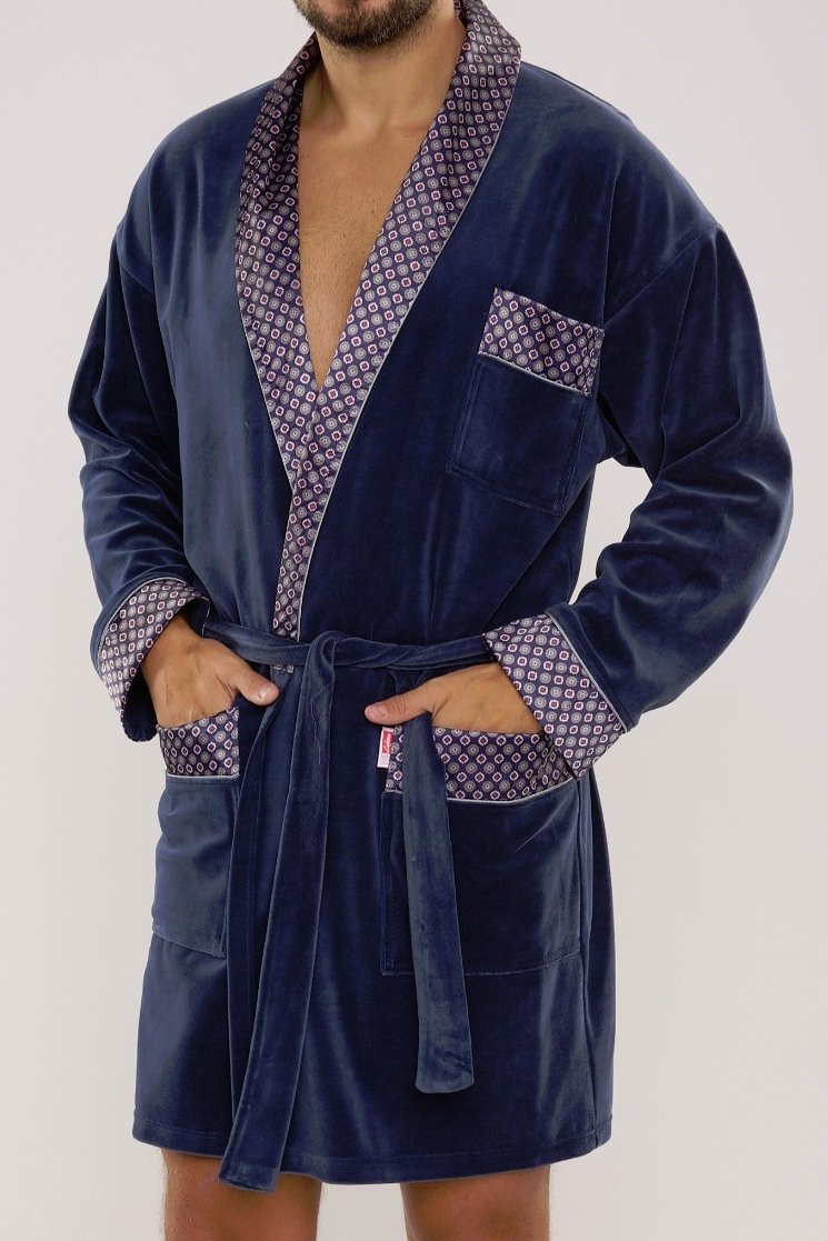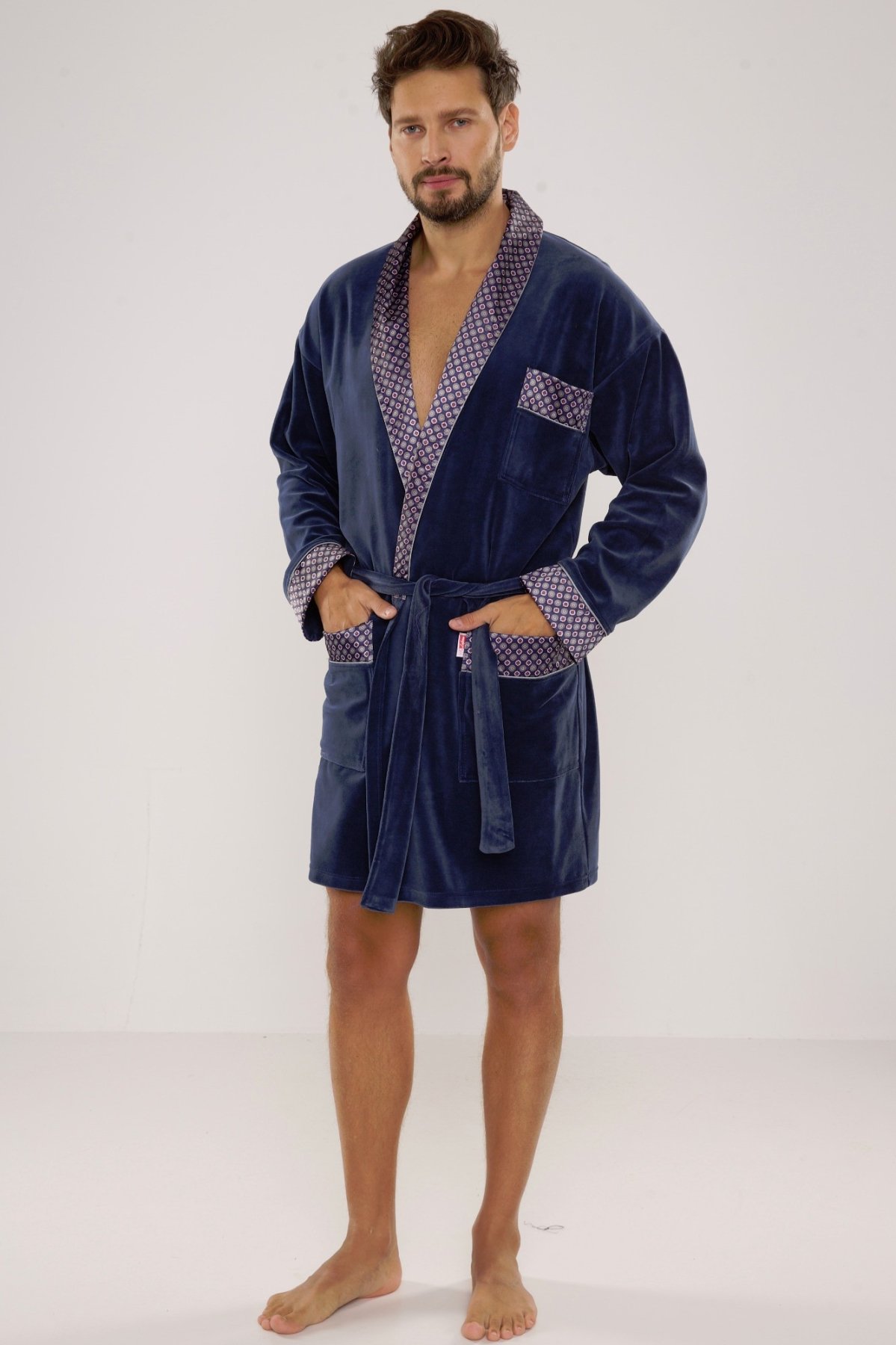 Pánský župan Bonjour v krátké verzi kombinuje pohodlí, funkčnost a nadčasovou eleganci. Vyrobený z kvalitního veluru s vysokým podílem bavlny. Je mimořádně měkký, hřejivý a příjemný na dotek. Klasický střih se šálovým límcem a páskem v pase zaručuje pohodlné nošení i atraktivní vzhled. Praktické kapsy – dvě po stranách a jedna menší na hrudi – poskytují prostor na drobnosti. Saténové lemy s decentním vzorem dodávají županu luxusní charakter. Kousek ideální pro muže, kteří si cení kvality, stylu a pohodlí po koupeli nebo při domácím odpočinku.