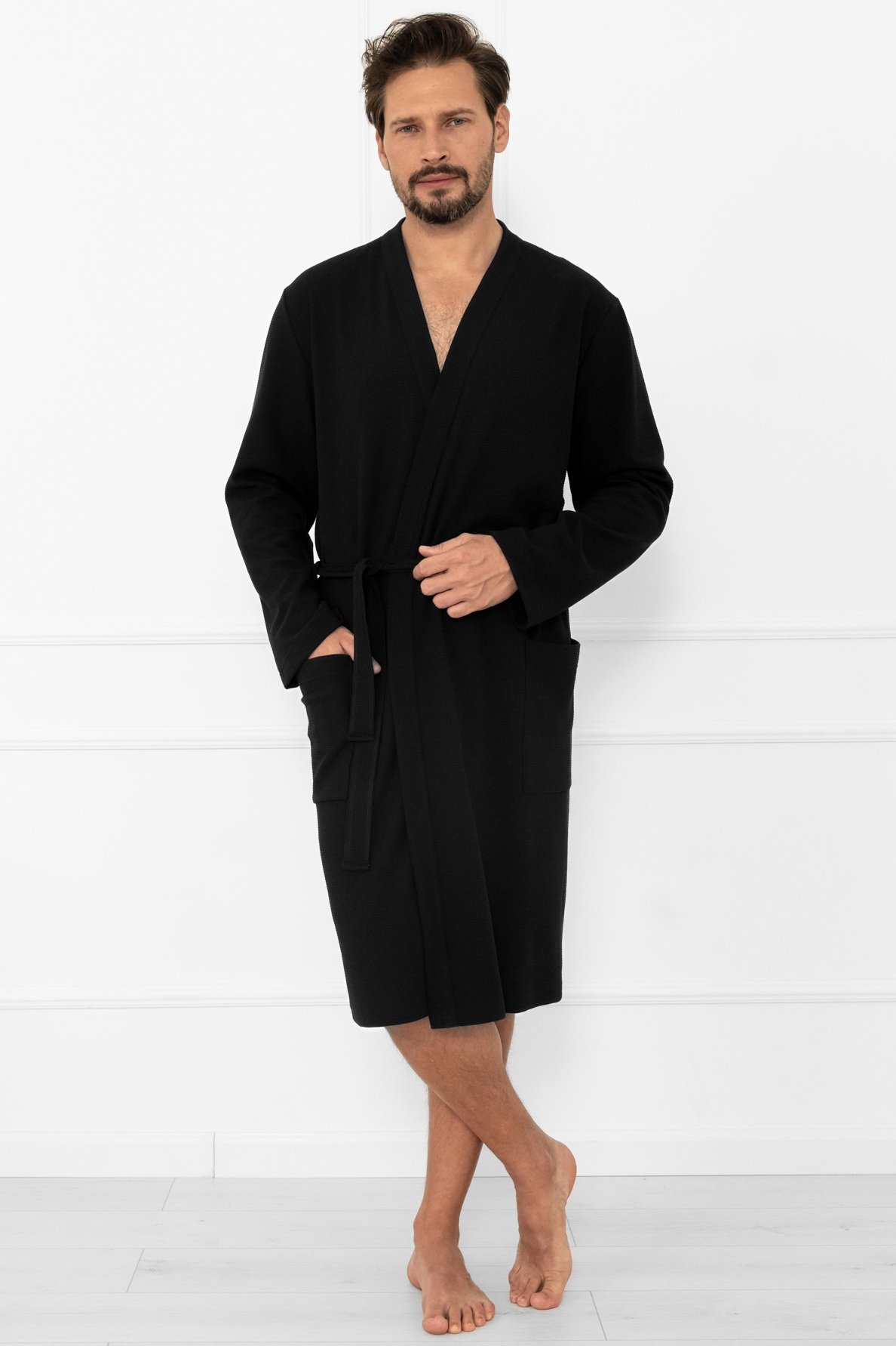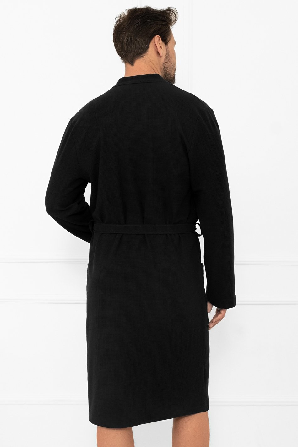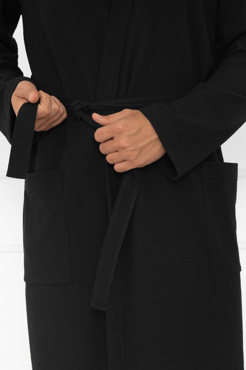 Pánský župan Bono. Nadčasový model, který kombinuje jednoduchost, eleganci a maximální pohodlí. Vyrobený z kvalitní směsi bavlny a polyesteru. Je příjemný na dotek, měkký a zároveň odolný při nošení i častém praní. Díky praktickému zavazování v pase se snadno přizpůsobí postavě a poskytne pocit volnosti. Dlouhé rukávy a délka ke kolenům zajišťují optimální tepelný komfort, zatímco našité kapsy po stranách dodávají na funkčnosti – ideální pro drobnosti nebo zahřátí rukou. Černá barva dodává županu univerzální a moderní vzhled, díky kterému se hodí pro každého muže, který preferuje klasický, ale zároveň stylový domácí oděv.