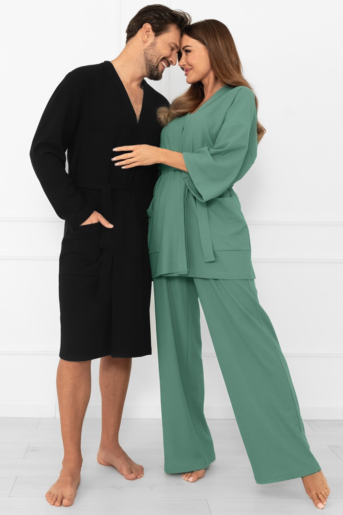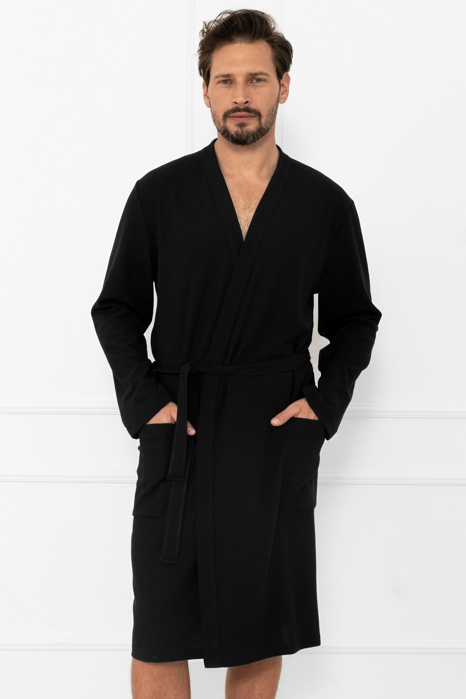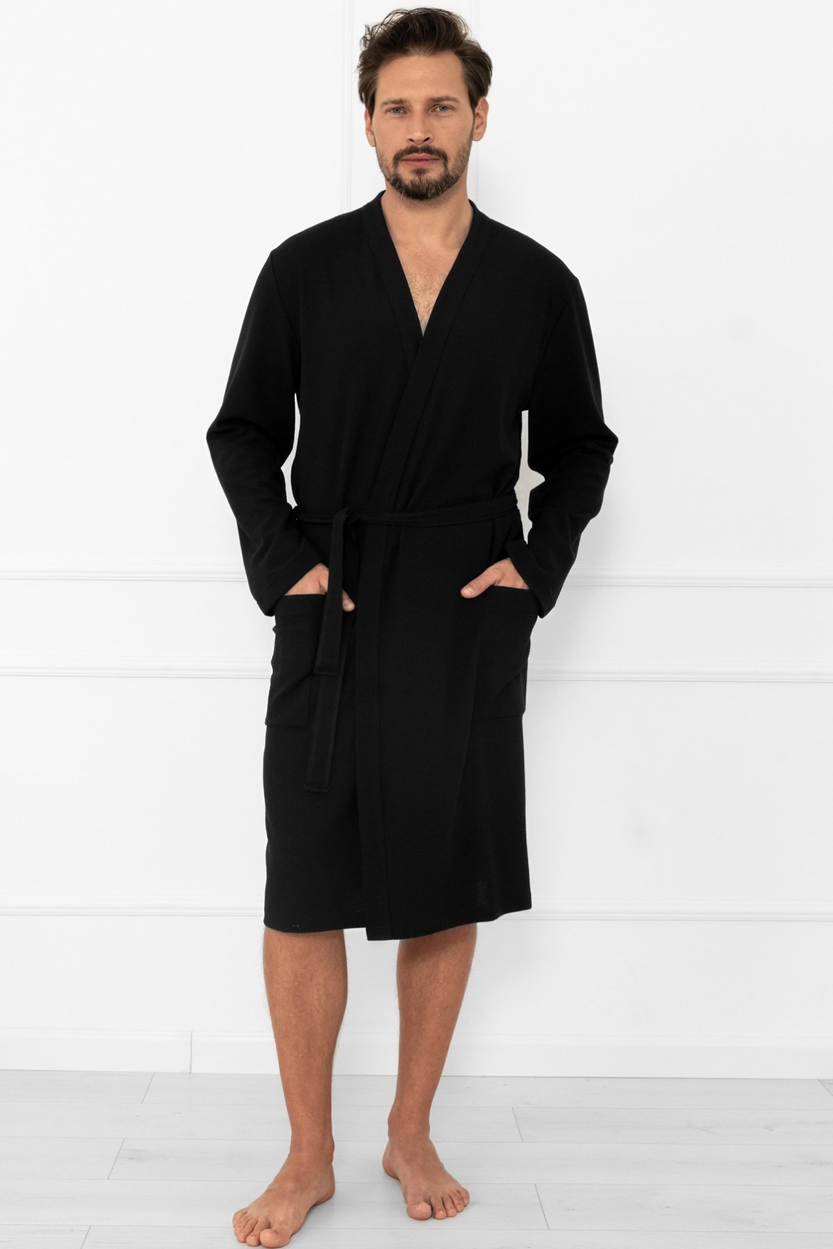 Pánský župan Bono. Nadčasový model, který kombinuje jednoduchost, eleganci a maximální pohodlí. Vyrobený z kvalitní směsi bavlny a polyesteru. Je příjemný na dotek, měkký a zároveň odolný při nošení i častém praní. Díky praktickému zavazování v pase se snadno přizpůsobí postavě a poskytne pocit volnosti. Dlouhé rukávy a délka ke kolenům zajišťují optimální tepelný komfort, zatímco našité kapsy po stranách dodávají na funkčnosti – ideální pro drobnosti nebo zahřátí rukou. Černá barva dodává županu univerzální a moderní vzhled, díky kterému se hodí pro každého muže, který preferuje klasický, ale zároveň stylový domácí oděv.