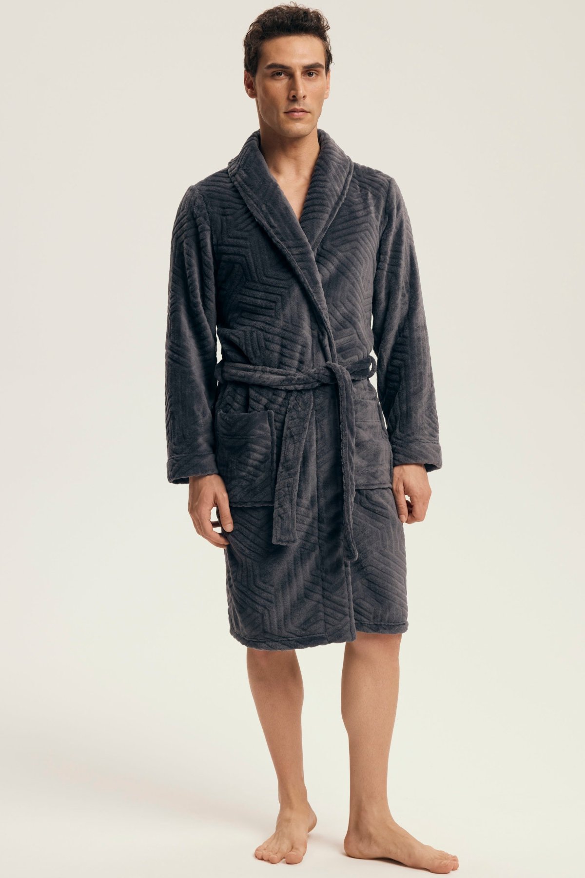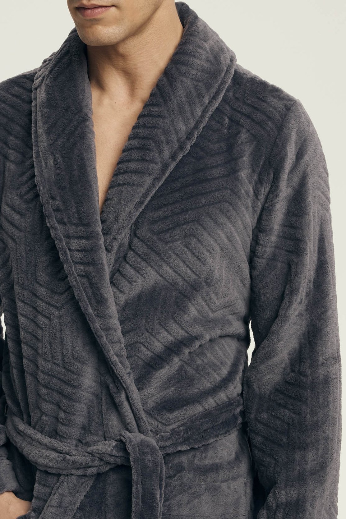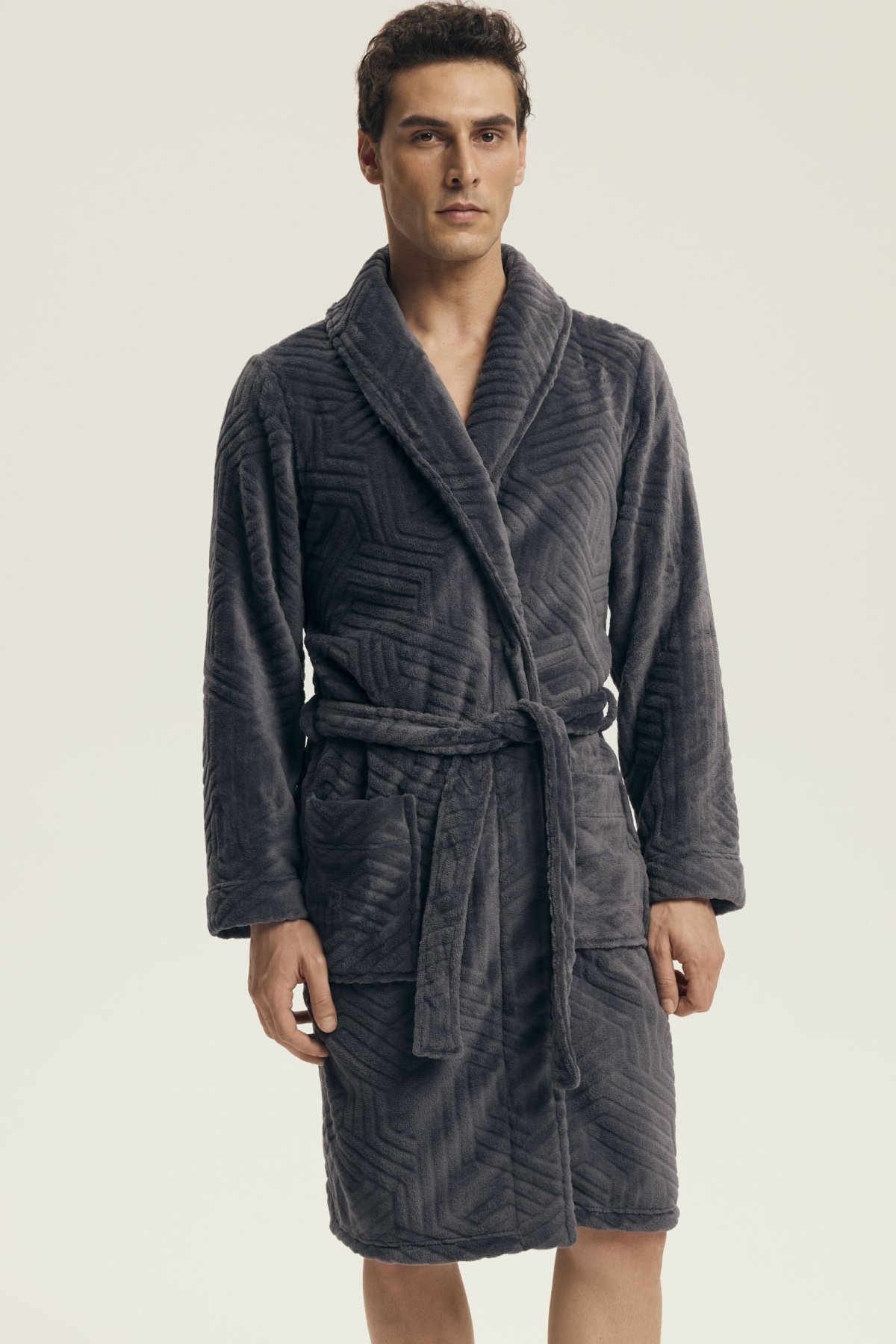 Pánský župan Nandu. Skrývá v sobě eleganci, komfort a funkčnost. Jemný, na dotek hebký materiál poskytuje příjemné teplo a zároveň se vyznačuje vysokou odolností. Díky šálovému límci a vázání v pase působí nadčasově a elegantně, geometrický vzor dodává moderní charakter. Praktické kapsy zvyšují komfort při každodenním používání ať už po koupeli, při ranní kávě nebo večerním odpočinku.