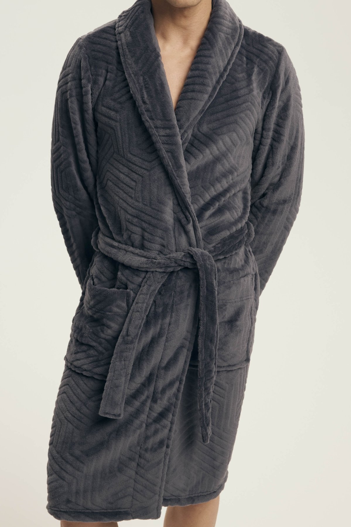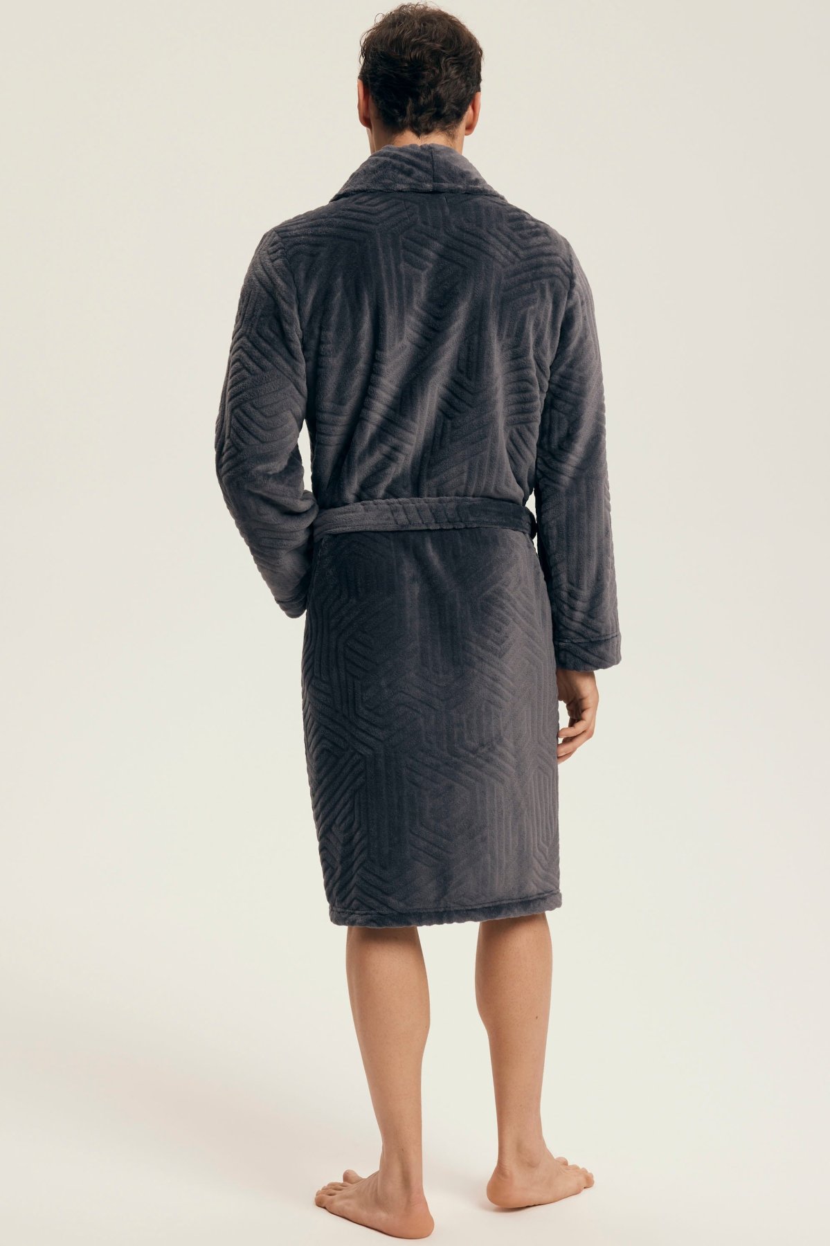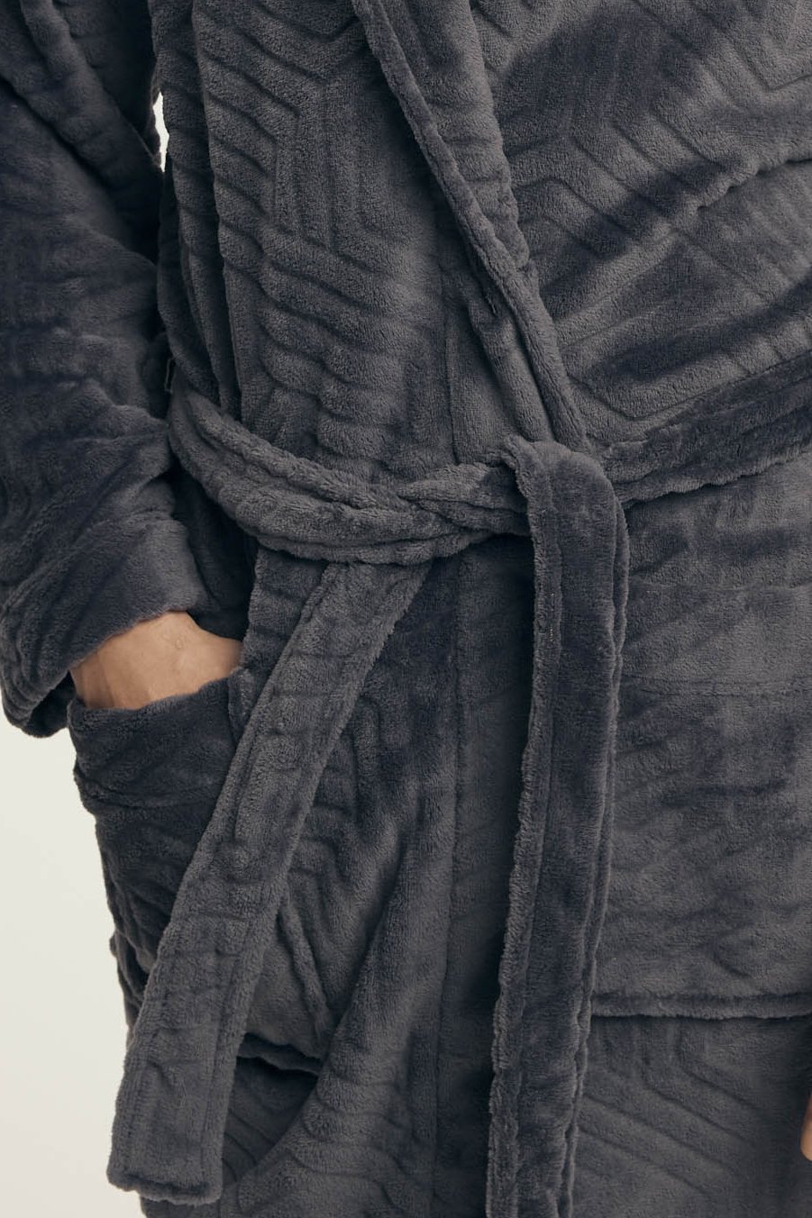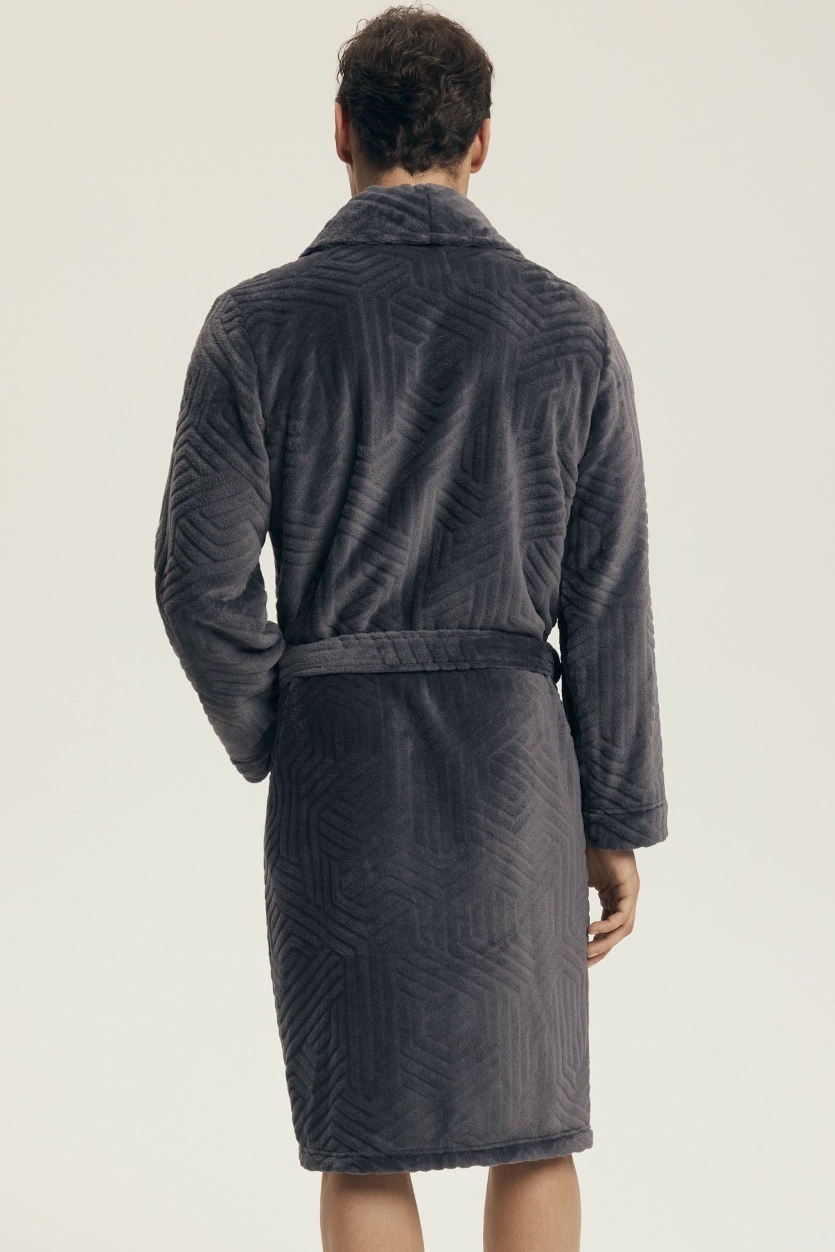 Pánský župan Nandu. Skrývá v sobě eleganci, komfort a funkčnost. Jemný, na dotek hebký materiál poskytuje příjemné teplo a zároveň se vyznačuje vysokou odolností. Díky šálovému límci a vázání v pase působí nadčasově a elegantně, geometrický vzor dodává moderní charakter. Praktické kapsy zvyšují komfort při každodenním používání ať už po koupeli, při ranní kávě nebo večerním odpočinku.