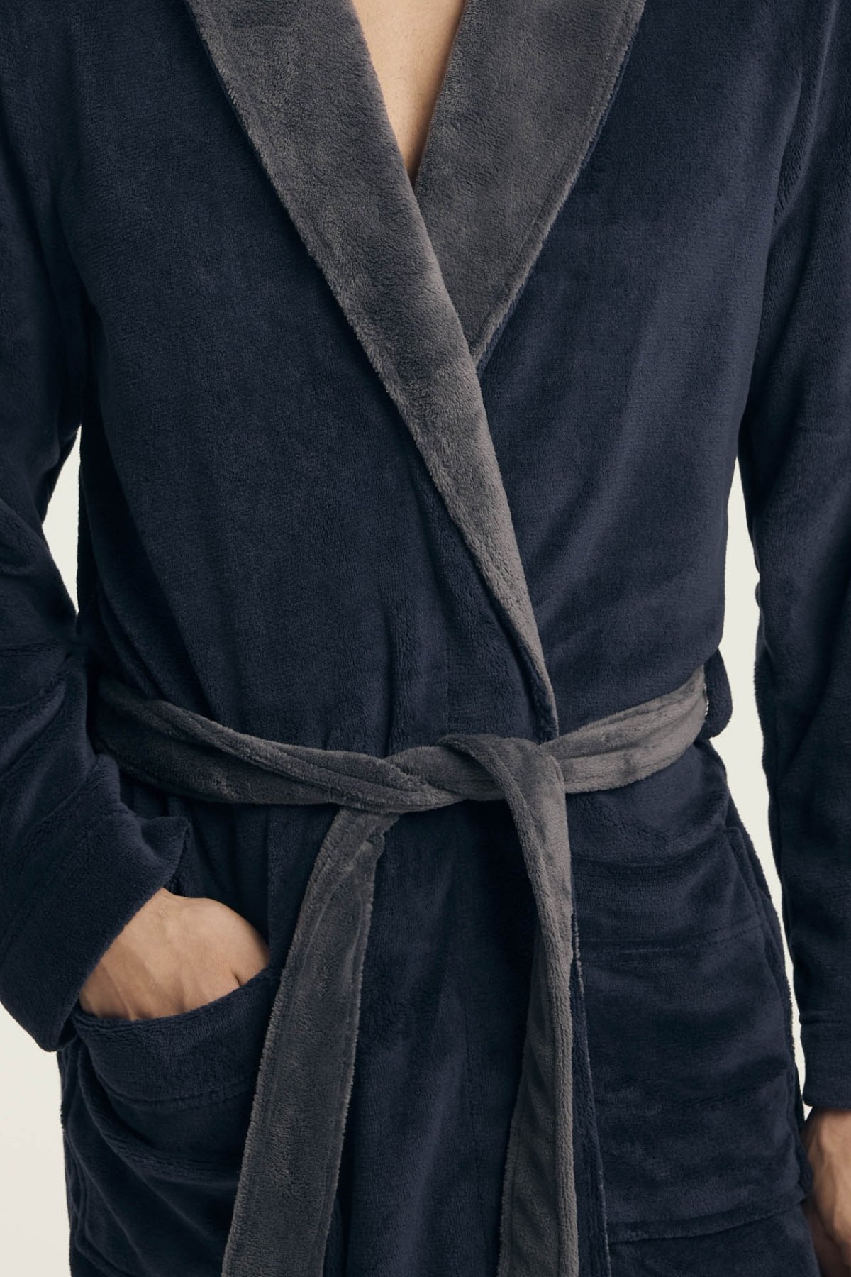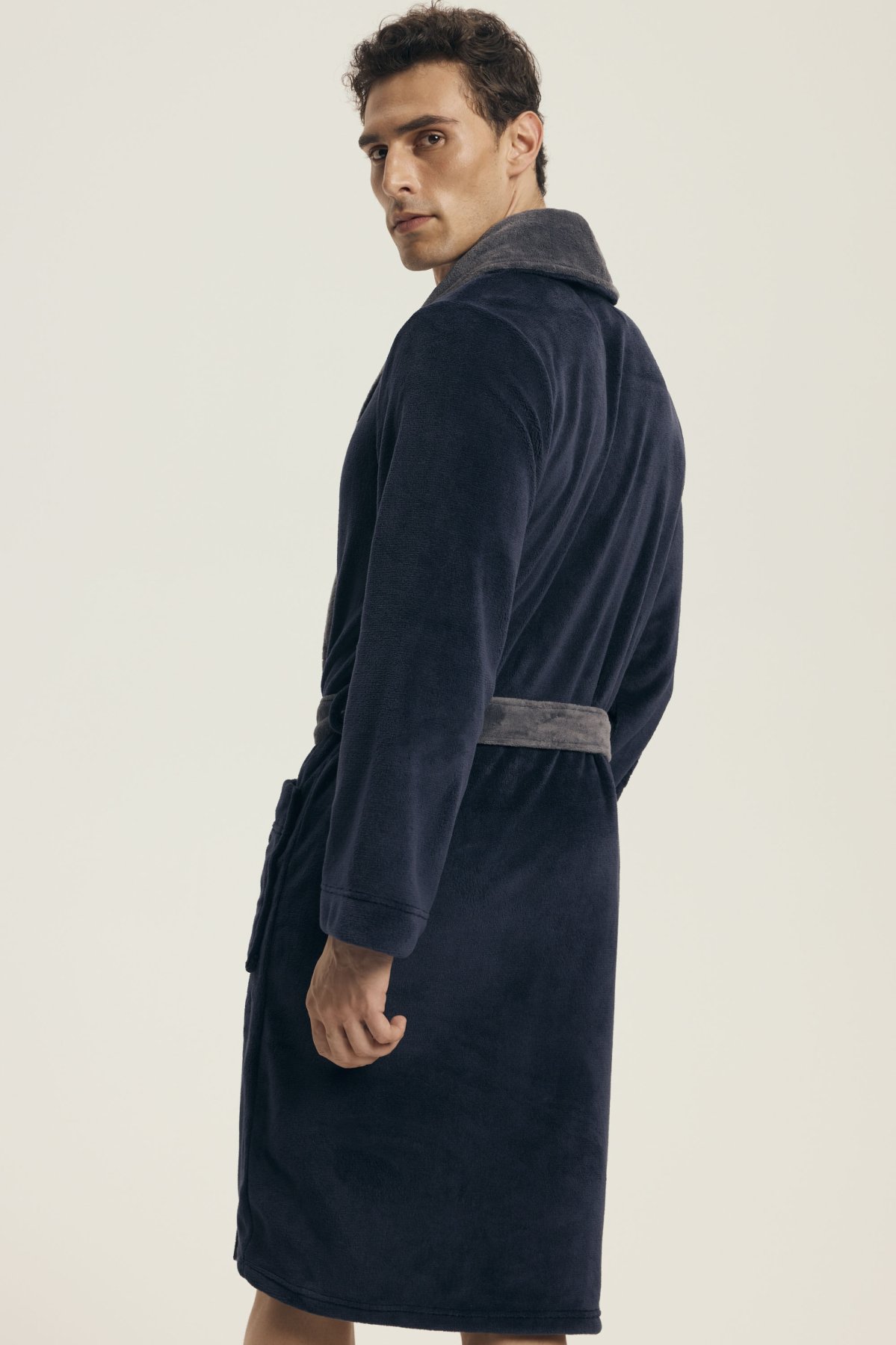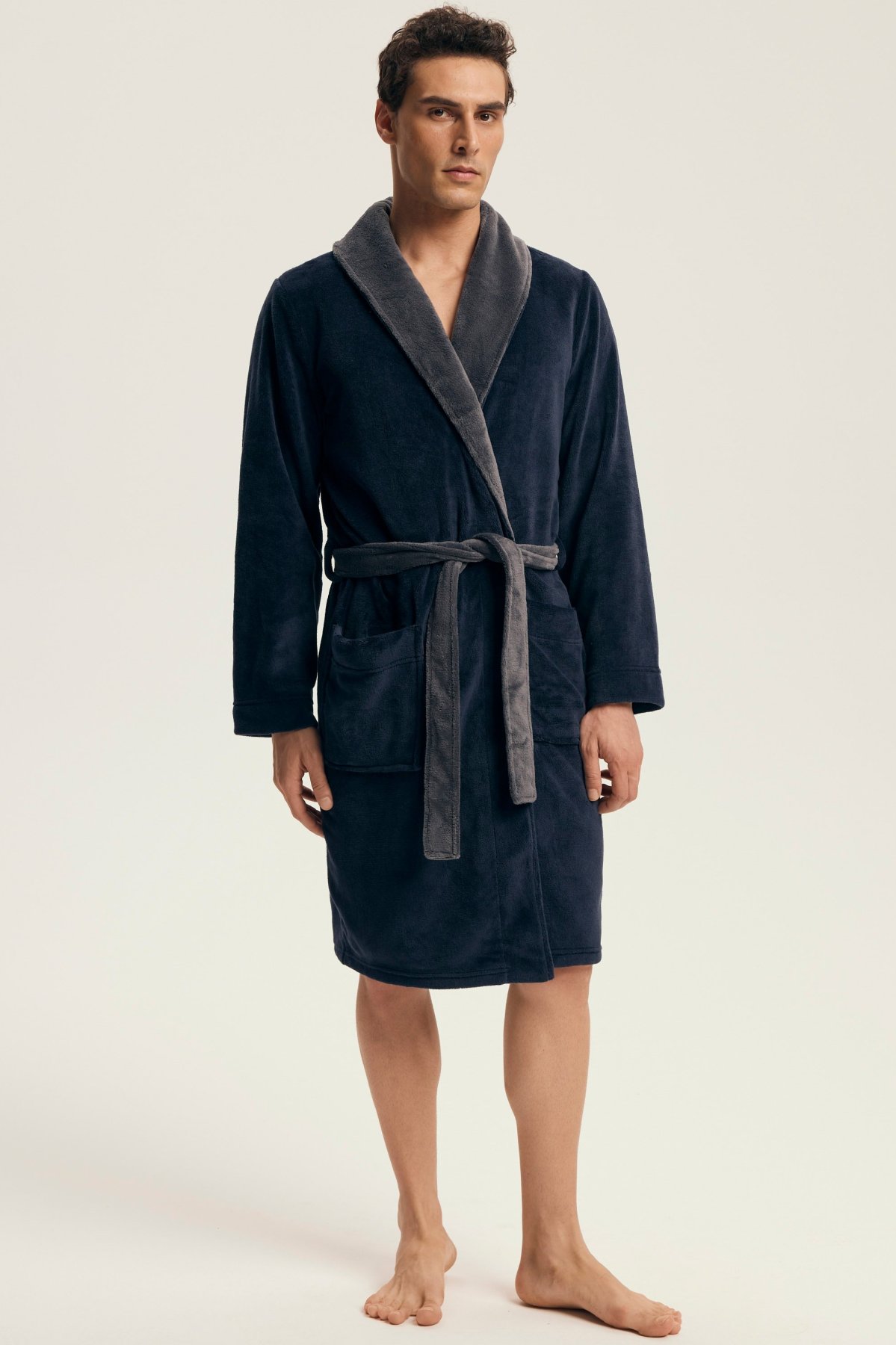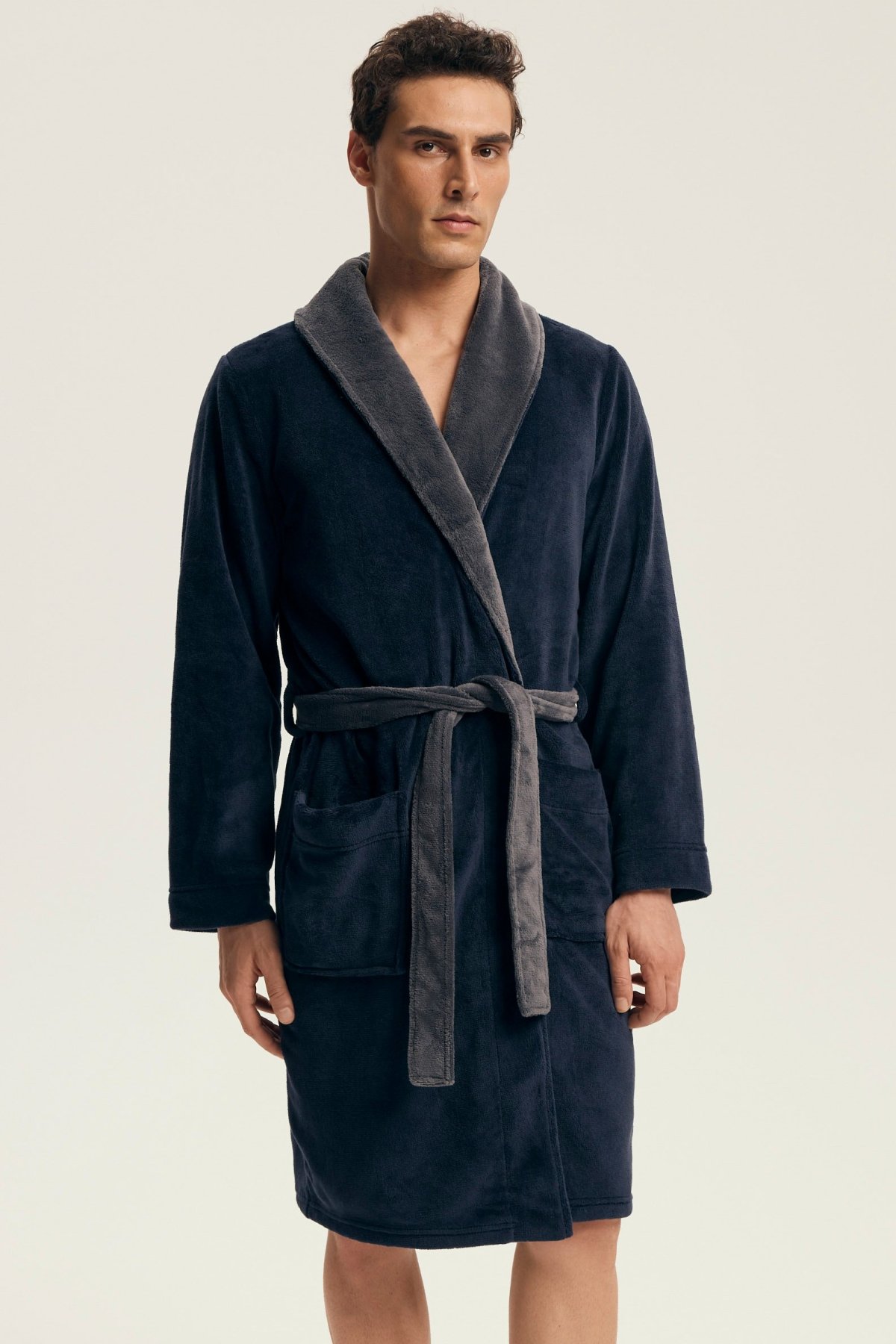 Hebký materiál poskytuje příjemné teplo, je tak ideální na chladná rána, večerní odpočinek nebo po koupeli. Kontrastní límec dodává moderní vzhled, jednoduchý střih a tmavě modrá barva působí nadčasově a stylově. Po stranách nechybí praktické kapsy, v pase pásek k zavázání.