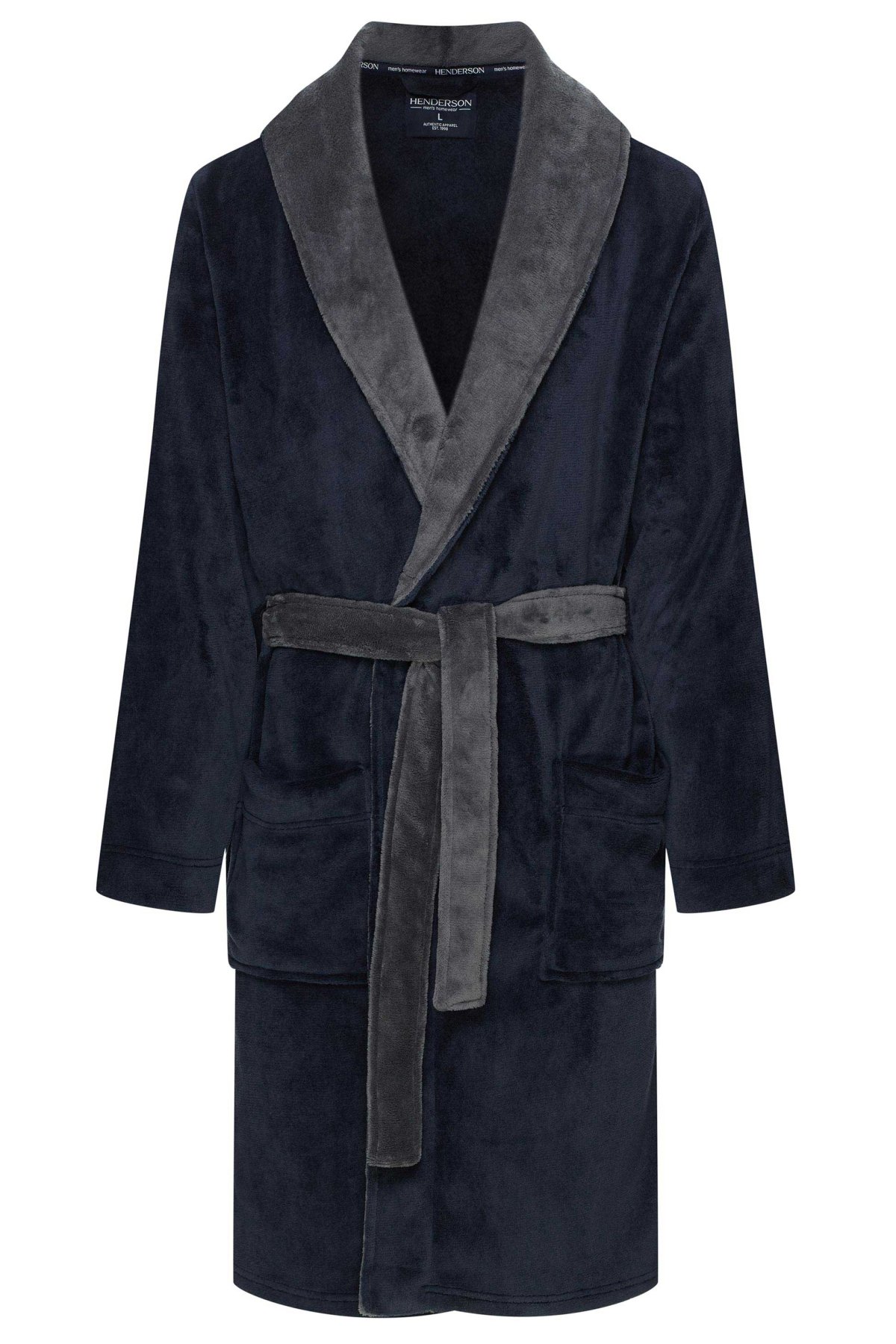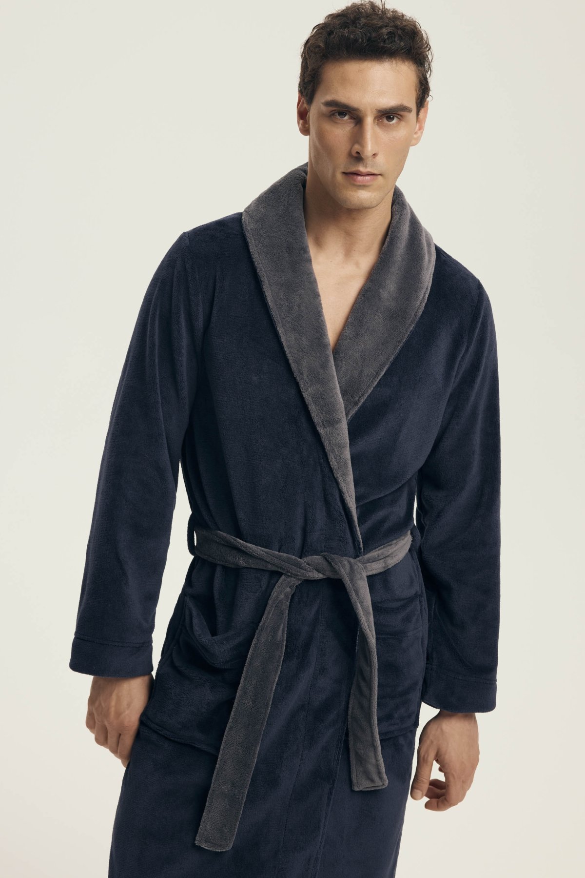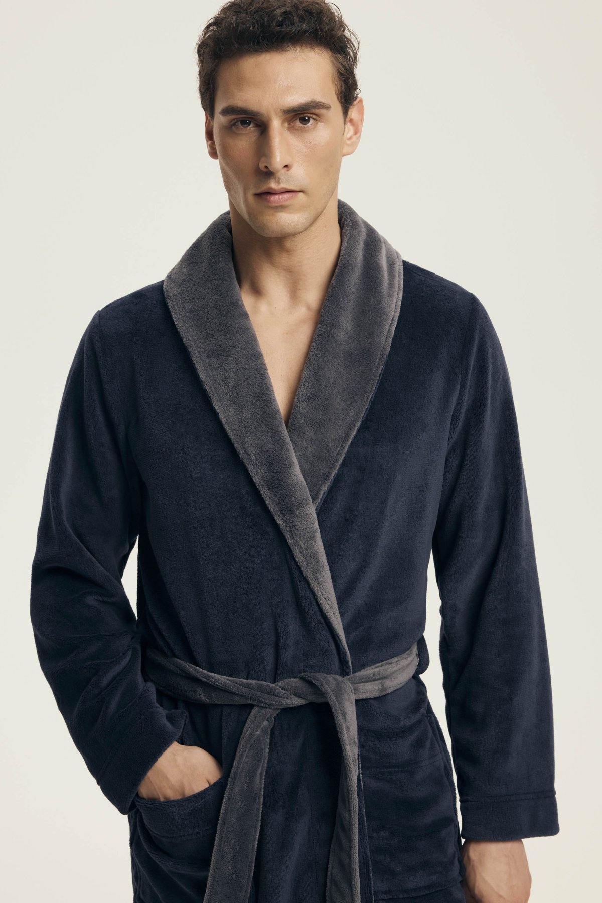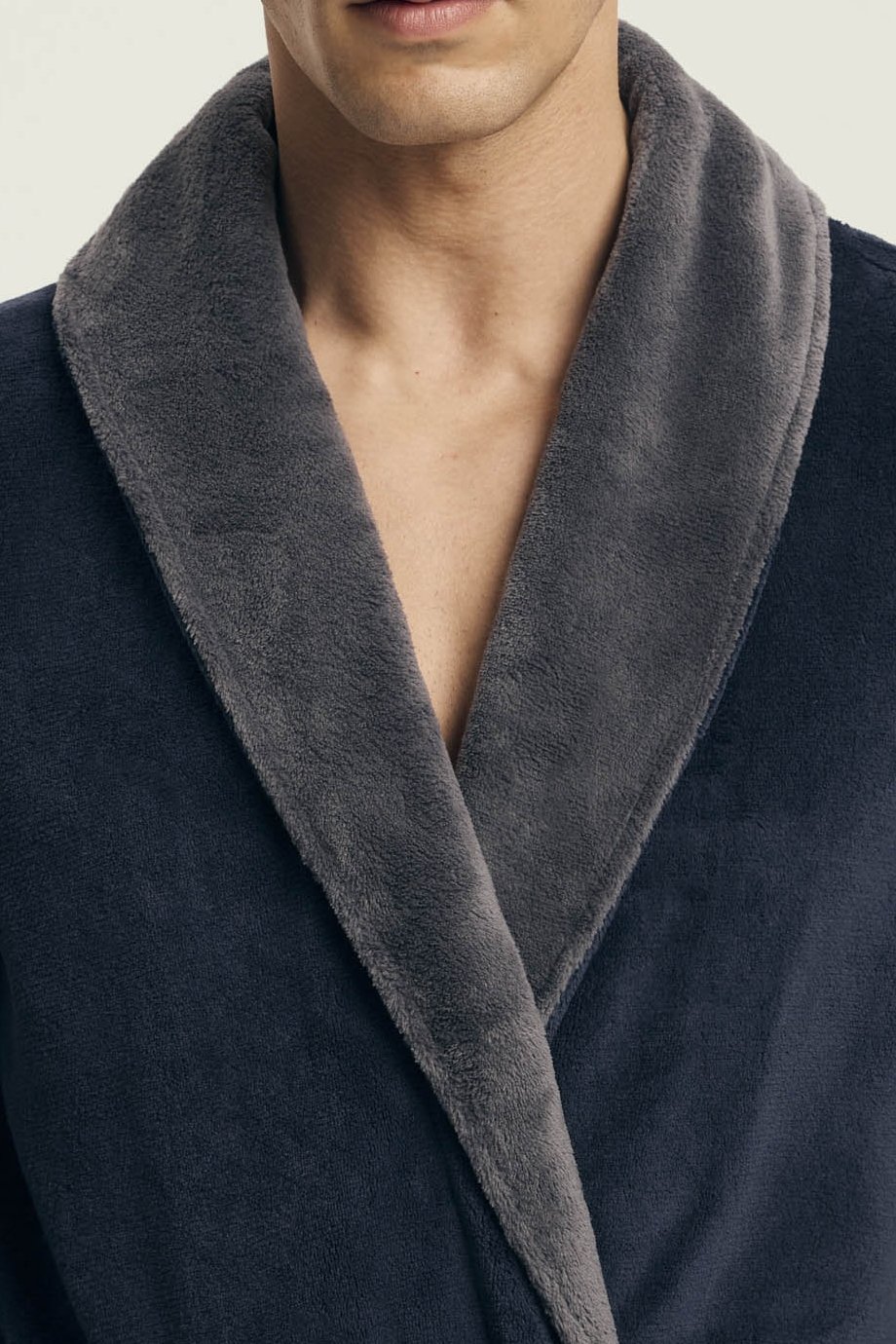 Hebký materiál poskytuje příjemné teplo, je tak ideální na chladná rána, večerní odpočinek nebo po koupeli. Kontrastní límec dodává moderní vzhled, jednoduchý střih a tmavě modrá barva působí nadčasově a stylově. Po stranách nechybí praktické kapsy, v pase pásek k zavázání.